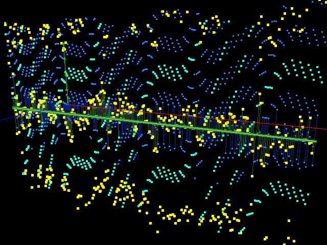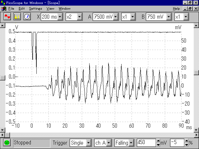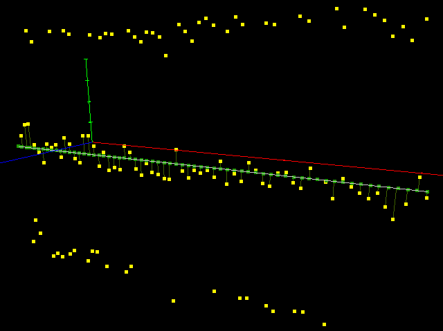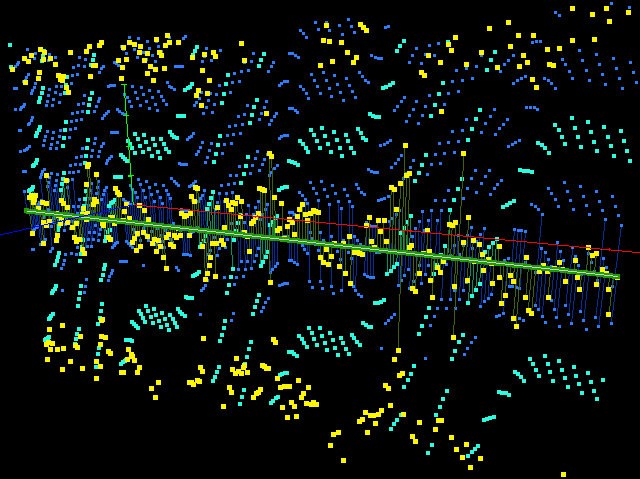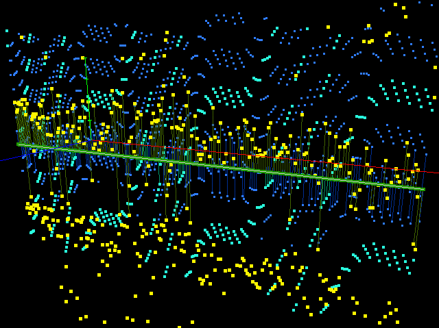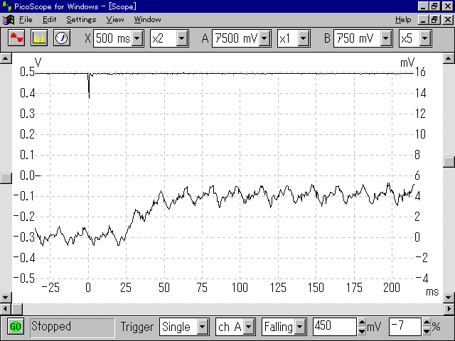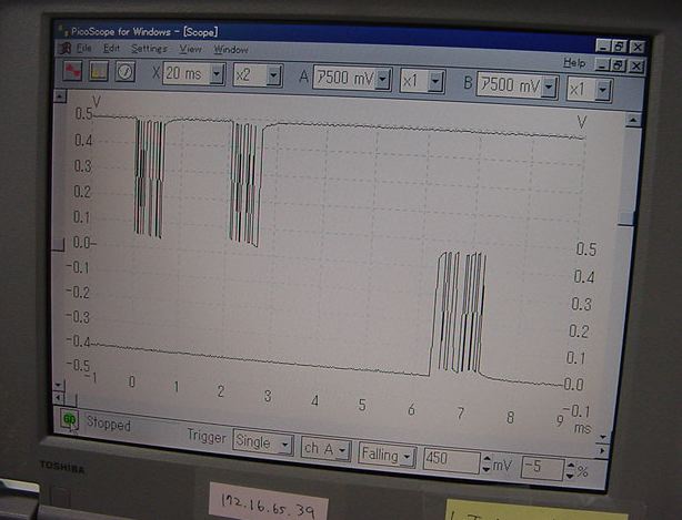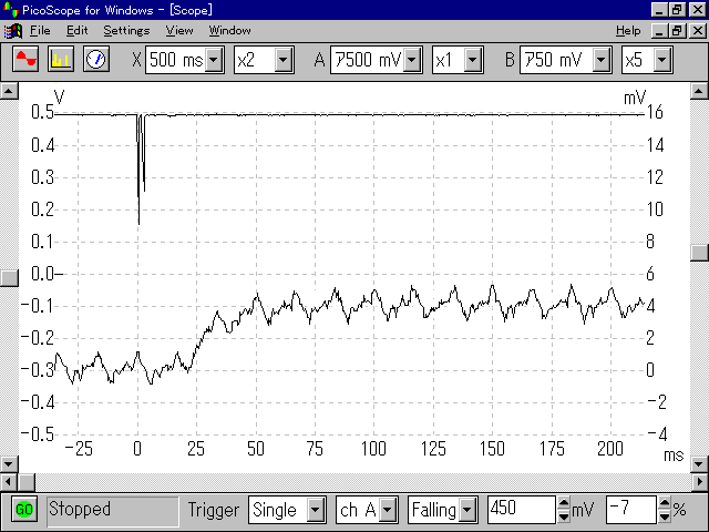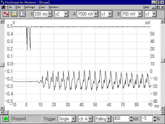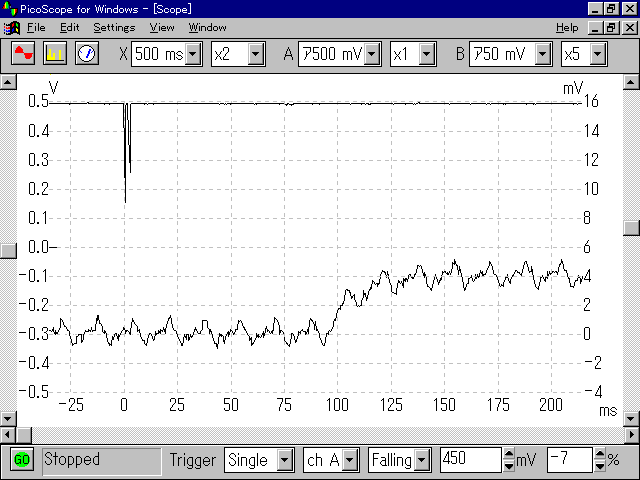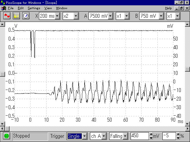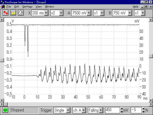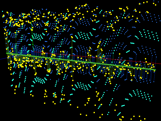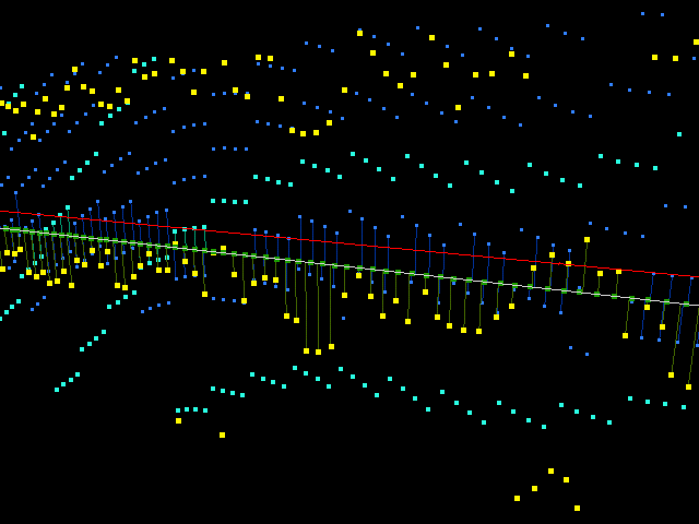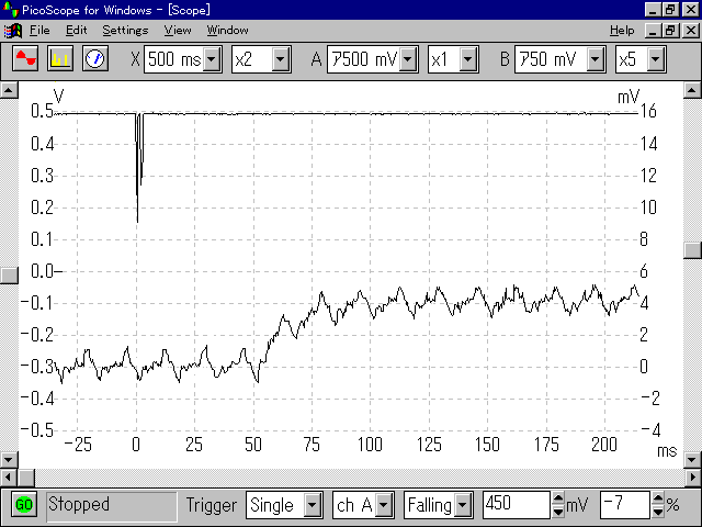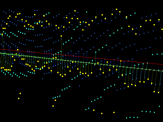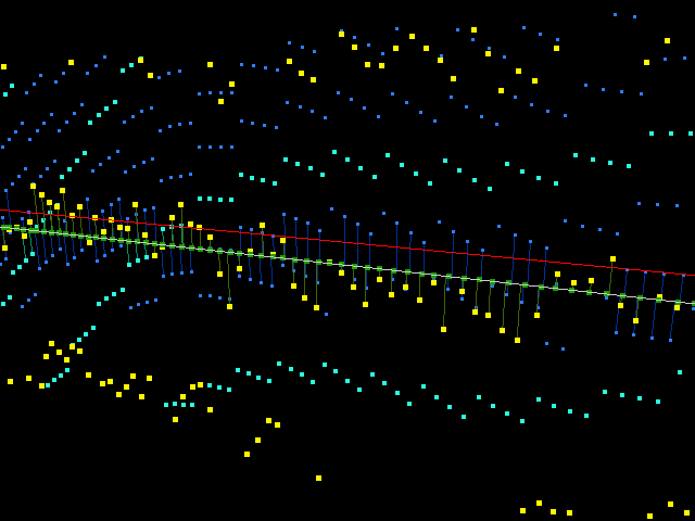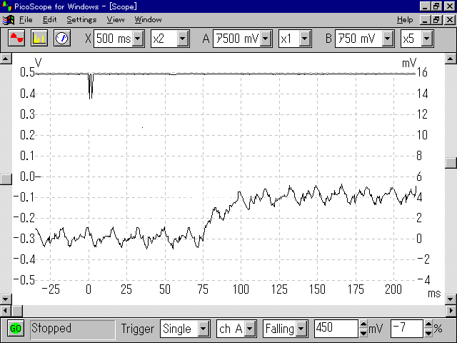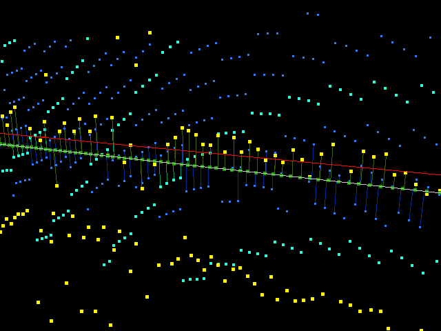 下図はこの全体図のいちばん最初の部分を、データ軸方向(X軸方向)に拡大表示した例である。 実験の冒頭はいきなり映像も音楽も始まるので、、最初のあたりは映像ビートとタッピングデータとがばらばらに離れている。