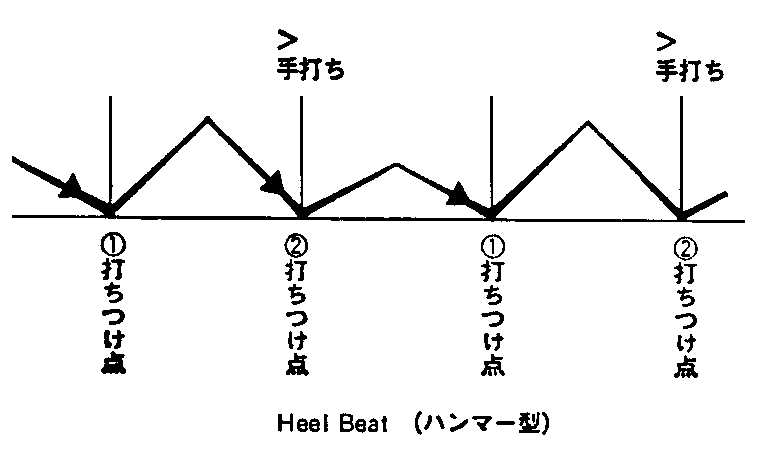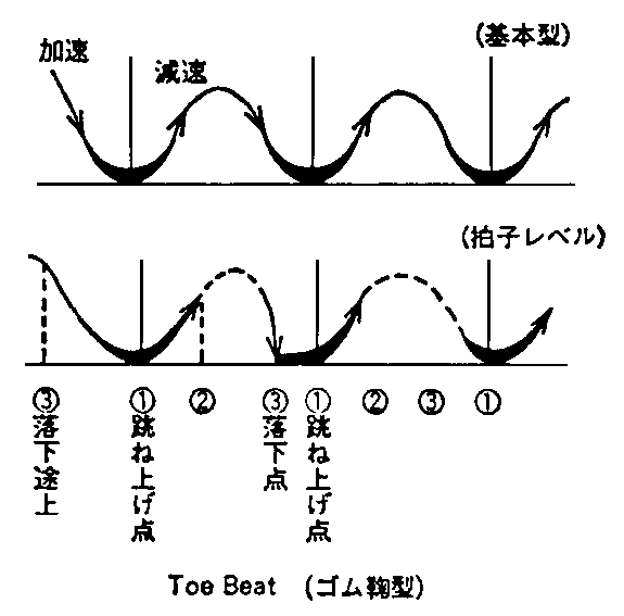そしてズレがいよいよ大きくなると、例えば音楽の表ビート(BDのビート)と同期していた映像ビートが、今度は自然に音楽の裏ビート(SDのビート)に「乗り換えて」またまた両者の同期したビートを楽しむ、という現象が起きる。 細かく見れば、さっきまで静止画としてタッピングする瞬間と一致していた音楽のビートがずれたと知覚されると、音楽の裏表の反対側のビートがこれから静止画としてタッピングす瞬間にほぼ近くなり、このずれは次第に縮まって一致してきて、さらに移動しながらノリが続く。