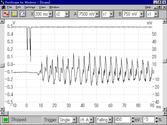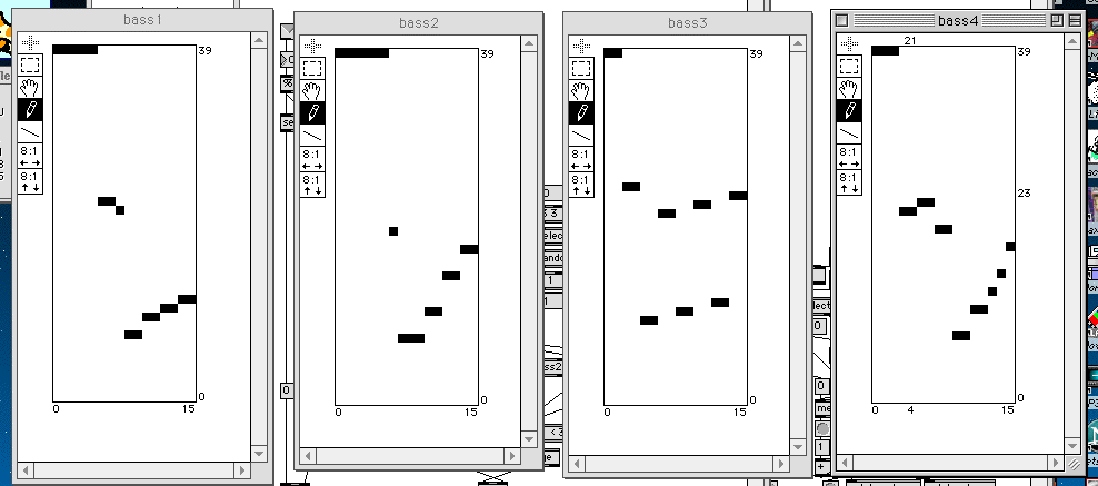 そして、下の4つの図は全体図をデータ軸方向(X軸方向)に拡大表示して、上図よりも時間的に後の状況まで平行移動したところである。 この特徴というのは、モーフィング映像素材に比べて、引き込み効果のような音楽ビートによる影響がほとんど見られないこと、そして映像ビートに対する時間的誤差が非常に小さい、という事である。 これは、被験者は瞬間的に変化する映像の連続に対して、激しく上体と脚を揺すって「映像ビートに同期したタイミング」をなかば無意識に作り出していたためであり、音楽などを聞いている余裕はない、という外見上の印象であった。 その結果、一定の傾向で映像ビートから遅れたり早まるというのでなく、身体動作というメトロノームによって、平均値がゼロである(データ軸上に並ぶ)ようなタッピングを実現したものと思われる。