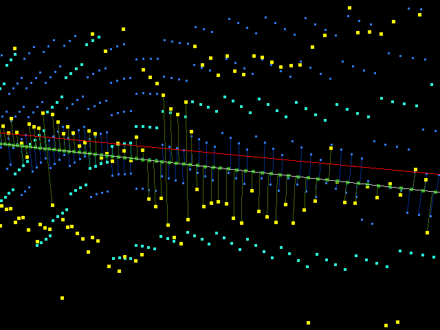 静止画の瞬時変化による映像素材の実験結果(全体)上図は、この補足実験のために特別に制作した、「静止画の瞬時変化による映像素材」を用いた実験の結果であり、同等の条件で全体を表示したものである。 まずこの全体画面をモーフィング素材の実験結果と比較して特徴的なのは、被験者のタッピングのデータであるイエローの矩形が、画面の中央のデータ軸の周囲とともに、表示エリアの上限の部分と下限の部分にもほぼ同等に出ている、という点である。 これはモーフィングの映像素材の時には見られなかった傾向であるだけでなく、実はメインの心理学実験の被験者からは、ほとんどこのようなデータは得られていないという特殊なものである。