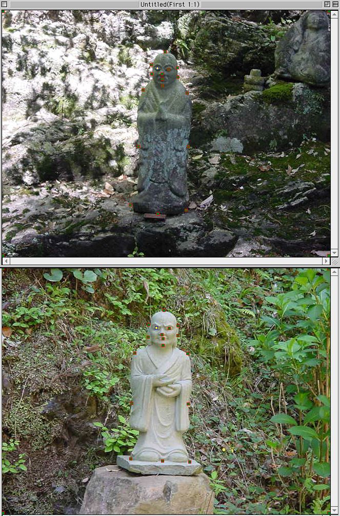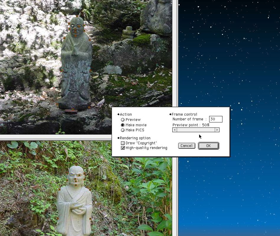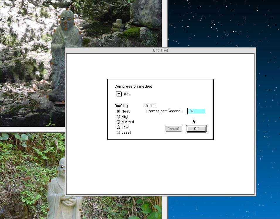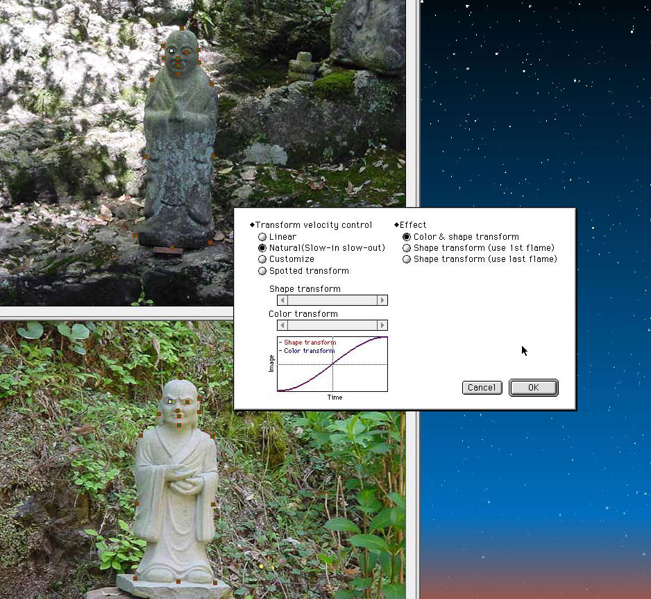 この実験では、映像ビートに相当する静止画部分にはかなり時間幅がある。 モーフィングで動いていた映像がほぼ静止した瞬間、静止画とはっきり認識した瞬間、静止画がまだ続いているという瞬間、ゆるやかにモーフィングがスタートした瞬間。