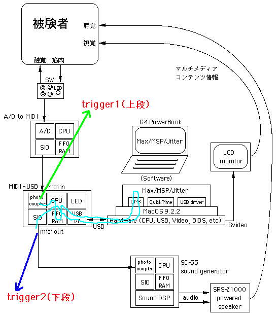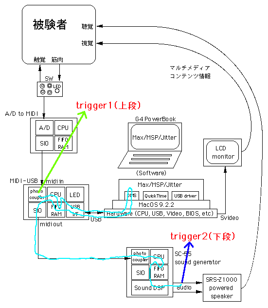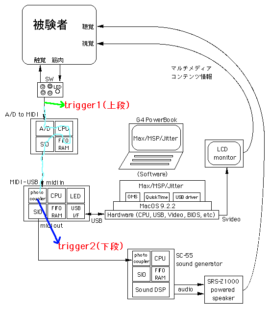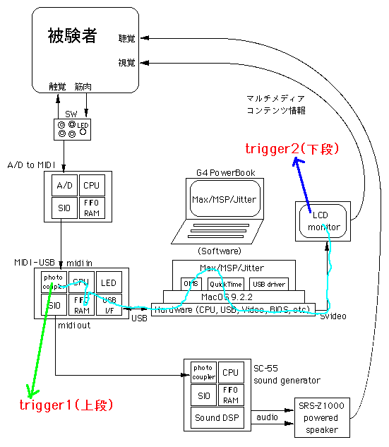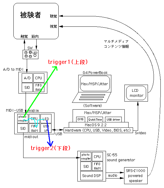 人間はリズムとともに生存/生活している。 心理学の領域では、音楽/音声などの聴覚情報、映画/ビデオなどの視覚情報、ダンス/身振りなどの身体運動情報に対して、時間的に繰り返すリズムを知覚・認知する人間の心理的メカニズムが探究されてきた。 Computer Musicと総称される音楽情報科学の領域でも、リズム・ビート・拍子などの時間的要素を対象としたテーマにおいて、聴覚情報はもちろんのこと、視覚情報や身体運動情報と一体となったマルチメディア情報・マルチモーダル情報が研究の対象となってきた。 ([1]-[65])本研究では、聴覚的情報と視覚的情報を同時に視聴するマルチメディアコンテンツの感覚間調和intersensory harmonyに関して、新たな視点でビートを「周期的に繰り返しリズムのノリが知覚されるアクセント部分」と再定義した。その上で、音楽的ビートが映像的ビートの知覚に及ぼす局所的な「引き込み効果」を提唱し、これを解析・検証するための新しい実験システムをデザインし、被験者テストによる実験・評価を行った。また音楽情報科学の視点から、コンピュータを用いた音楽心理学/知覚認知心理学の実験で重要となる、実験システムのレイテンシ(遅延)についても詳細に検討・考察した。
