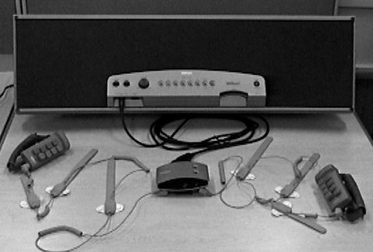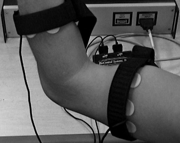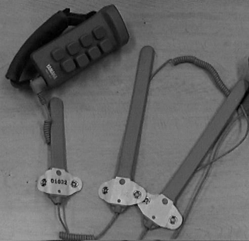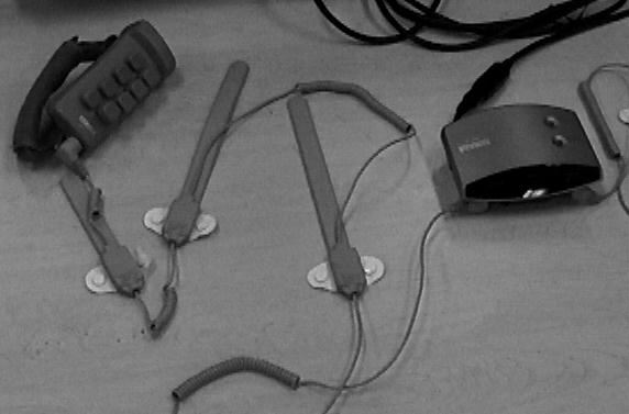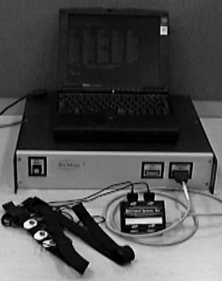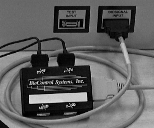 の「パッチボックス」と呼ばれるセンサ中継ボックスに、2本の筋電