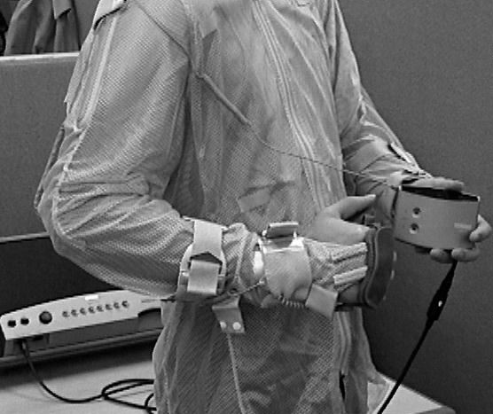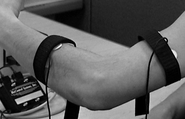 このBioMuseの筋電センサバンドを腕に取り付けた様子が