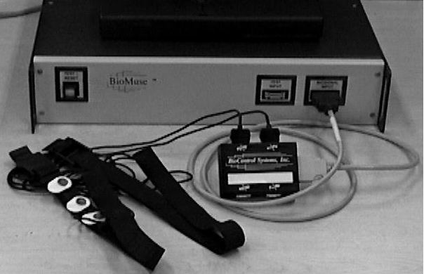 センサバンドを取り付けている。BioMuseではこの他に、脳波バンドや