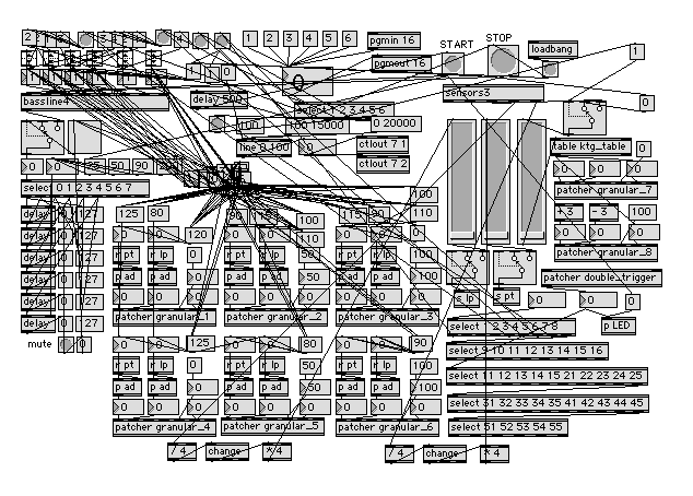 自作衝撃MIDIセンサにより検出され、Max経由で音楽の全体を駆動(シーン推移)しました。