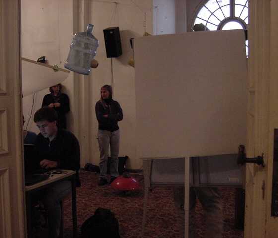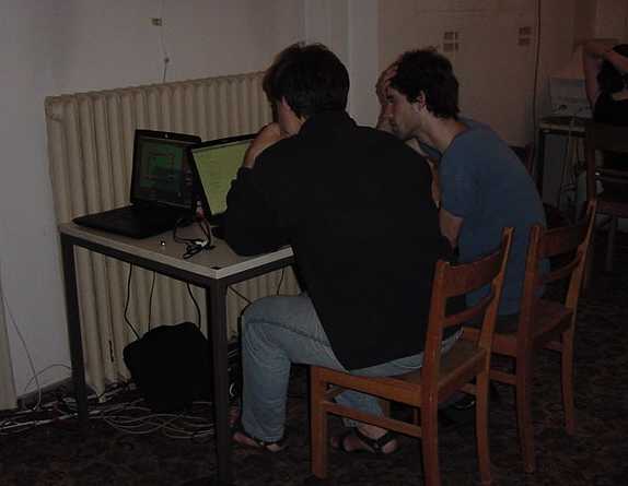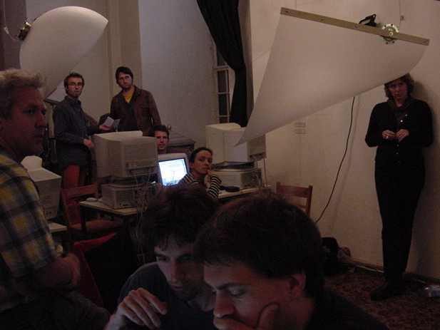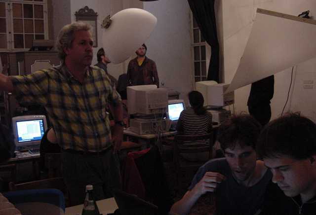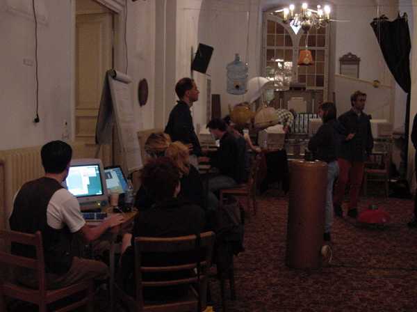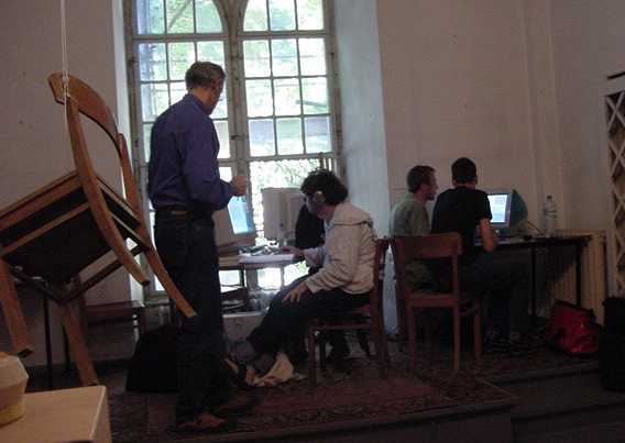 この日はまずWorkshop会場に顔を出したあと、怒涛の画像アップ 440枚FTPに2時間以上かかり(^_^;)、午後1時から夕方7時過ぎまで、 ずっと会場でセッティングに明け暮れました。なんせ10台以上の 各種Macに、まだまともに入っていなかったNetscapeとMax/MSPと OMSとを正しくインストールして、さらに僕の提供するサンプルを 転送して正しく動かす、というのは、テクニカルスタッフと二人がかり でもそれだけかかります。 よっと写真はごく少数、その準備作業の前に撮った、この日の Project Workshopの模様だけです。(^_^;)