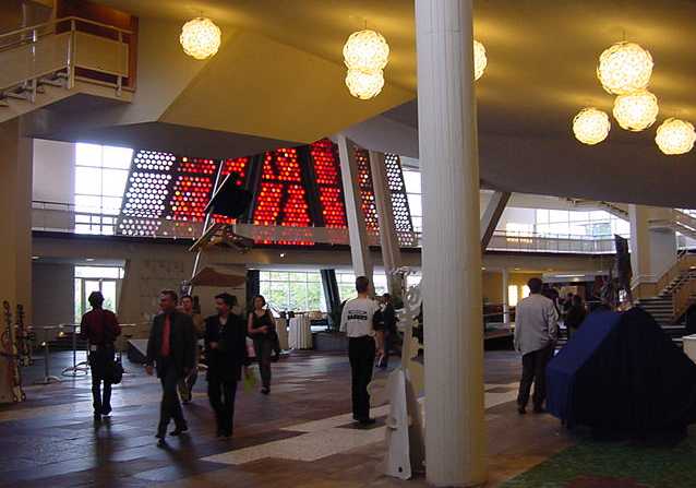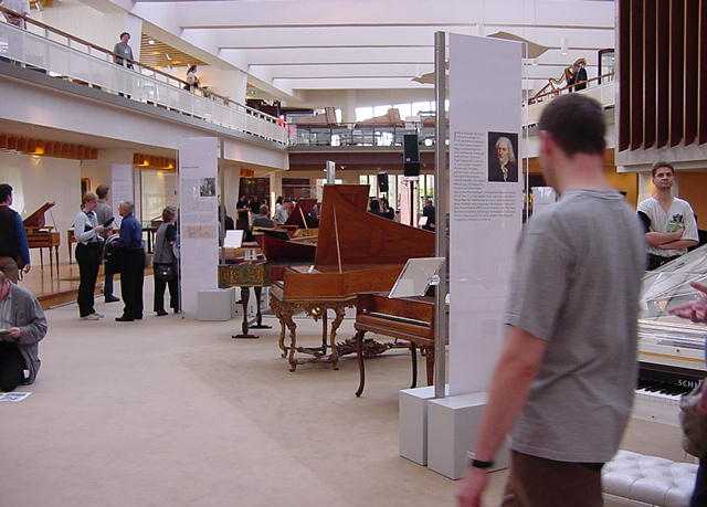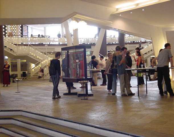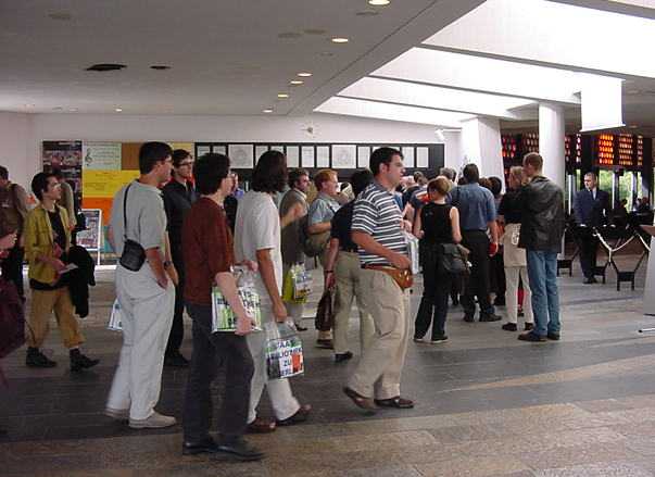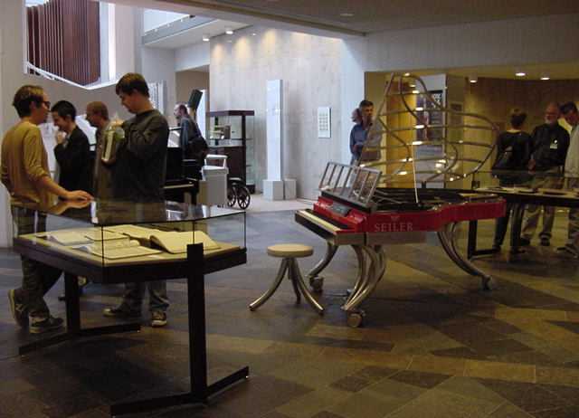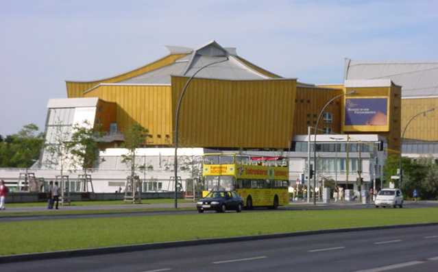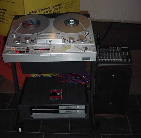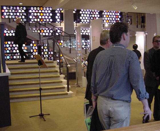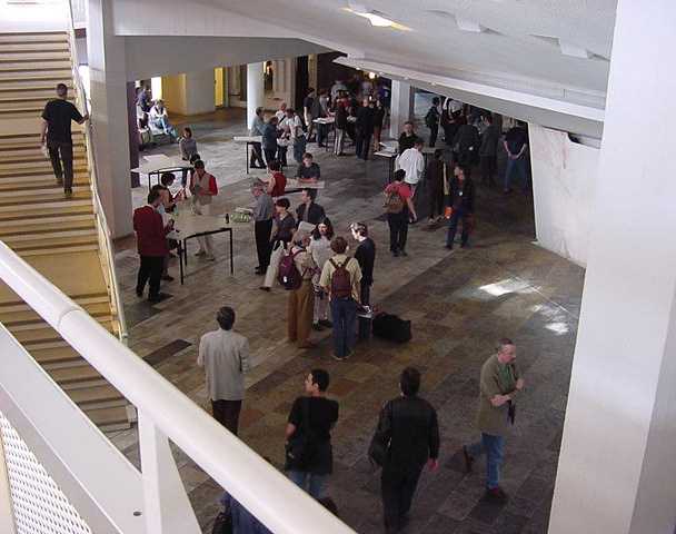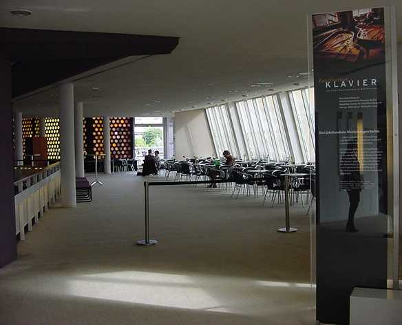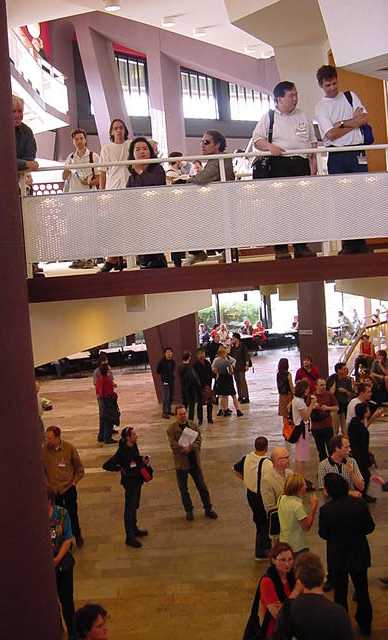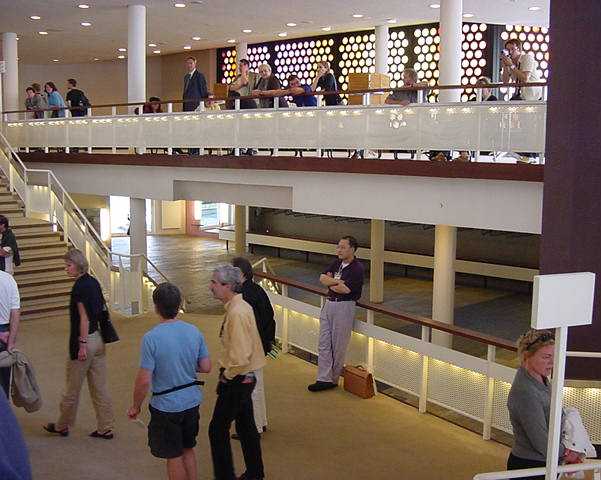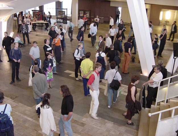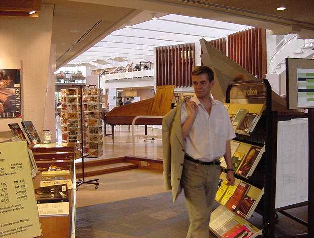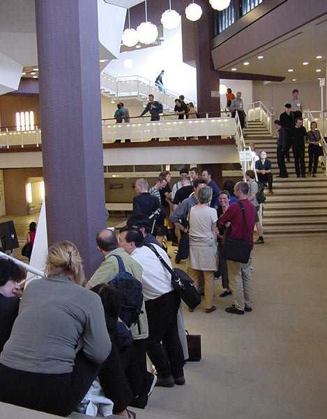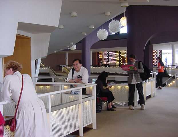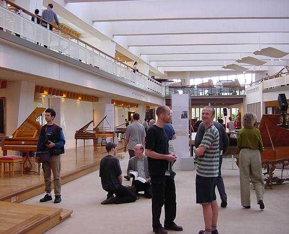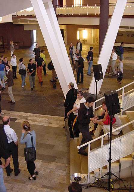 無事にWorkshopが終わった、という上記の部分(100枚以上の 写真の手作業編集(^_^;))を終えて、レジストレーションの ために国立図書館の受付に向かいました。ところが初日と いうことでいろいろ雑然としていて、ネットワーク接続は できませんでした。Zannosさんが明日にはAuthor Roomで できるよ(専用IPを教えるよ)、と言ってくれましたがどうなるか これを書いている時点では不明です。いよいよメイルのアクセスも dailyとはいかなくなってきました(^_^;)。 そして、Opening Concert会場のフィルハーモニーに 向かいました。ベルリンフィルの総本山でコンサートとは 豪勢だなぁ、と思ったら、ホワイエを使っただけでした。 説明すると長くなるのですが、広大なホワイエにあちこちに50台 のテープレコーダーとアンプ、そしてはるか奥に連なっている 鍵盤楽器ホールと楽器博物館(浜松のもあっさり負けますね)の あちこちでストップウォッチを持ったチェンバロ奏者の演奏と そのPAを交えた巨大なジョンケージの空間音響作品の「演奏」でした。 正確に1時間、続きました。(^_^;)