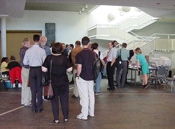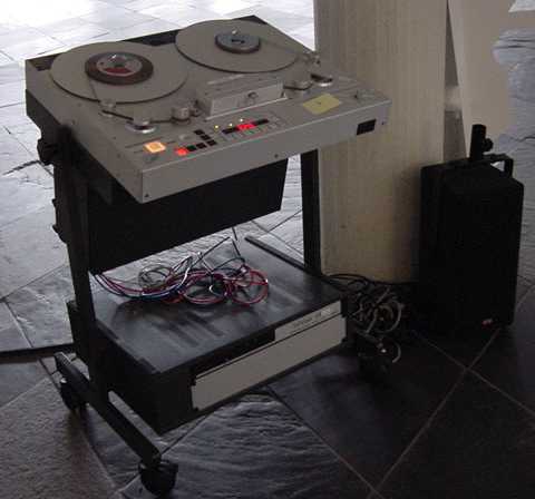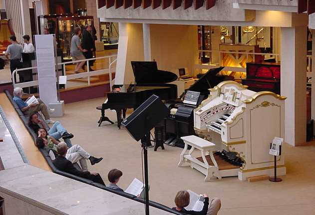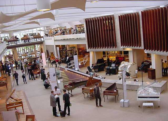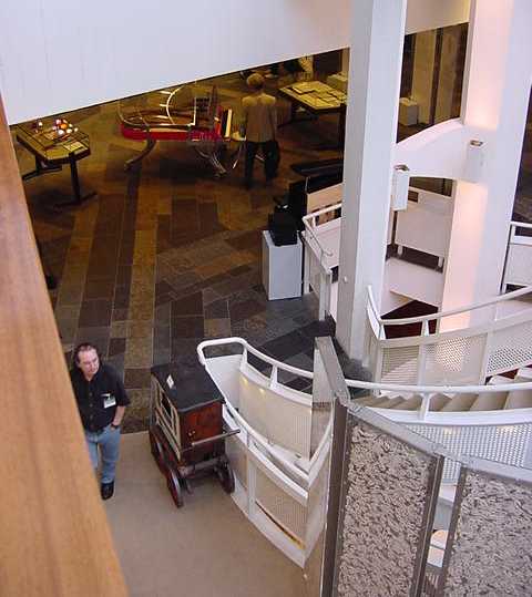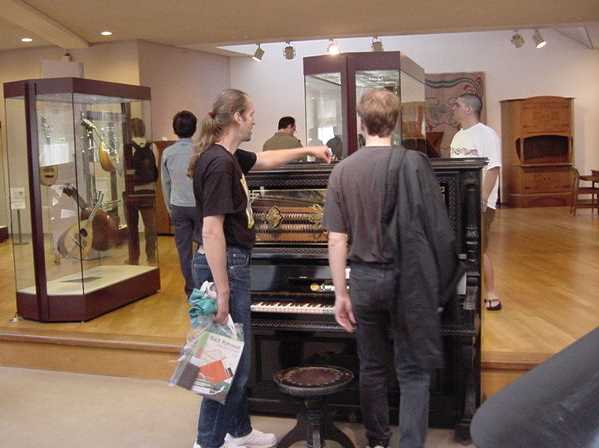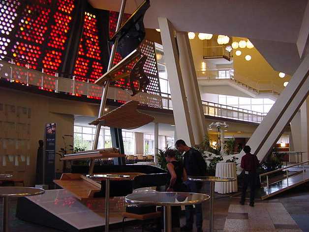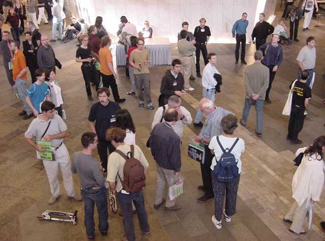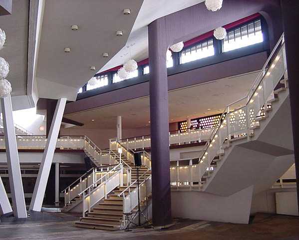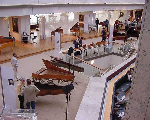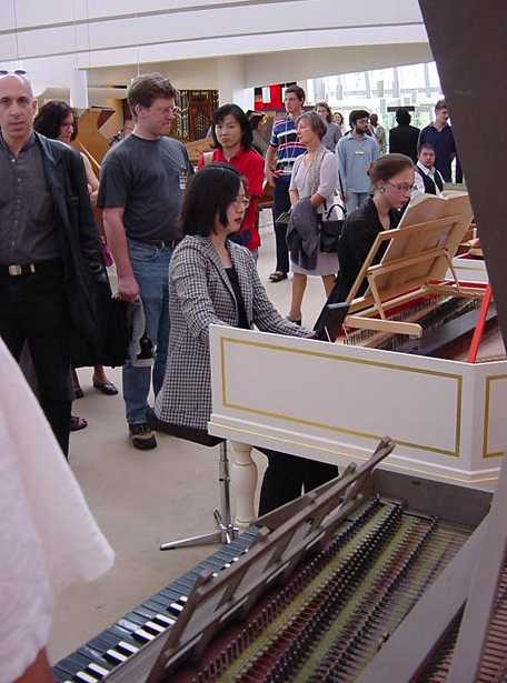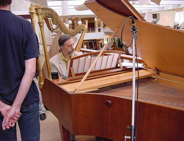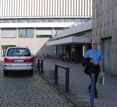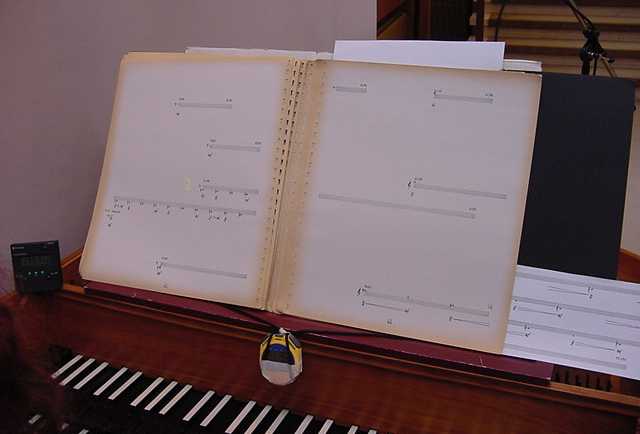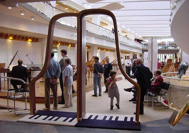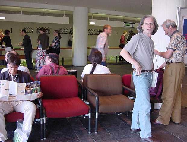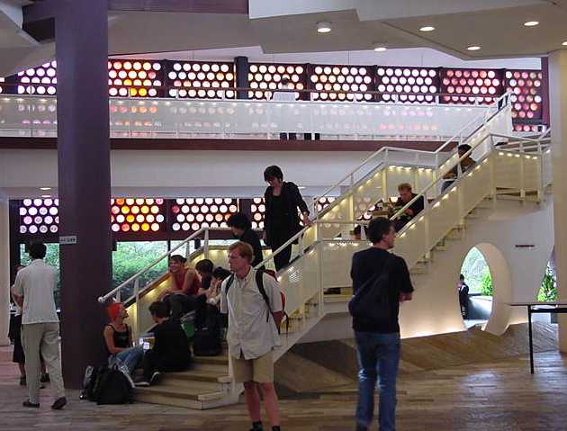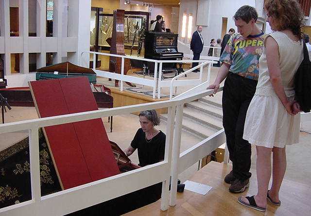 無事にWorkshopが終わった、という上記の部分(100枚以上の 写真の手作業編集(^_^;))を終えて、レジストレーションの ために国立図書館の受付に向かいました。ところが初日と いうことでいろいろ雑然としていて、ネットワーク接続は できませんでした。Zannosさんが明日にはAuthor Roomで できるよ(専用IPを教えるよ)、と言ってくれましたがどうなるか これを書いている時点では不明です。いよいよメイルのアクセスも dailyとはいかなくなってきました(^_^;)。 そして、Opening Concert会場のフィルハーモニーに 向かいました。ベルリンフィルの総本山でコンサートとは 豪勢だなぁ、と思ったら、ホワイエを使っただけでした。 説明すると長くなるのですが、広大なホワイエにあちこちに50台 のテープレコーダーとアンプ、そしてはるか奥に連なっている 鍵盤楽器ホールと楽器博物館(浜松のもあっさり負けますね)の あちこちでストップウォッチを持ったチェンバロ奏者の演奏と そのPAを交えた巨大なジョンケージの空間音響作品の「演奏」でした。 正確に1時間、続きました。(^_^;)