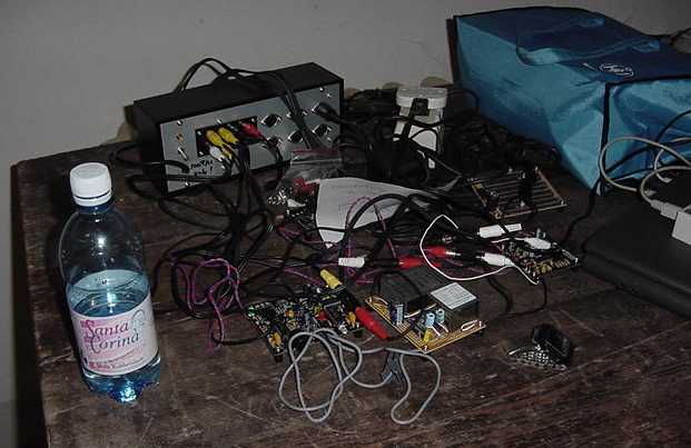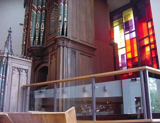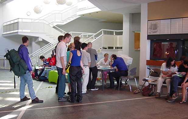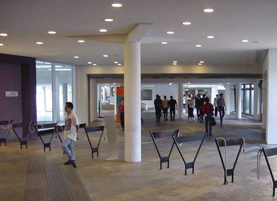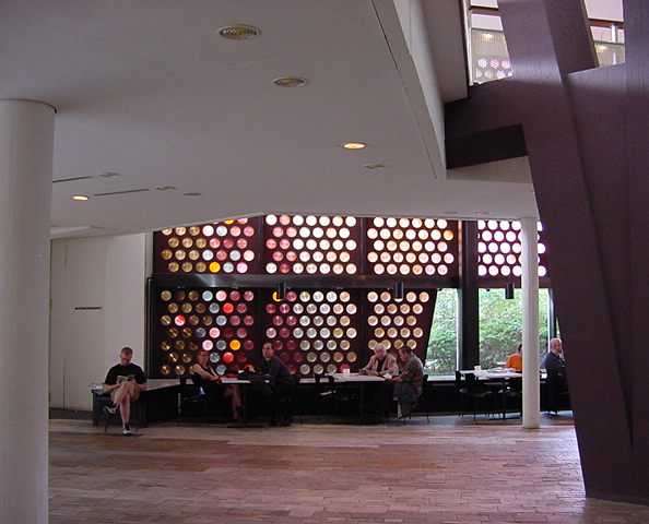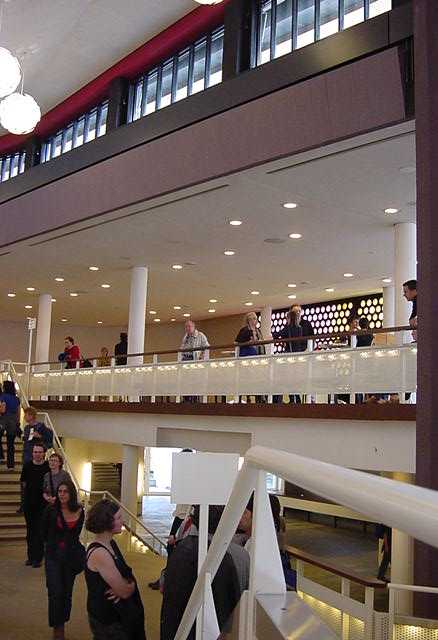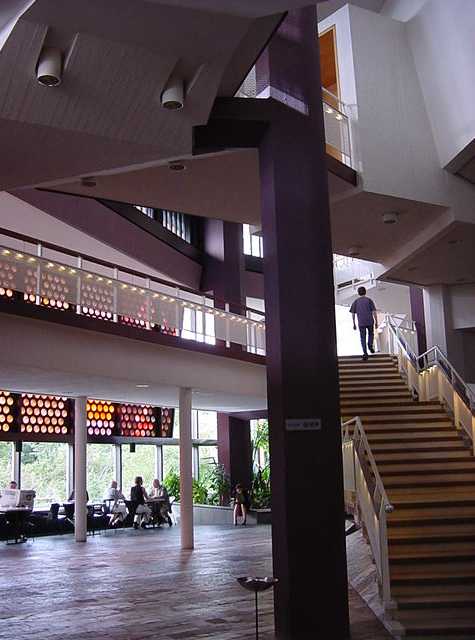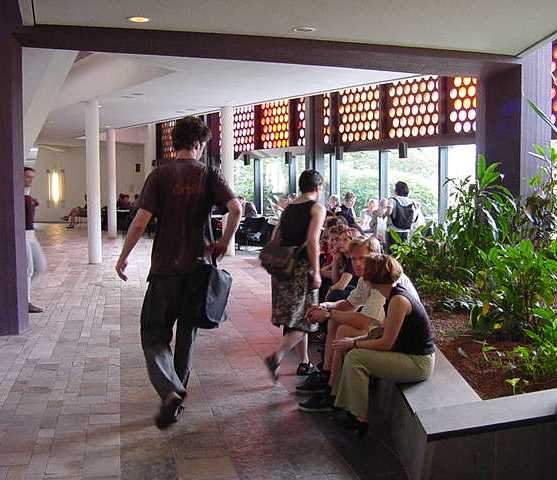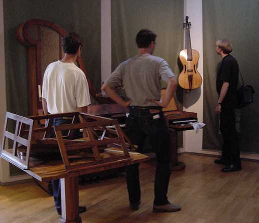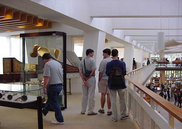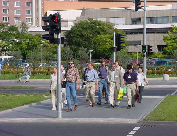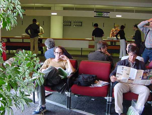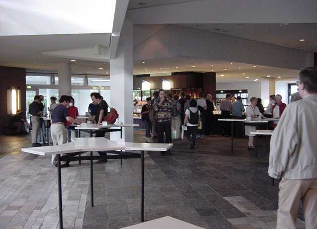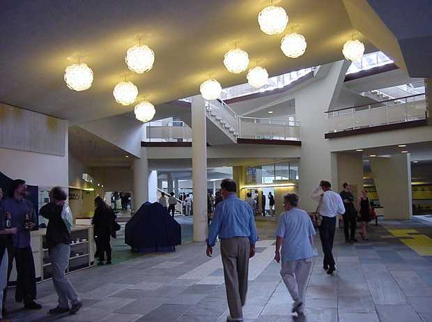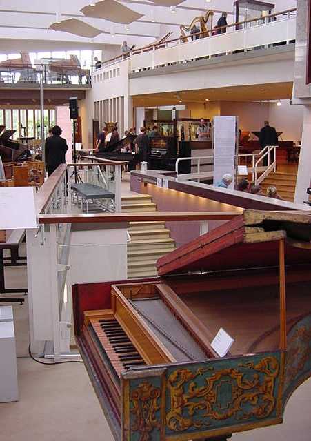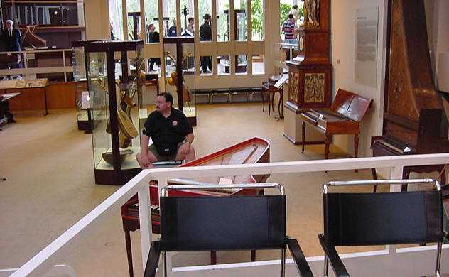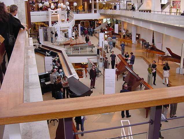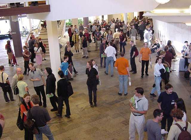 無事にWorkshopが終わった、という上記の部分(100枚以上の 写真の手作業編集(^_^;))を終えて、レジストレーションの ために国立図書館の受付に向かいました。ところが初日と いうことでいろいろ雑然としていて、ネットワーク接続は できませんでした。Zannosさんが明日にはAuthor Roomで できるよ(専用IPを教えるよ)、と言ってくれましたがどうなるか これを書いている時点では不明です。いよいよメイルのアクセスも dailyとはいかなくなってきました(^_^;)。 そして、Opening Concert会場のフィルハーモニーに 向かいました。ベルリンフィルの総本山でコンサートとは 豪勢だなぁ、と思ったら、ホワイエを使っただけでした。 説明すると長くなるのですが、広大なホワイエにあちこちに50台 のテープレコーダーとアンプ、そしてはるか奥に連なっている 鍵盤楽器ホールと楽器博物館(浜松のもあっさり負けますね)の あちこちでストップウォッチを持ったチェンバロ奏者の演奏と そのPAを交えた巨大なジョンケージの空間音響作品の「演奏」でした。 正確に1時間、続きました。(^_^;)