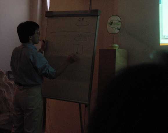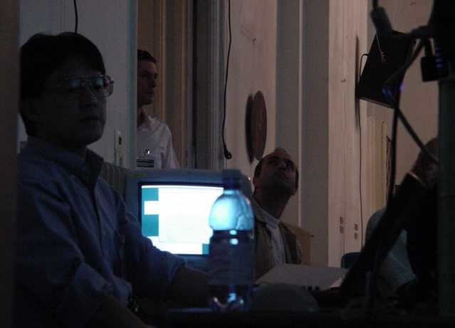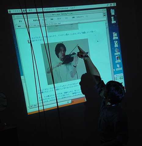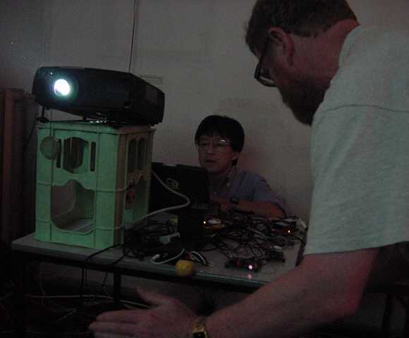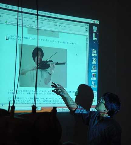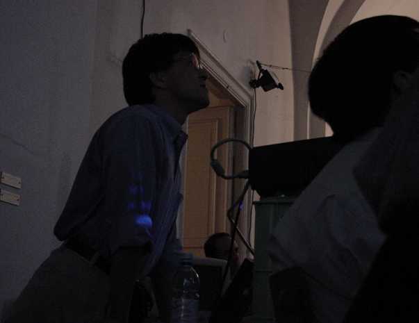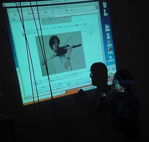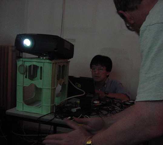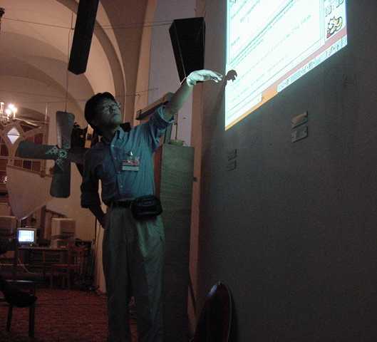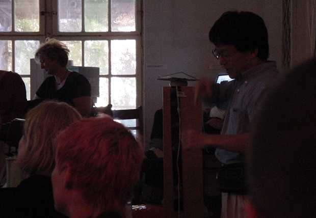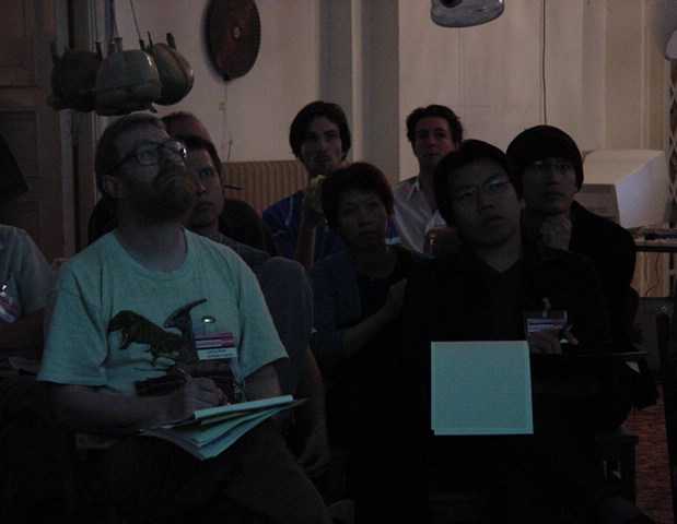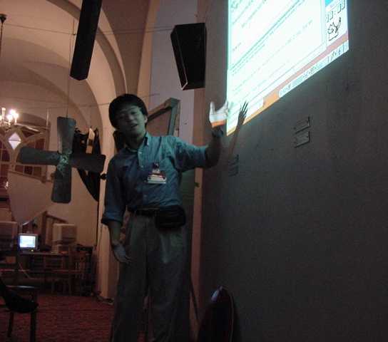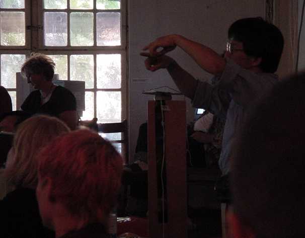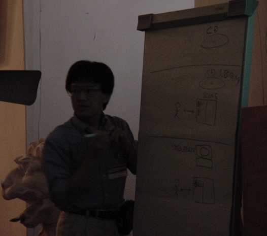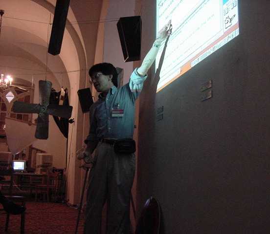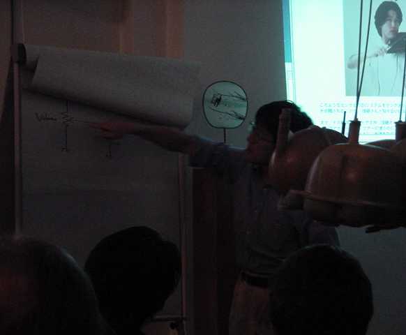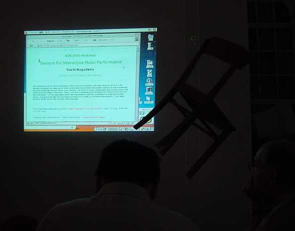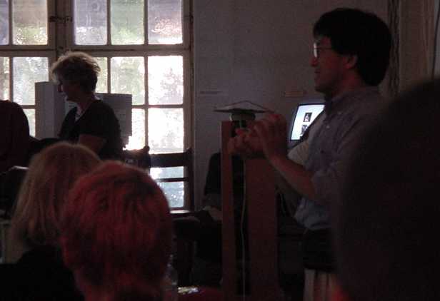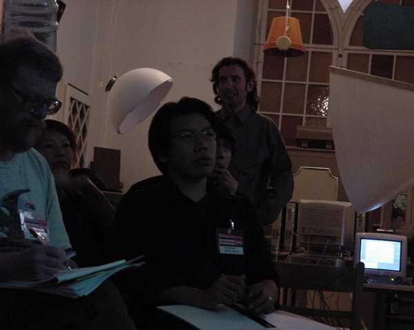 そしてついに、ICMCでWorkshopのリーダーとして30名近い来場者を相手に マルマル3時間もLectureを行う、という本番がやってきました。実はこの データをアップロードするということは、無事に終わって一人で自分を誉めて 乾杯した後なのですが(^_^;)、なんとかうまくいきました(^_^)。 以下の写真は、テクニカルスタッフのジュリアンに「とにかく撮りまくって」 と頼んだものの中でちゃんと撮れているものです。雰囲気が伝わるでしょうか。