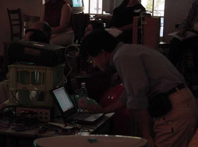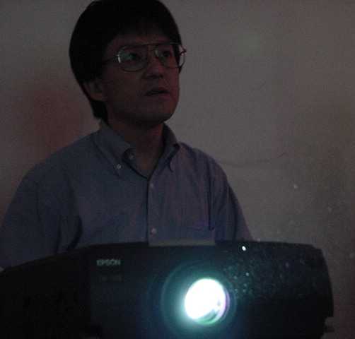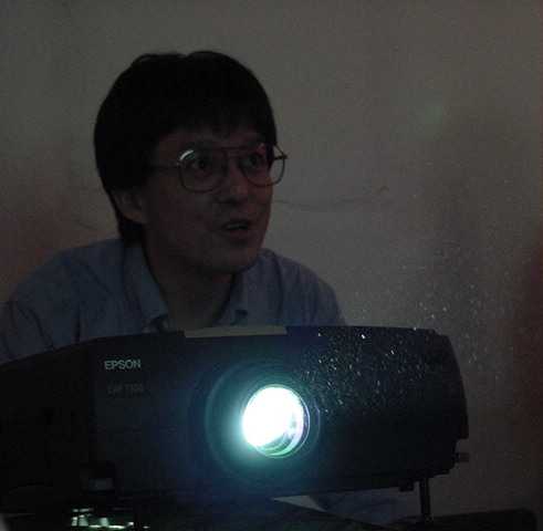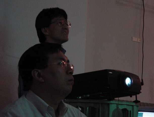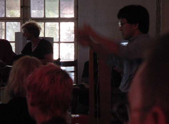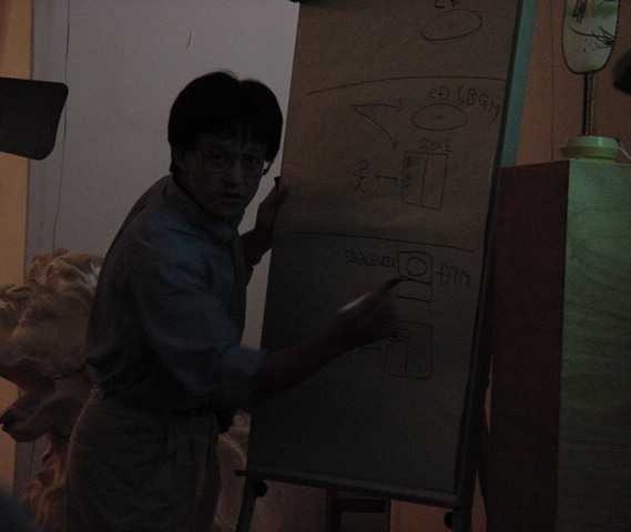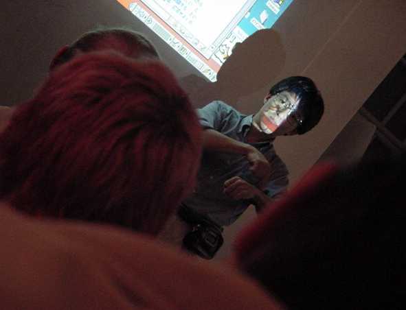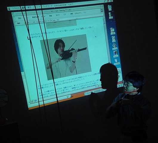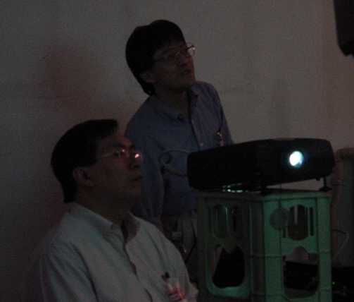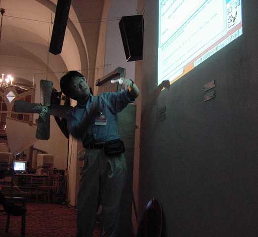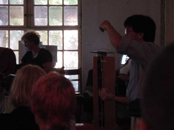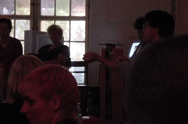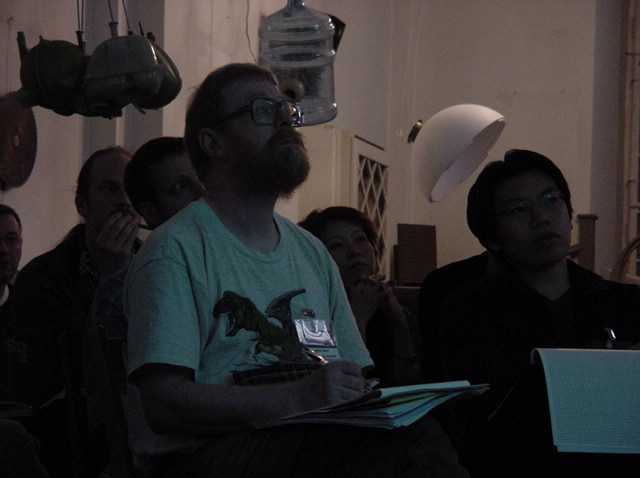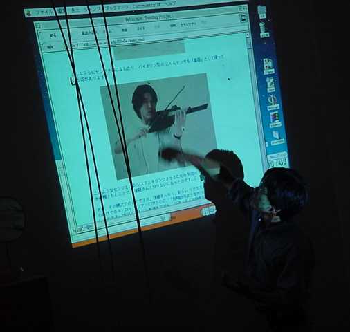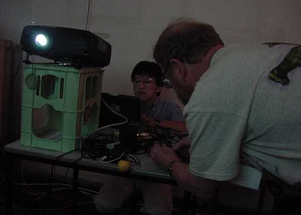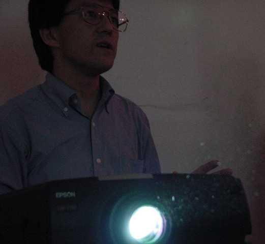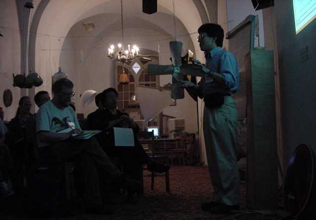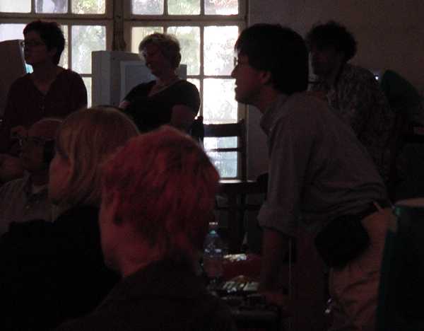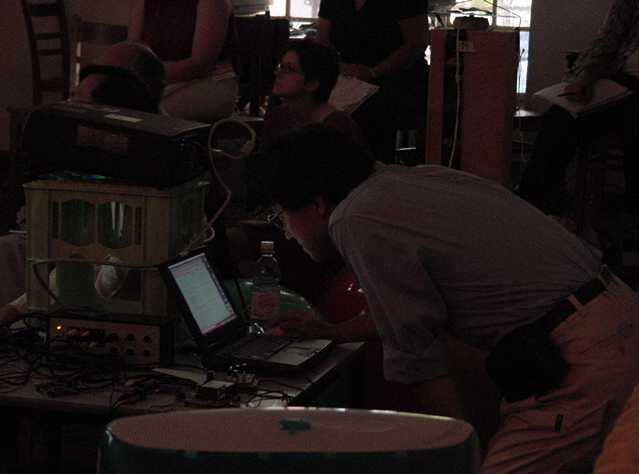そしてついに、ICMCでWorkshopのリーダーとして30名近い来場者を相手に マルマル3時間もLectureを行う、という本番がやってきました。実はこの データをアップロードするということは、無事に終わって一人で自分を誉めて 乾杯した後なのですが(^_^;)、なんとかうまくいきました(^_^)。 以下の写真は、テクニカルスタッフのジュリアンに「とにかく撮りまくって」 と頼んだものの中でちゃんと撮れているものです。雰囲気が伝わるでしょうか。