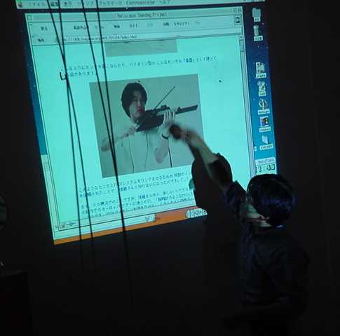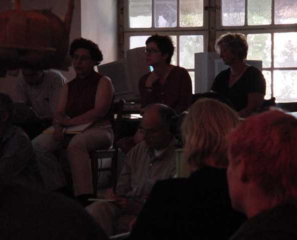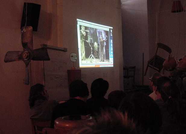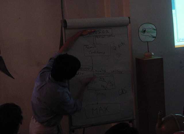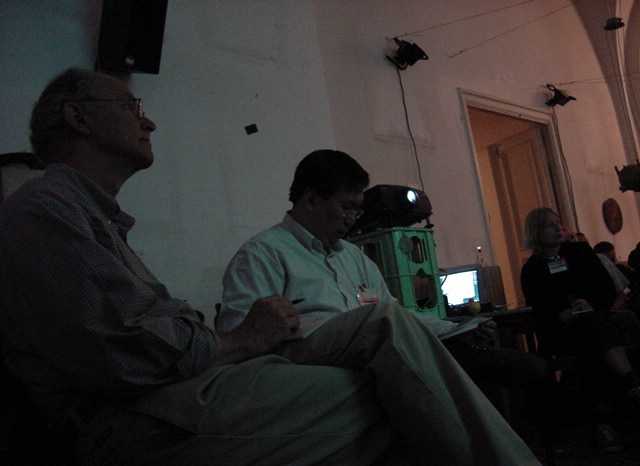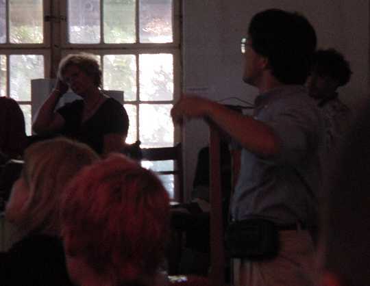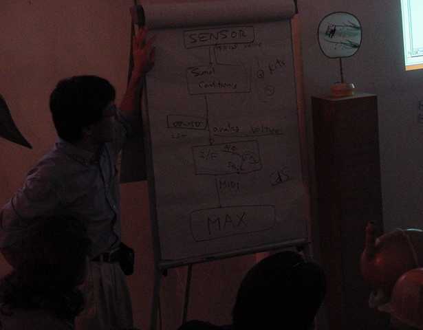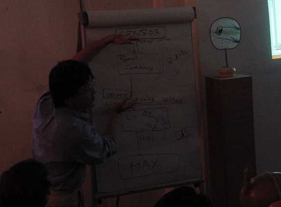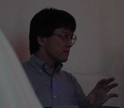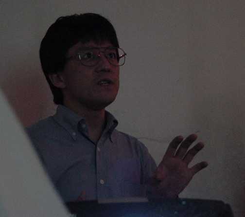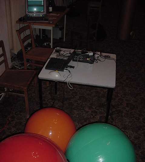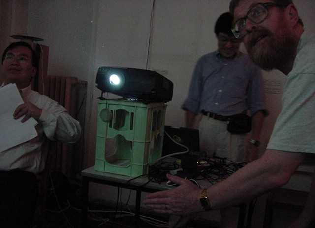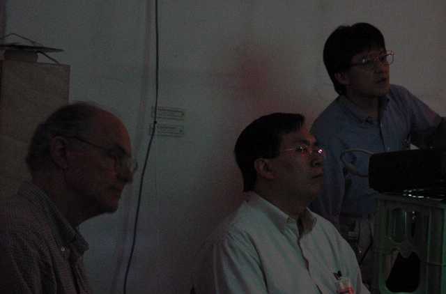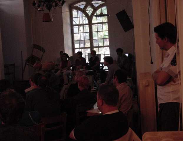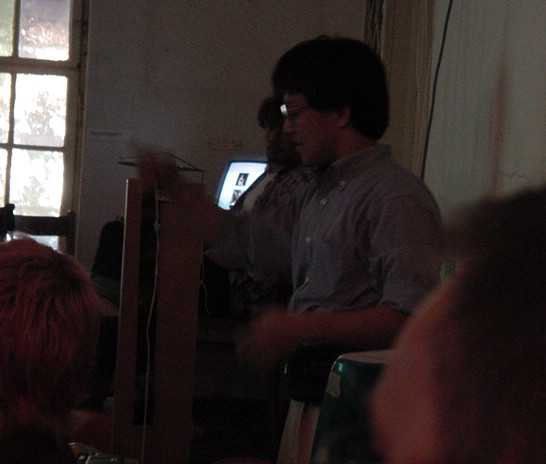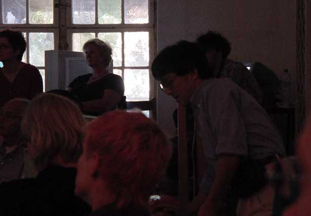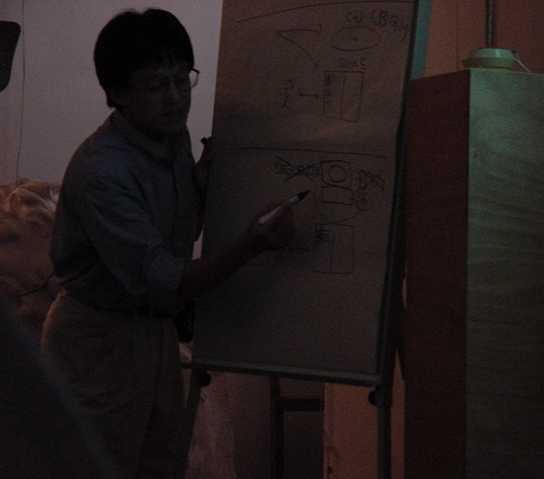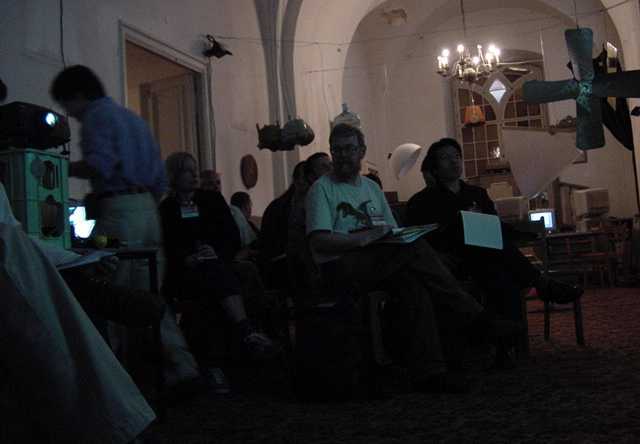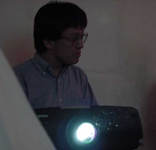 そしてついに、ICMCでWorkshopのリーダーとして30名近い来場者を相手に マルマル3時間もLectureを行う、という本番がやってきました。実はこの データをアップロードするということは、無事に終わって一人で自分を誉めて 乾杯した後なのですが(^_^;)、なんとかうまくいきました(^_^)。 以下の写真は、テクニカルスタッフのジュリアンに「とにかく撮りまくって」 と頼んだものの中でちゃんと撮れているものです。雰囲気が伝わるでしょうか。