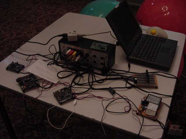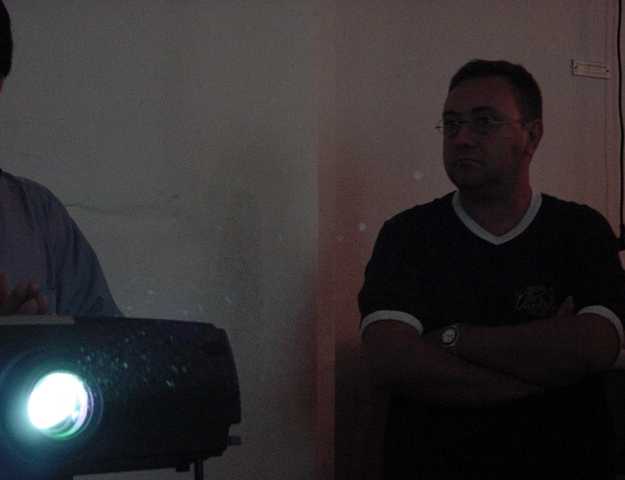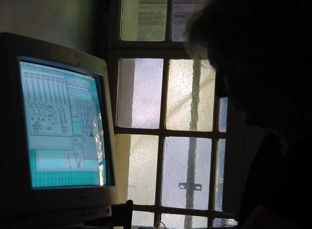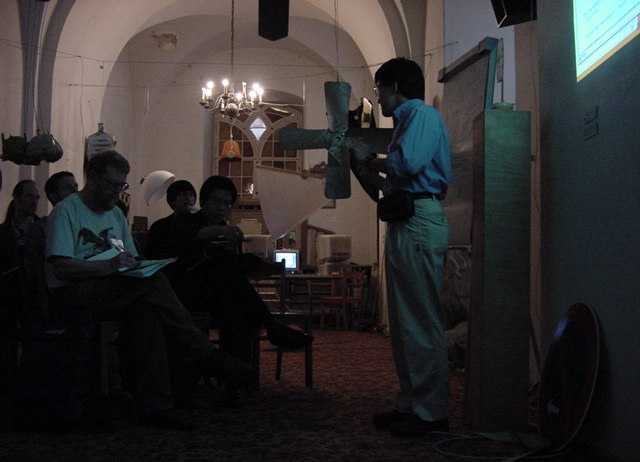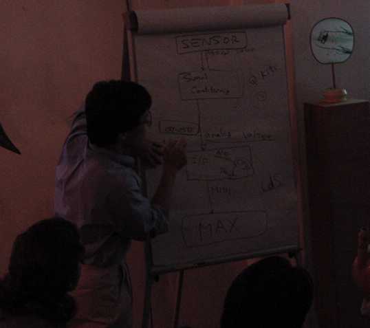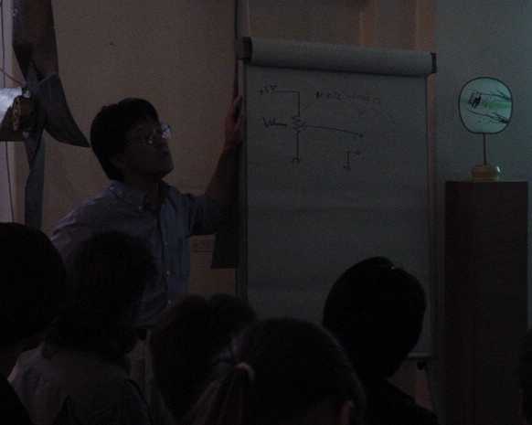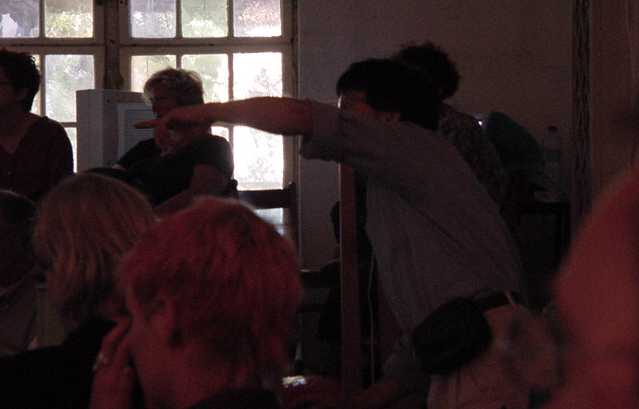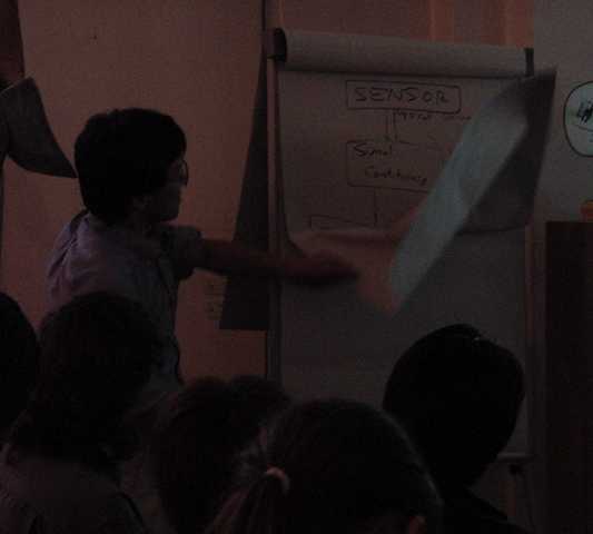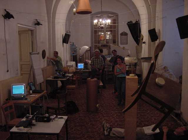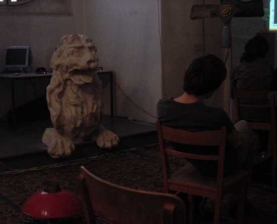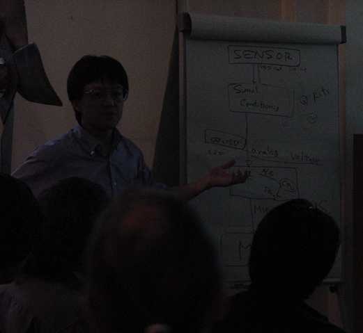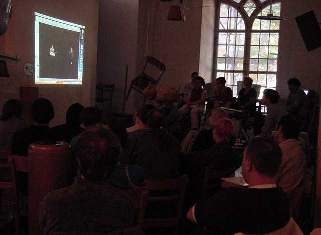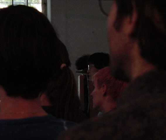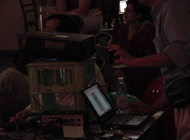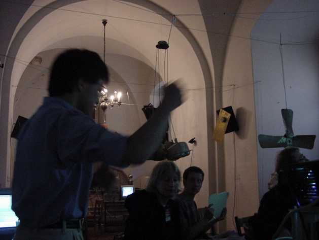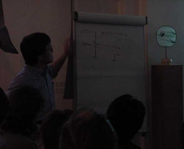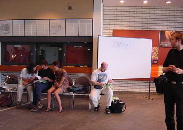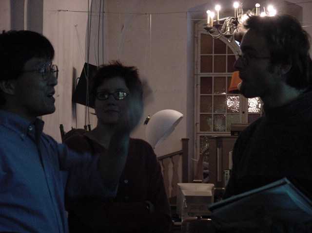 そしてついに、ICMCでWorkshopのリーダーとして30名近い来場者を相手に マルマル3時間もLectureを行う、という本番がやってきました。実はこの データをアップロードするということは、無事に終わって一人で自分を誉めて 乾杯した後なのですが(^_^;)、なんとかうまくいきました(^_^)。 以下の写真は、テクニカルスタッフのジュリアンに「とにかく撮りまくって」 と頼んだものの中でちゃんと撮れているものです。雰囲気が伝わるでしょうか。