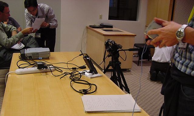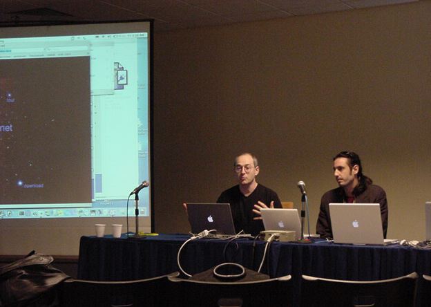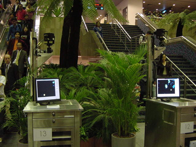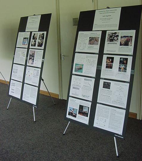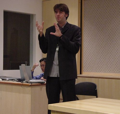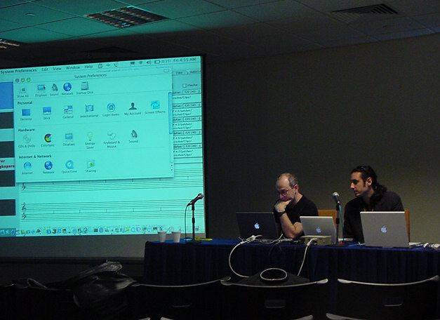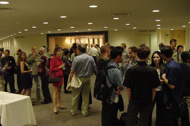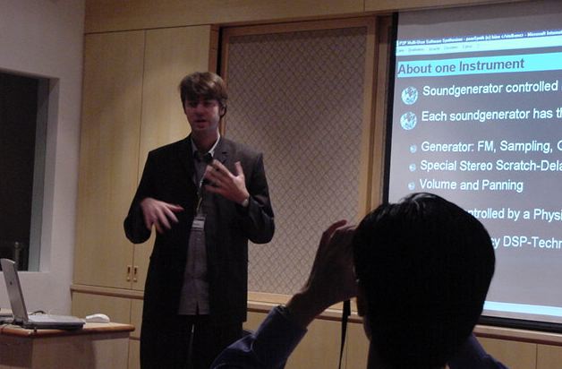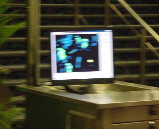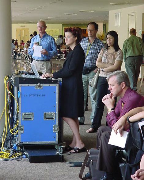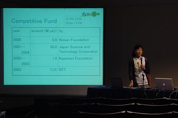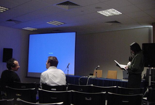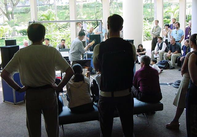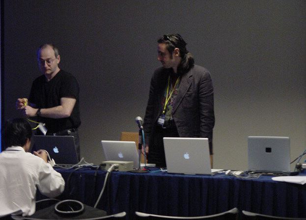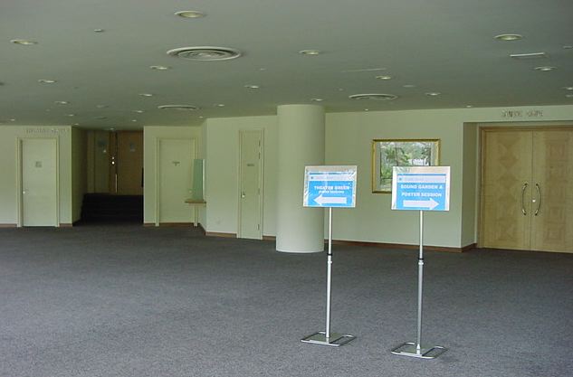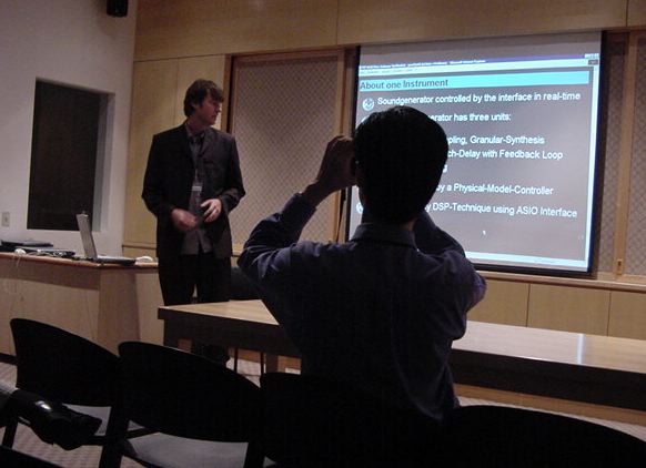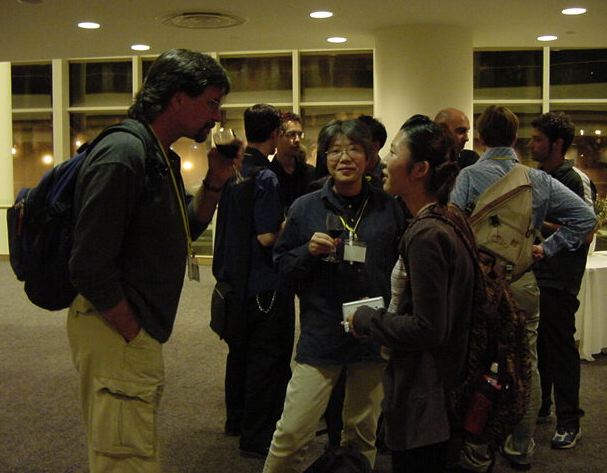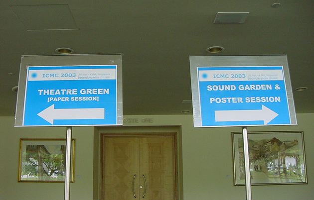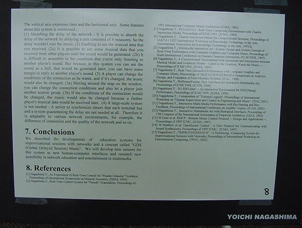 そして、Posterについても事前のメイルのやりとりとはかなり違っていて当惑しました。 「デモのムービーを持参するパソコンでデモりたいのでデスクとディスプレイを用意して」との リクエストにOKが来ていたのですが、現場にはそんな対応は影も形もありません。 そして、当初のWeb公開スケジュールでは、Nagashimaは2件のポスターのPresentationにそれぞれ 2日ずつずっと待機せよ、などというトンデモナイものだった(それではセッションもコンサートも 何も参加できない(^_^;))ので、「Presentation時間を限定して告知して」とリクエストして、 事務局からは「それぞれ10/1と10/2の10:30-12:00でよい」と連絡を受けていました。 しかし現場ではそのような情報は何もなく、他のポスター発表者も、いつ発表のために待機して いいのか不明なままで、結局、Poeterはずっと掲示していたものの、公式な「発表」は出来ないと いう不思議なICMCとなりました。個別に質問に来た人にいちいち説明する、というゲリラ作戦を 余儀無くされました。