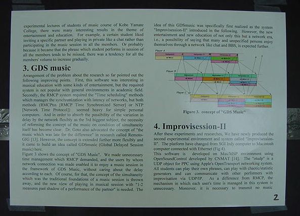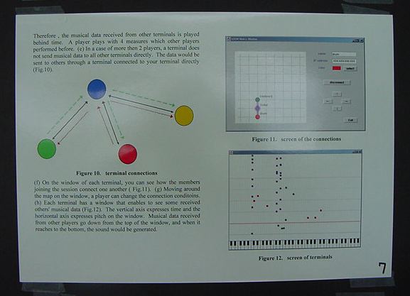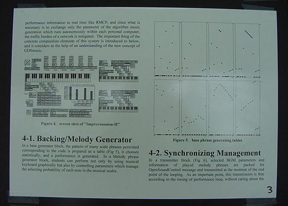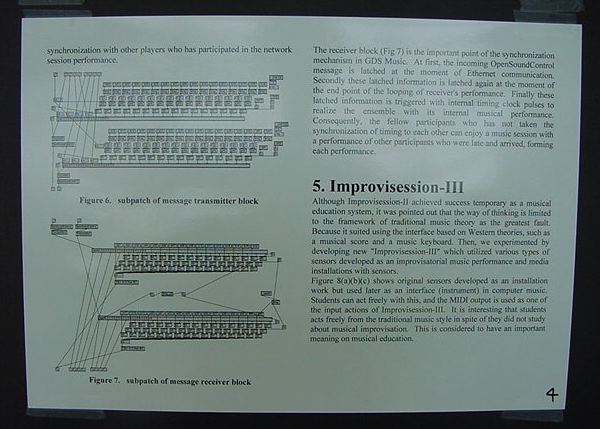 Yoichi Nagashima (SUAC/ASL, Japan), Takahiro Hara, Toshihiro Kimura, Yu Nishibori (YAMAHA Corp., Japan)This is a research report of improvisational computer music with human-computer interaction and music education. Many sensors are used for the interactive communication as interfaces, and many algorithmic agents are connected via networks each other. This paper is intended as an investigation of some special approaches: (1) Unix(Irix)-based network session system called "Improvisession-I", (2) New music model called "GDS (global delayed session) Music" allowing heavy newtork latency, (3) PC-based network session system called "Improvisession-II", and (4) Combination of many sensors and interfaces for free improvisation in music, called "Improvisession-III" system.