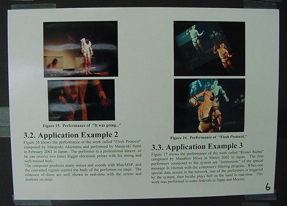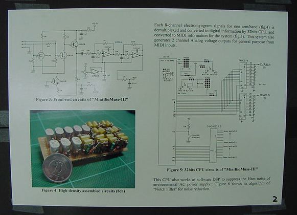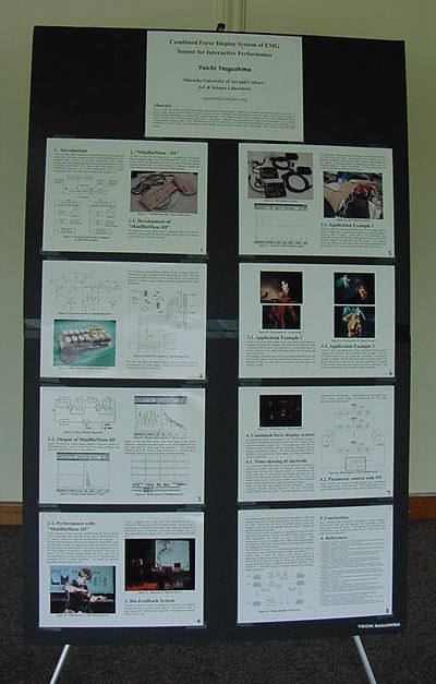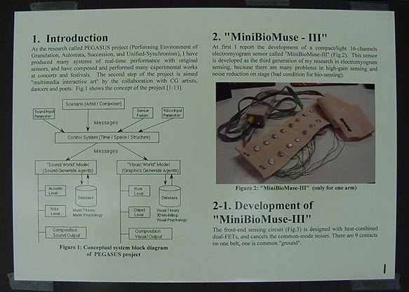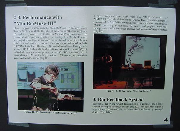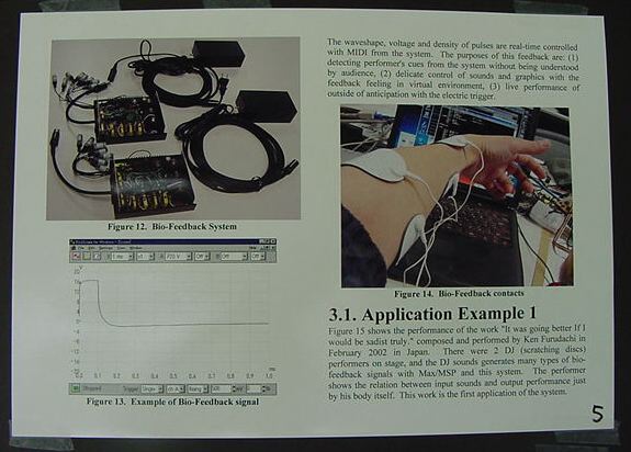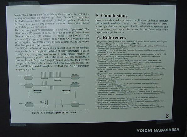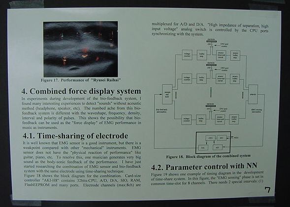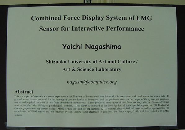 Yoichi Nagashima (SUAC/ASL, Japan)This is a report of research and some experimental applications of human-computer interaction in computer music and interactive media arts. In general, many sensors are used for the interactive communication as interfaces, and the performer receives the output of the system via graphics, sounds and physical reactions of interfaces like musical instruments. I have produced many types of interfaces, not only with mechanical/electrical sensors but also with biological/physiological sensors. This paper is intended as an investigation of some special approaches: (1) 16-channel electromyogram sensing system called "MiniBioMuse-III" and its applications, (2) 8-channel electric-feedback system and its applications, (3) combination of EMG sensor and bio-feedback system sharing same electrode to construct the "force display" effect of live control with EMG sensors.