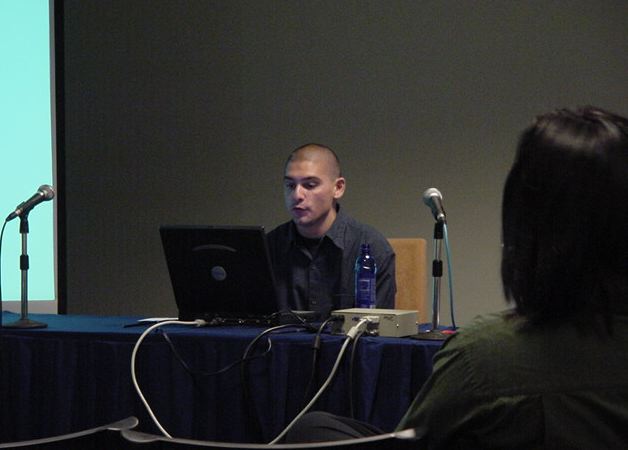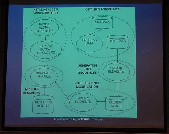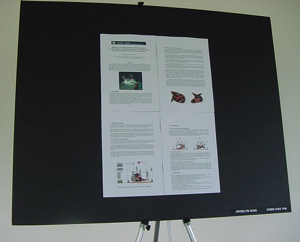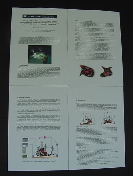 Chen Chu-Yin, Kiss Jocelyne (University Paris 8 ATI-INREV, France)The interactive installation Quorum Sensing will be presented as an example of the development of this type of system. This device is designed to metaphorically reconstitute an ecosystem by means of synthesised sounds and images. The future of the micro-organisms of this virtual universe evolves in accordance with its own particular rhythms but also in accordance with the movements of the public, which also plays a part in the destiny of the work. We will try to elucidate the rich potential of these models in terms of artistic expression, and will also explain the principal difficulties associated with this research, which impose epistemological reflection concerning the concept of its evolution.
