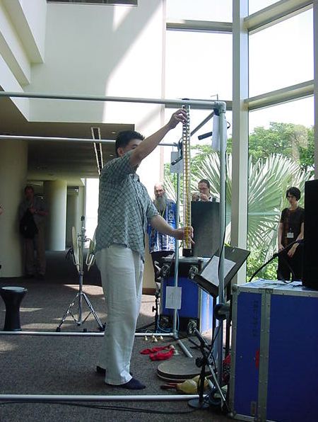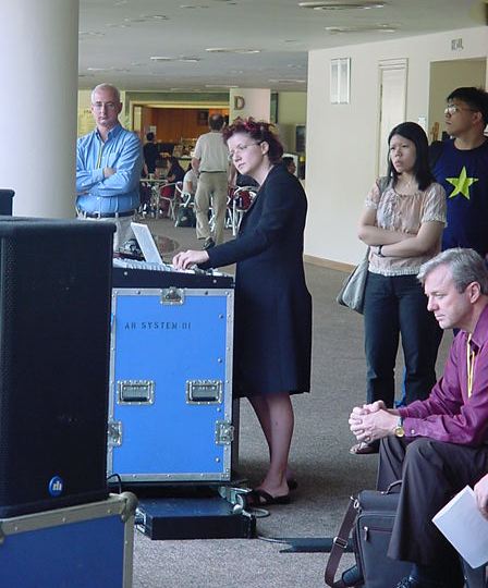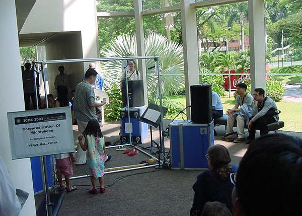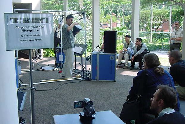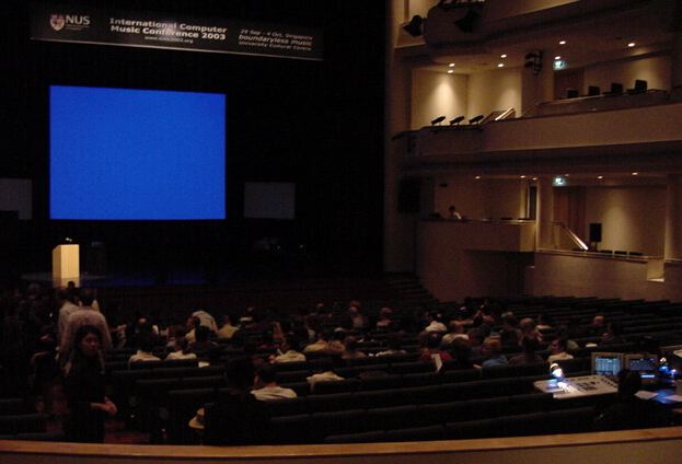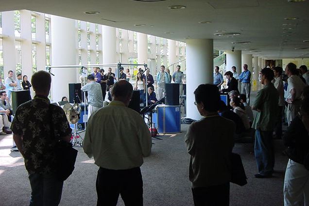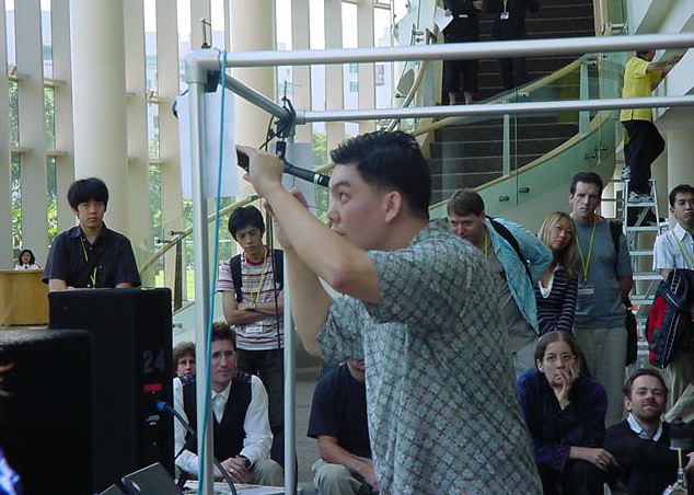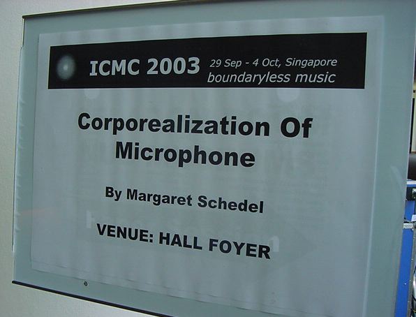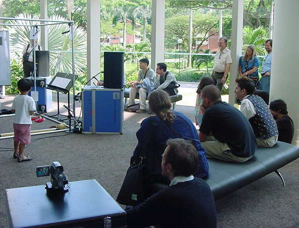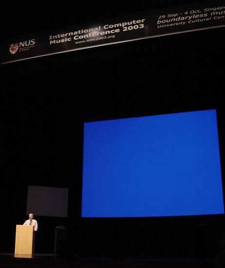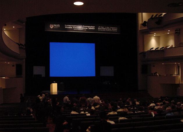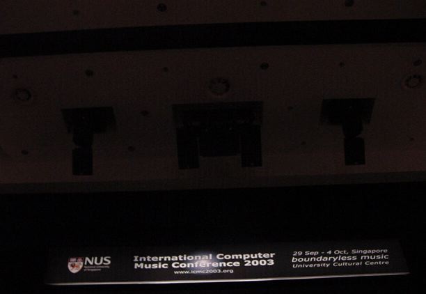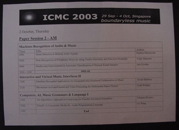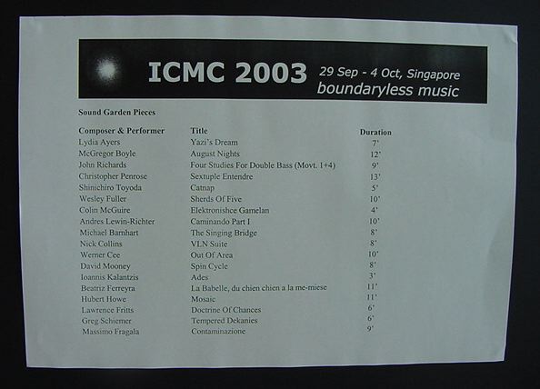 この日9/30は、最初のICMCアナウンスではTutorialだけだったため、 フライトもホテルも翌日10/1に合わせて(前泊して翌日からICMC参加)取っていたのですが、 その後ズルズルと次第に会議メニューが増えてきて、晩にもコンサート、さらにその後にWelcome Receptionだ、 という予定が開催間近になって告知されました。 しかし旅程は早割なので変更できません。 それでなくても会場のシンガポール国立大学に隣接したシンガポール国立病院でマスクもしないで素手で触ってSARS感染したSARS研究者の話題で動揺していたところです。 そのために、小坂さんの作品が公演されたEvening Concert(20:00-22:00)はいきなり聞けない、 というスタートとなりました。 そのコンサートは以下です。