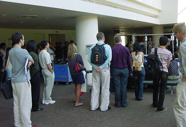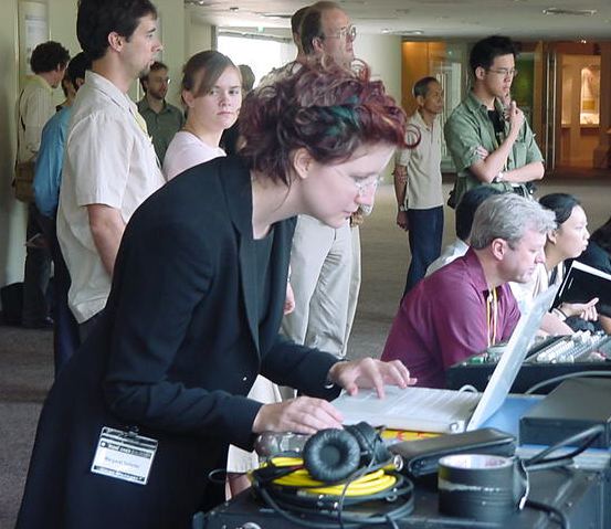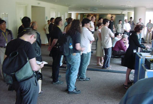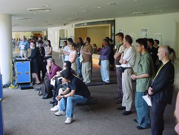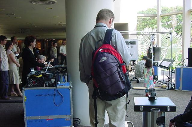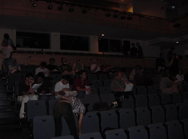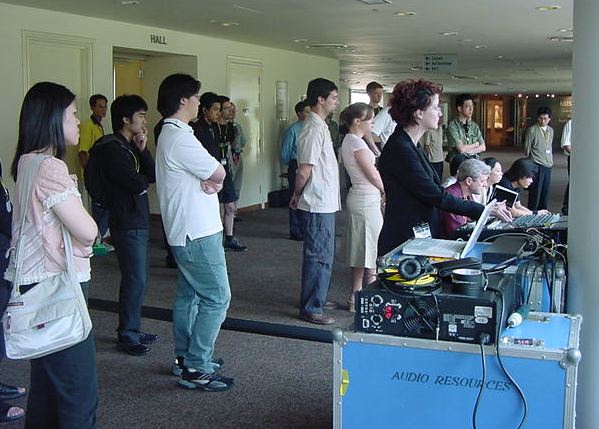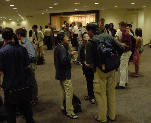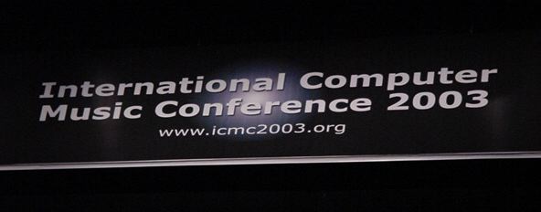 全体としてはよく統制されて運営していたICMC2003ですが、Registrationしてみると、 いつもの「論文集Proceedings」「プログラム(小冊子)」「優秀作品集CD」「ICMCバッグ」という セットのうち、初日に受け取ったのはプログラムとバッグだけでした。 論文集を持たずにセッションに参加してもまったく判らないのですが、仕方ないので「明日まで待て」 というのに従いました。
