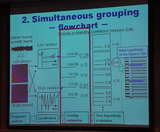 Masashi Unoki, Masaaki Kubo, Masato Akagi (Japan Advanced Institute of Science and Technology, JAPAN)This paper proposes a selective sound segregation model for separating target musical instrument sound from the mixed sound of various musical instruments. The model consists of two blocks: a model of segregating two acoustic sources based on auditory scene analysis as bottom-up processing, and a selective processing based on knowledge sources as top-down processing. This model concept is based on "computational auditory scene analysis." Two simulations were carried out to evaluate the proposed model: One in which a target sound was segregated from a mix of four instrument sounds, and one in which a musical performance sound was segregated from a mixed musical performance. Results showed that the model could selectively segregate not only the target instrument sound, but also the target performance sound, from the mixed sound of various instruments. This model, therefore, can also be adapted to computationally model the mechanisms of a human's selective hearing system.