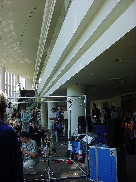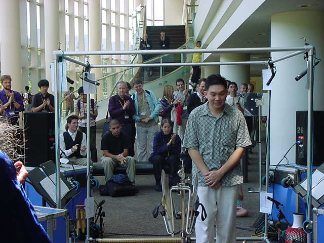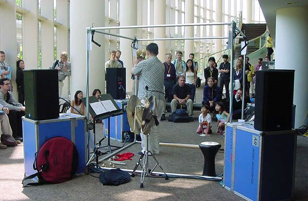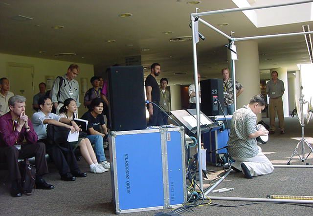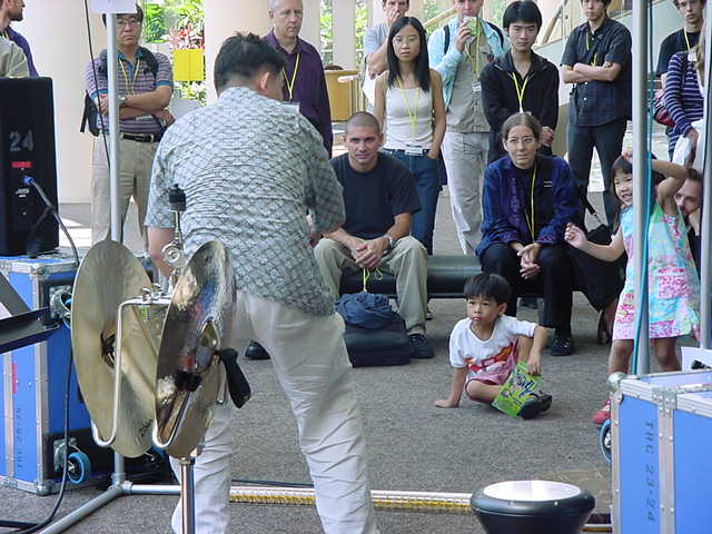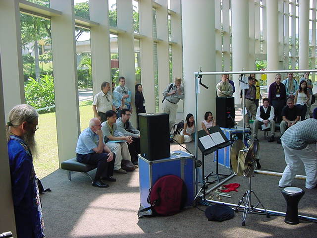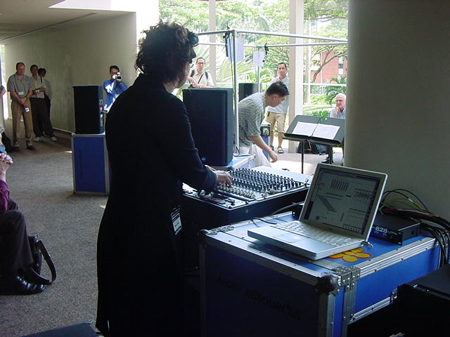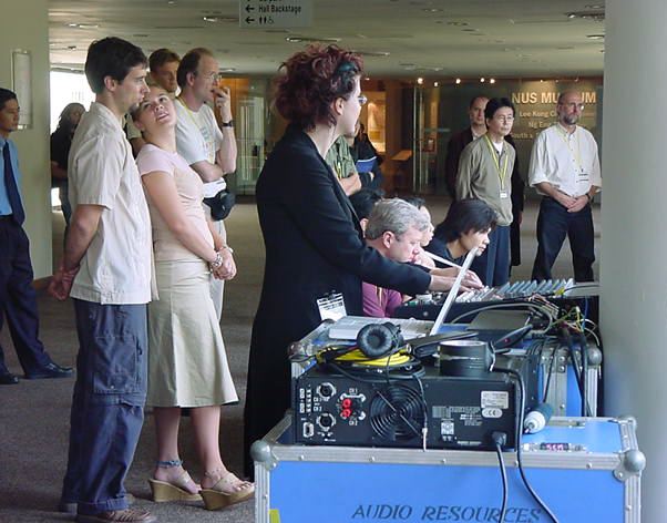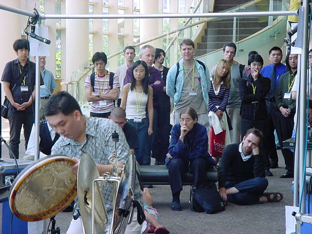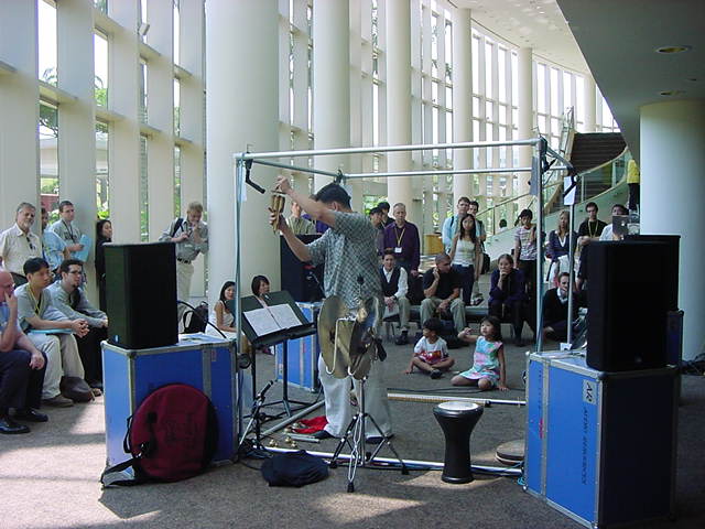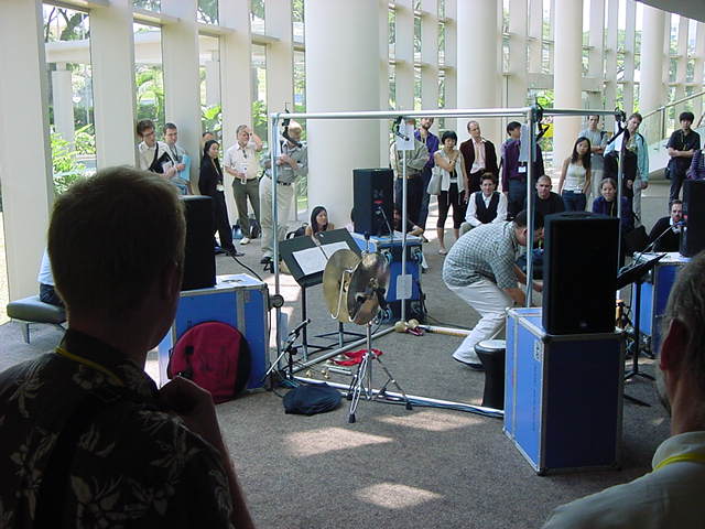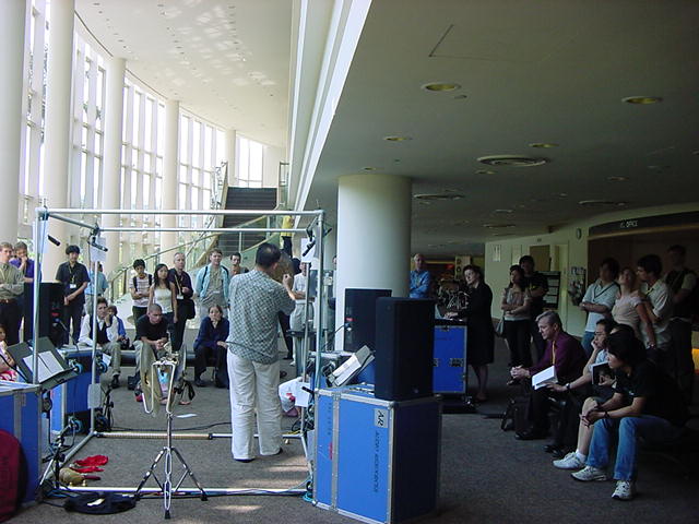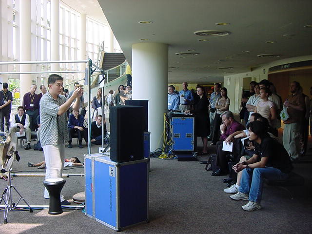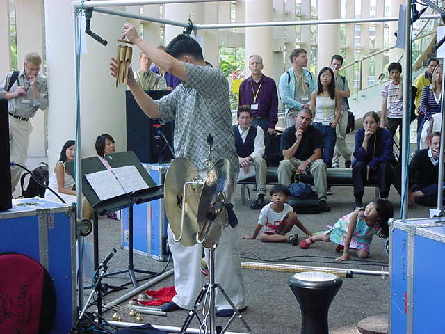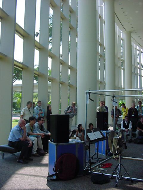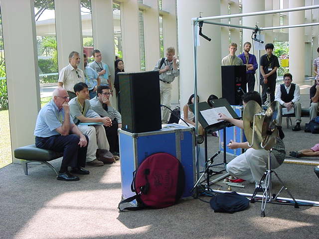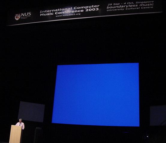 そこで、学生の部屋に電話するとホテルに帰ってきていたので、ホテルから歩いて数分のフードコートでの夕食に 出かけました。 部屋に戻ってから仕事メイルを整理していると、またまた就寝は深夜になりました。 ★ ★ ★ ★ ★ ★ ★ ★ ★ ★ ★ ★4th October Saturday Evening - Approximate playing time : 82 min Douglas Geers Enkidu 11 Apostolos Loufopoulos Night Pulses 11 Paul Wilson Spiritus 13 Russell Pinkston Gerrymander 8 Ivica Bukvic Slipstreamscapes Lullaby 9 Rikhardur Fridriksson Lidan II 12 Diane Thome Estuaries of Enchantment 11 Steve Everett Ladrang Kampung 7ちなみにICMC2003の事務局に取材したところ、当日参加者(約10名)を加えても、全体の参加者は 120名ほどだったとのことで、SARSの影響、そして欧州組が敬遠するアジア開催のICMCということで、 かなり小規模なものになってしまったようです。