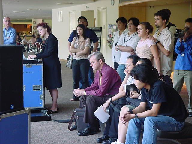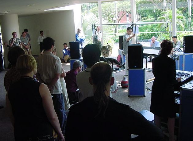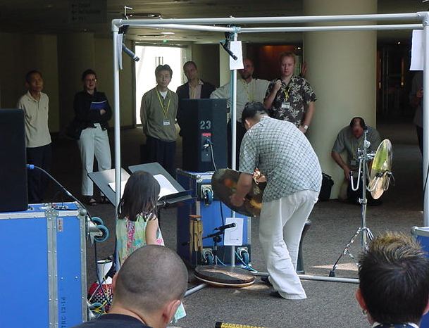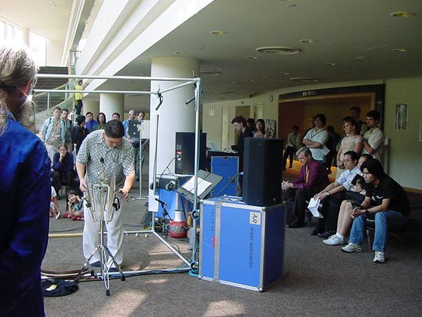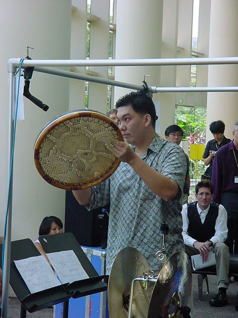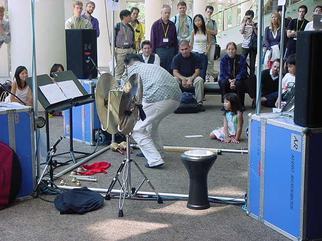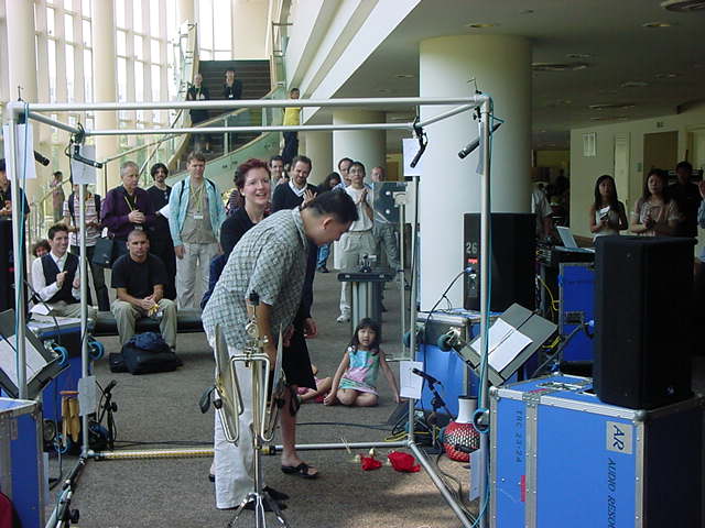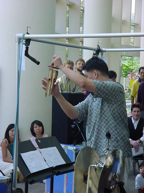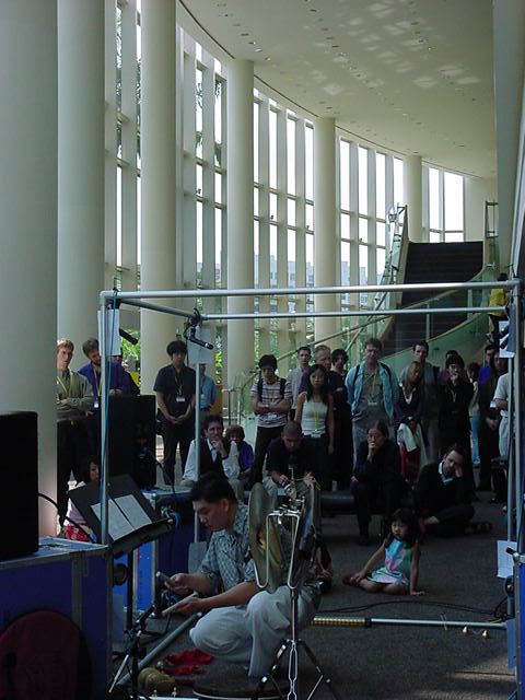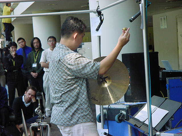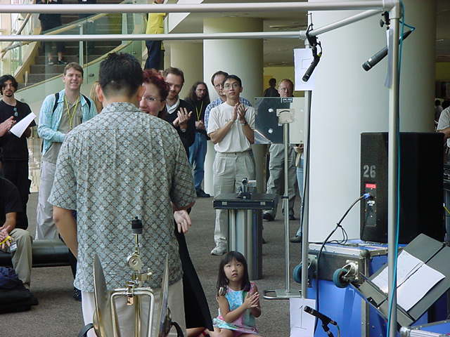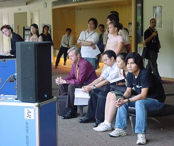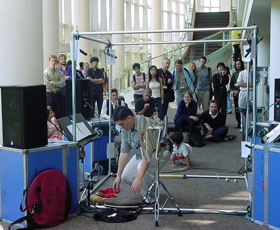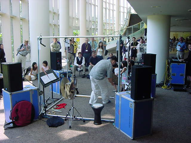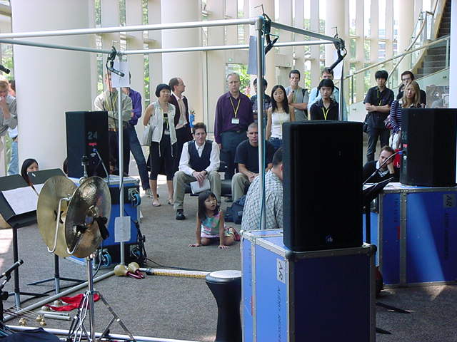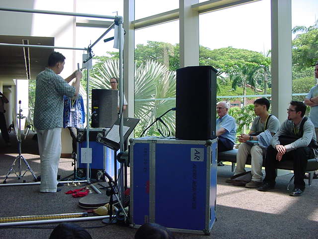 そこで、学生の部屋に電話するとホテルに帰ってきていたので、ホテルから歩いて数分のフードコートでの夕食に 出かけました。 部屋に戻ってから仕事メイルを整理していると、またまた就寝は深夜になりました。 ★ ★ ★ ★ ★ ★ ★ ★ ★ ★ ★ ★4th October Saturday Evening - Approximate playing time : 82 min Douglas Geers Enkidu 11 Apostolos Loufopoulos Night Pulses 11 Paul Wilson Spiritus 13 Russell Pinkston Gerrymander 8 Ivica Bukvic Slipstreamscapes Lullaby 9 Rikhardur Fridriksson Lidan II 12 Diane Thome Estuaries of Enchantment 11 Steve Everett Ladrang Kampung 7ちなみにICMC2003の事務局に取材したところ、当日参加者(約10名)を加えても、全体の参加者は 120名ほどだったとのことで、SARSの影響、そして欧州組が敬遠するアジア開催のICMCということで、 かなり小規模なものになってしまったようです。