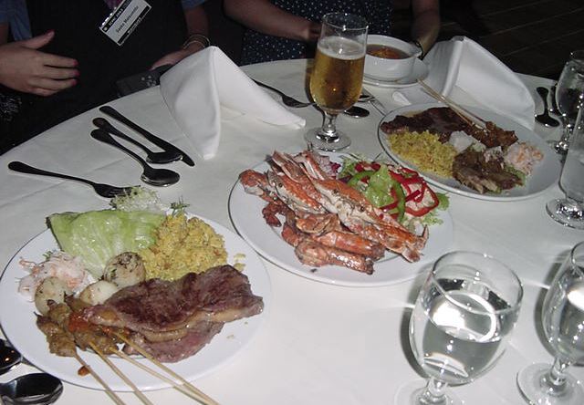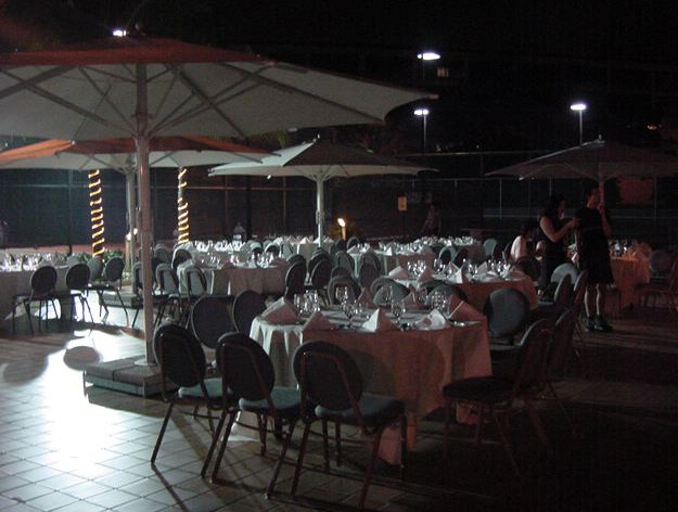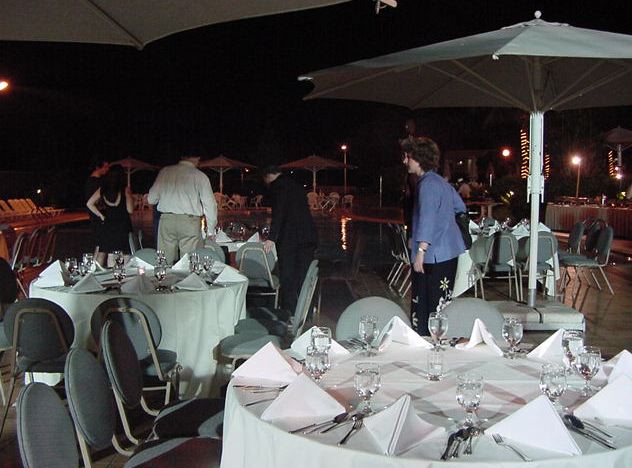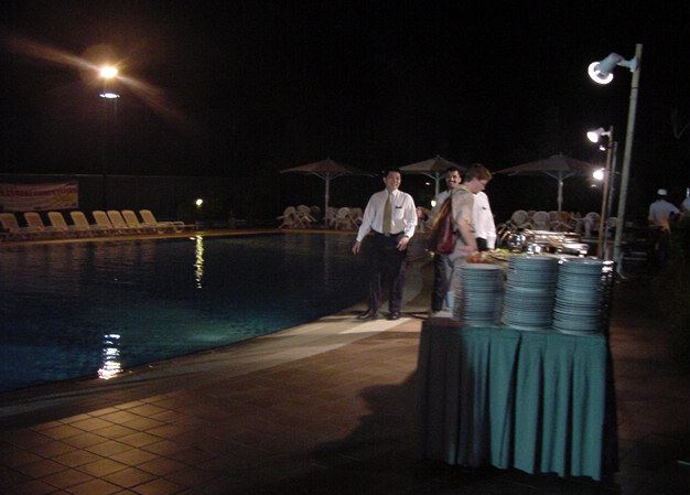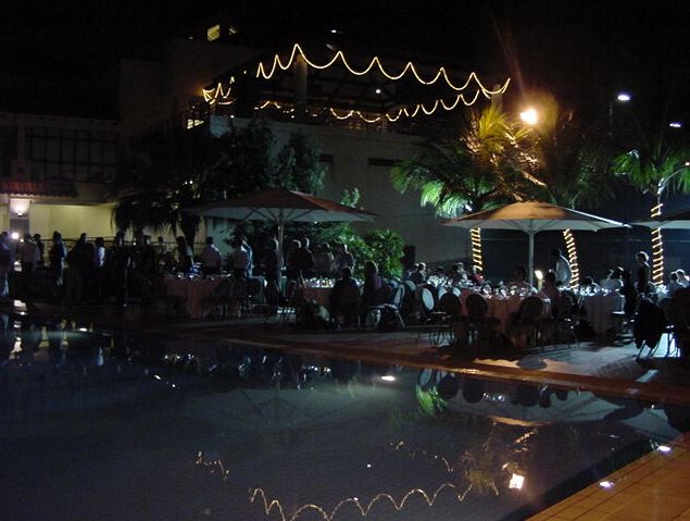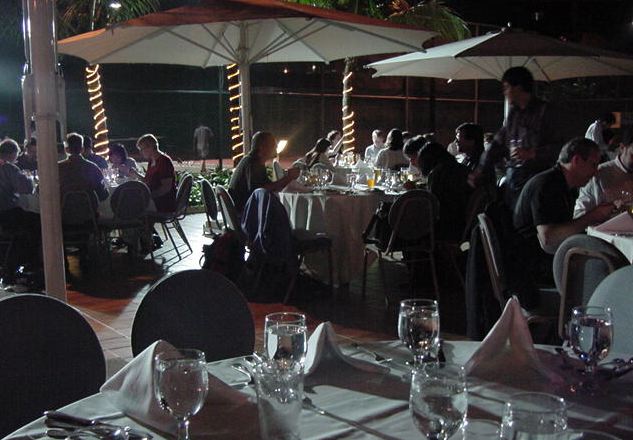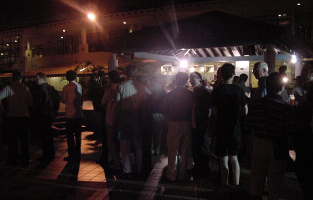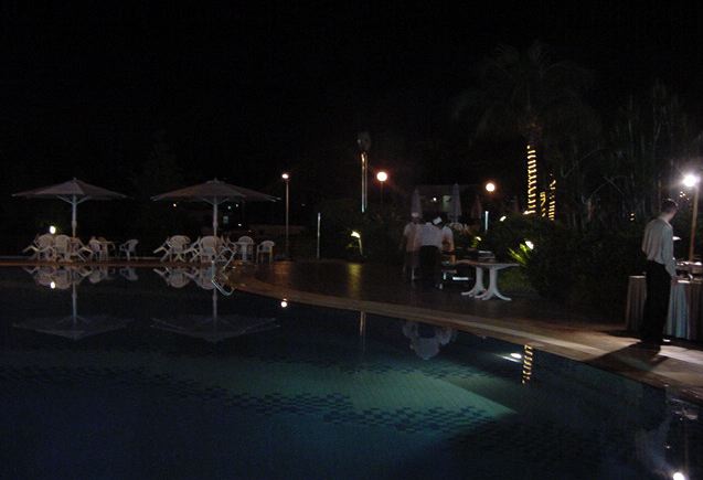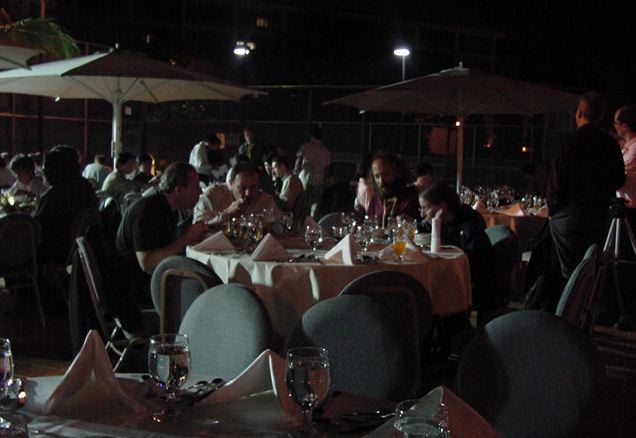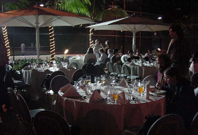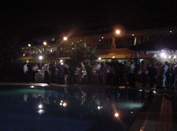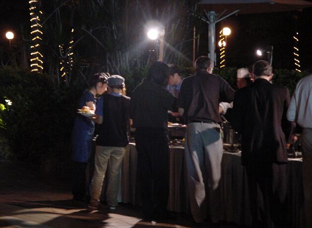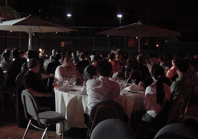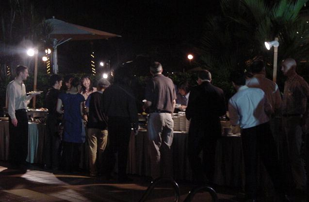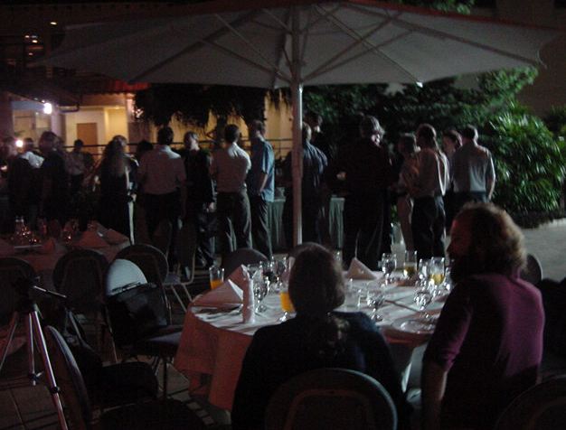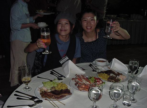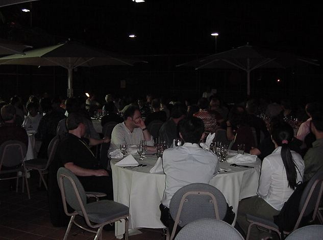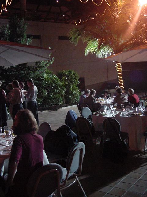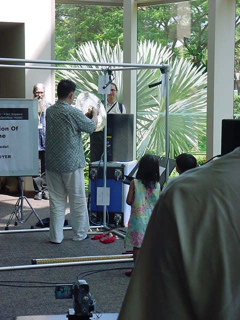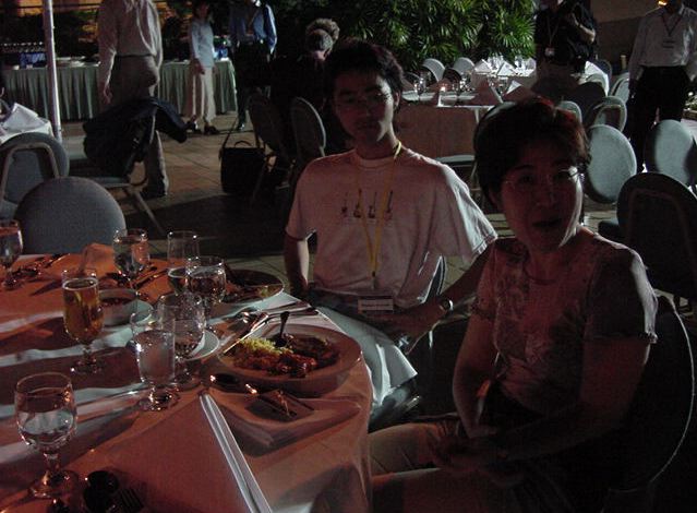 この日はバンケットで、会場からNUS学内のゲストハウスにバスで向かいました。 ちゃんとそれぞれ35ドルを払った学生も一緒に参加しました。 ★ ★ ★ ★ ★ ★ ★ ★ ★ ★ ★ ★ ★ ★ ★ ★ ★ ★ ★ ★ ★ ★ ★ ★ ★ ★ ★ ★ ★ ★ ★3rd October Friday Pre-Banquet Concert (1830 - 2000hr) - Approximate playing time : 89min Frank Ekeberg Intra 13 Brian Belet Lyra 10 John Young Ars Didjita 9 Jon Drummond Book of Changes 8 Yoshiko Ando KotoBabble 10 Orlando Jacinta Garc誕 Imagines (sonidos) sonorous congelados 15 Pablo Furman Etude 8 Kotoka Suzuki Umidi Soni Colores 16このバンケットの席上で、「次回ICMC2004は11月にフロリダで」「その次ICMC2005はスペインのバルセロナで」と 発表がありました。また頑張って論文を書かなくては(^_^;)。 同じテーブルになったイタリアの作曲家は前夜のサイレント映画で演奏した人で、ホテルも近かったので 帰りのタクシーも一緒でした。ホテルに帰ると日付けはもう変わっていました。 そこからネットに接続して、後期の講義の受講を希望する学生のメイルを受けて、これだけで総数は160本ほどになり、 就寝はまた26時近くになりました。