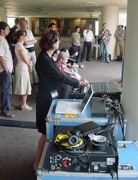 Marije Baalman (Technical University Berlin, Germany)Wave Field Synthesis offers new possibilities for composers of electronic music to add the dimension of space to a composition. Unlike most other spatialisation techniques, Wave Field Synthesis is suitable for concert situations, where the listening area needs to be large. It is shown that an affordable system can be built to apply the technique and that software can be written which makes it possible to make compositions, not being dependent on the actual setup of the system, where it will be played. Composers who have written pieces for the system have shown that with Wave Field Synthesis one can create complex paths through space, which are perceivable from a large listening area.
