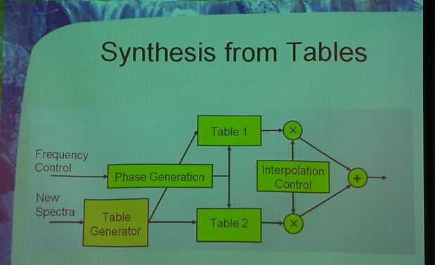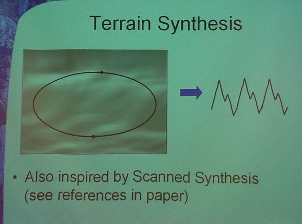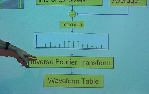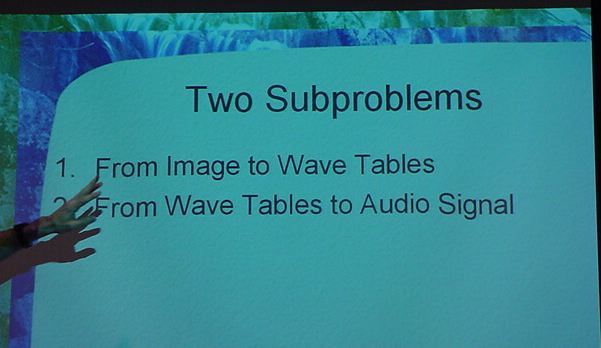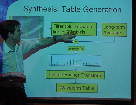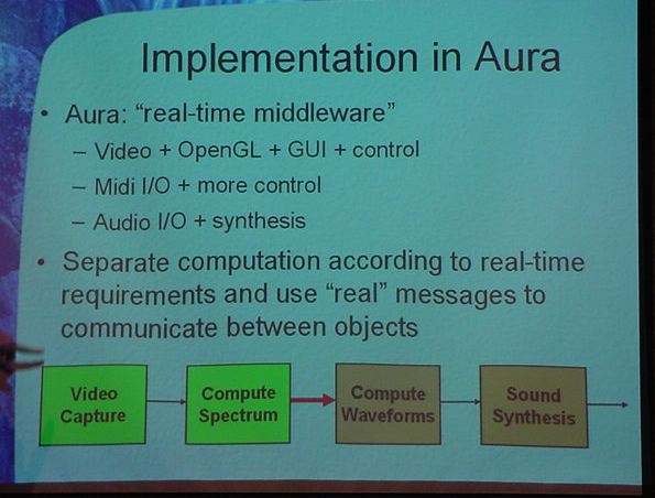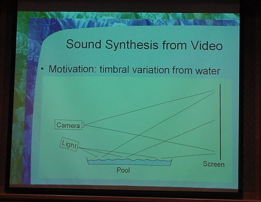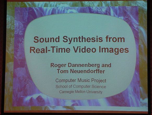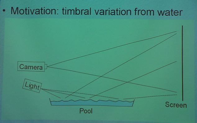 Roger Dannenberg (Carnegie Mellon University, USA) Tom Neuendorffer (Consultant, USA)A novel synthesis technique is introduced where sound spectra are controlled in real time by digital video. Video offers a rich source of time-varying control information. Problems addressed include how to map from video to sound, dealing with global variations in light level, dealing with low frame rates of video relative to high sample rates of audio, and overall system implementation. Short term changes in video luminance within a vertical strip are mapped to harmonic amplitudes of tones, and spectral interpolation is used to obtain smooth spectral changes over time. In one application, images of light reflected from a shallow pool of water are used to control sound, offering a rich tactile interface to sound synthesis. This work is implemented using Aura to manage video and audio I/O and scheduling, and it runs under the Linux OS with low-latency kernel patches. Video examples will be presented at the conference presentation.