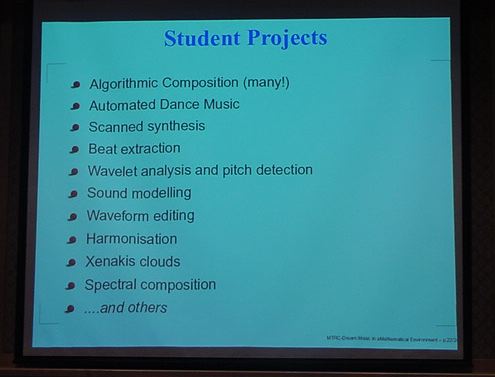 John Ffitch, Richard Dobson (Media Technology Research Centre, University of Bath, UK)The Media Technology Research Centre of the University of Bath is a grouping of researchers with a general interest in some aspect of Media, mainly in graphics and animation. When it was founded this was part of the School of Mathematical Sciences, but with reorganisations we are now in the Department of Computer Science. A small part of the centre is dedicated to research in aspects of computers and music, a part known locally as DREAM. While our charter emphasises the computational aspects it is significant that the university does not have a music department, nor any department dedicated to arts or humanities.