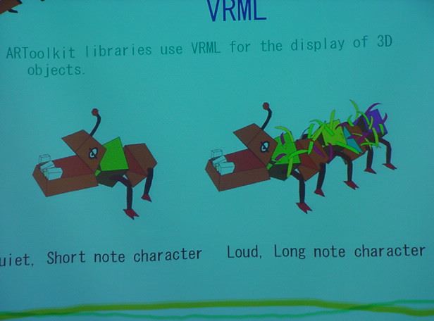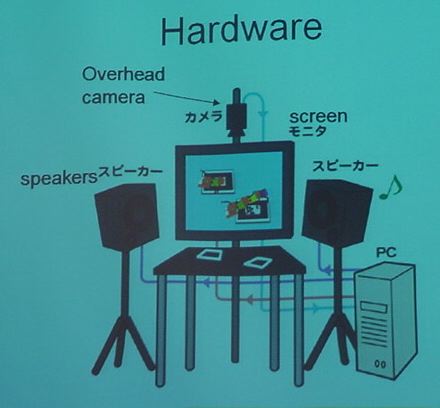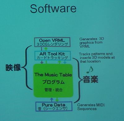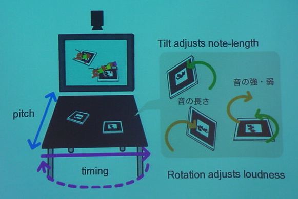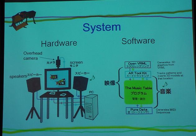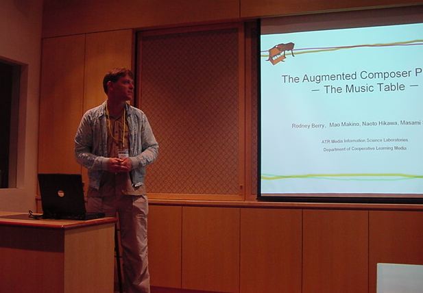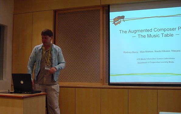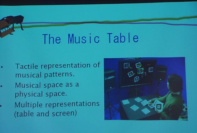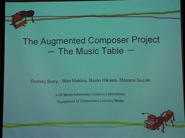 Rodney Berry, Mao Makino, Naoto Hikawa, Makoto Tadenuma (ATR/MIS2, Japan)The Music Table enables the composition of musical patterns by arranging cards on a tabletop. An overhead camera allows the computer to track the movements and positions of the cards and to provide immediate feedback in the form of music and on-screen computer generated images. This paper describes the basics of the system design and outlines some future directions for the project.