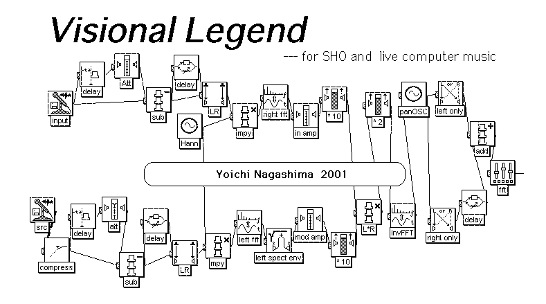 The Sho sounds (single note, chords, noises, etc) were sampled into SGI Indy workstation, edited many techniques like "music concrete" with SGI soundeditor software, processed by SSC Kyma signal-processing workstation with algorithmic control by Max patches. In my composition, I usually use these softwares for signal processing : Kyma, Max/MSP, SuperCollider, SGI soundeditor, and original softwares written in C language by myself on IRIX(SGI) environments.