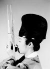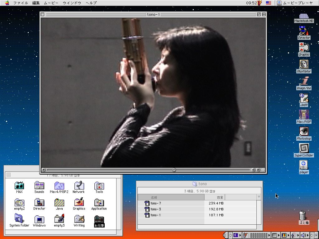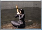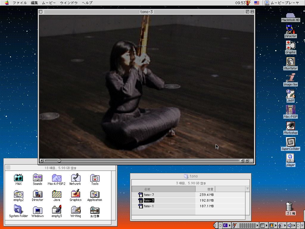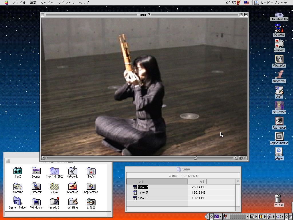 We had also recorded the QT movies of Tamami Tono performing Sho, and these movies are used as elements of the graphical part of the work. I am challenging not only using QT movie but also live image of CCD camera via Firewire (IEEE1394, iLink) with Image/ine, so there remains very little possiblity of using live CCD information in the performance in the Kassel concert 2001.