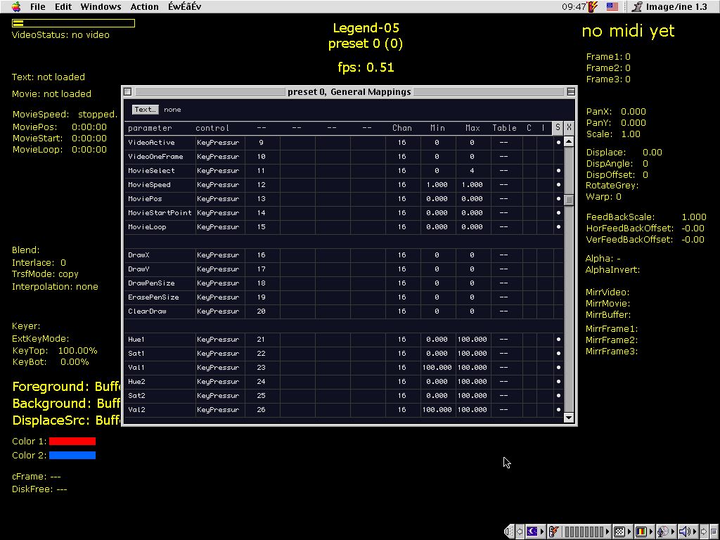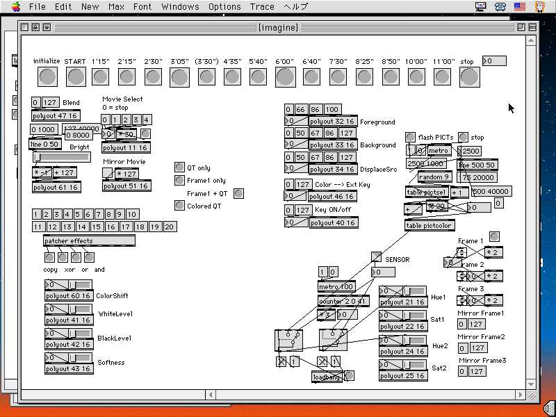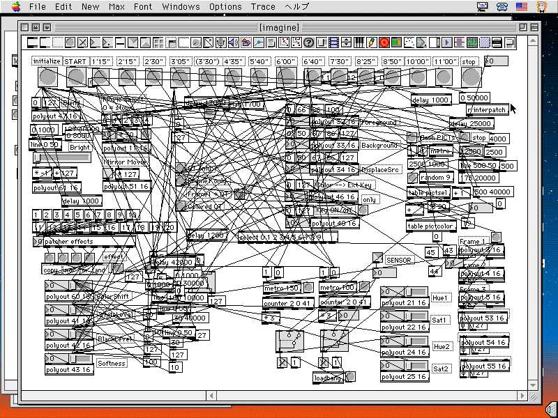 The newest version of "Visional Legend" (2001) has evolved to "digital" processing not only in musical part but also in graphical part of the work completely. I choosed one software called "Image/ine" with Macintosh.