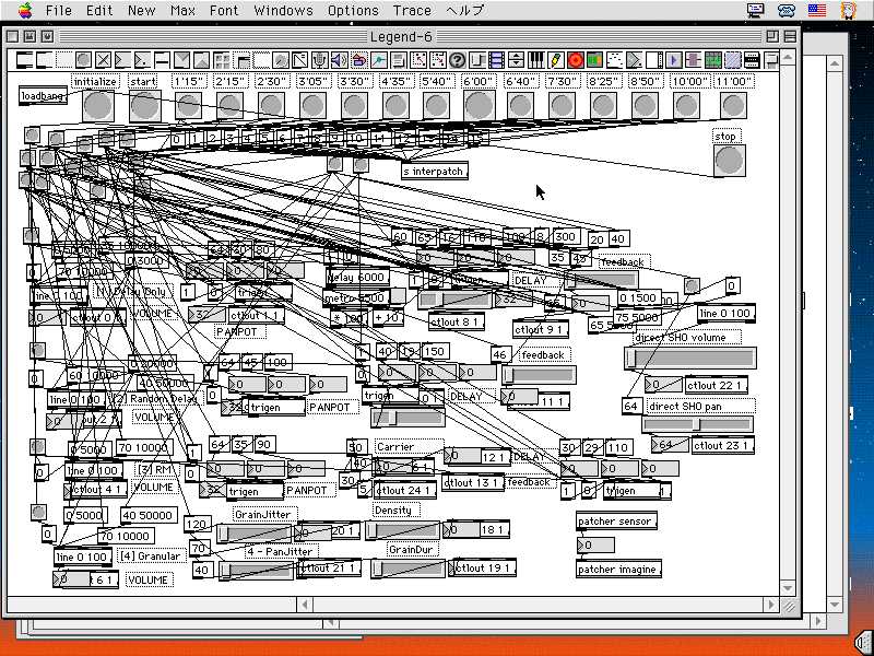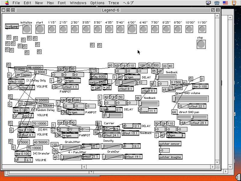All live control is generated by Max in the performance with receiving the MIDI output of Sho breath sensor. The breath sensing information from Sho is real-time pattern-matched and recognized into "performance information", and they trigger some changes of sounds and graphics, they controls continuously as parameters of signal processing and color information in visual effect, etc. Fig.23 - Fig.27 shows the original Max patches for "Visional Legend". In the performance, I am at the computer desk and control the main patch of Max in real time as another performer.