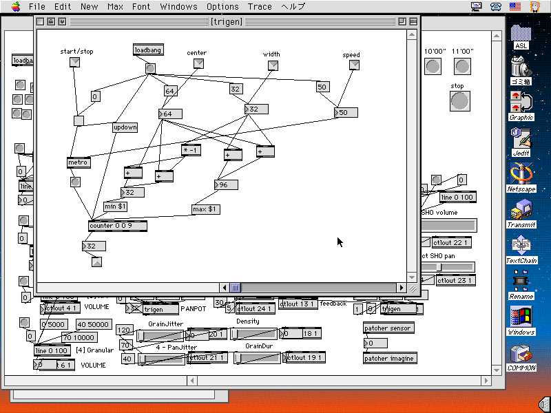 Fig.10 shows one sample of signal processing block which acts as "real-time granular sampling" effects. In this patch, there are 29 grains (smoothly-enveloped, live-sampled sound elements) and rendomly re-generated with [GrainDur] [GrainDurJitter] [Density] [PanJitter] parameters via MIDI "control change" messages.