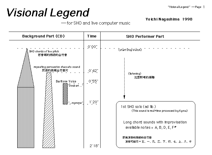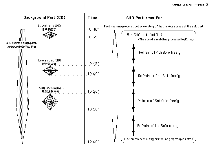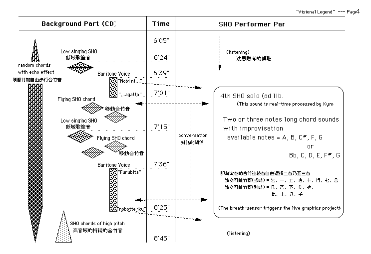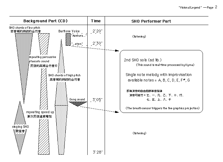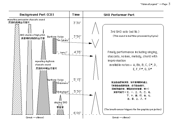 As you know when you read/study the score of "Visional Legend", there is no "fixed" note or chord in the Sho performer's part. The Sho part of this work may be played fully improvisation, so the Sho performer must "listen, feel, create" the musical images and play the Sho with bachground CD sound part and live-generated graphics. I request the "human supervision and control in music" to the performer in this work, and construct the environment for real-time composition and performance scientifically (computer music).