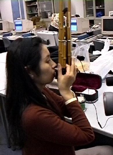 I and Tamami Tono (my friend, composer and Sho performer, active in worldwide) have a collaboration project featuring the bio-sensing technology in music. The Sho (Japanese traditional instrument) player blows into a hole in the mouthpiece, which sends the air through bamboo tubes which are similar in design and produce a timbre similar to the pipes in a western organ. It can produce chords as well as single notes. It is important and interesting that the Sho player uses both directions of the breath stream, and controls the breath pressure for expressions in music. I have developed two styles of sensors for Sho performance with bio-sensor technology and microelectronics, and produced a multimedia/interactive environment for composition/performance of computer music featuring Sho, and composed this work.