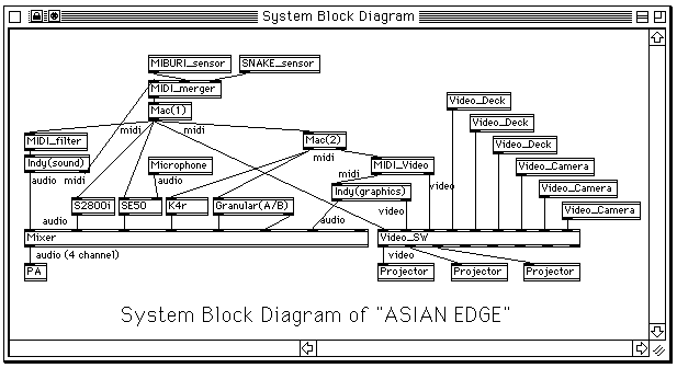 "Asian Edge"のシステム図である。ここでは、身振りを検出するセンサを身に付けたPerformerの