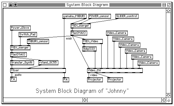 インタラクティブ・マルチメディア作品"Johnny"のシステム図である。ここでも、ステージ中央で