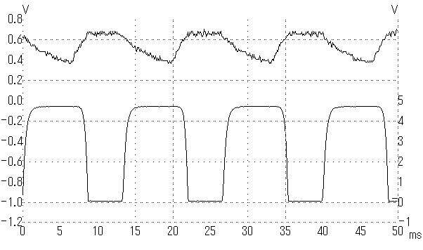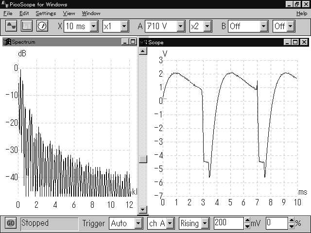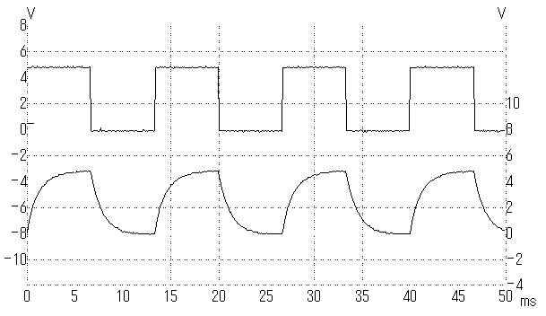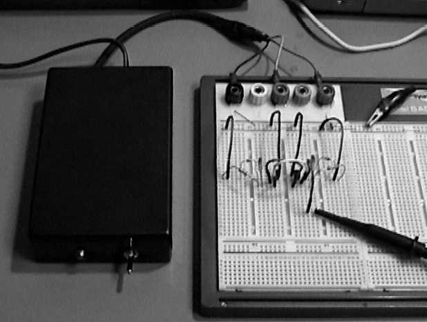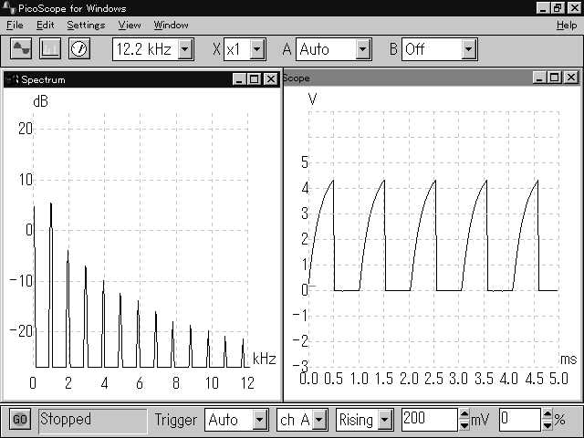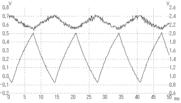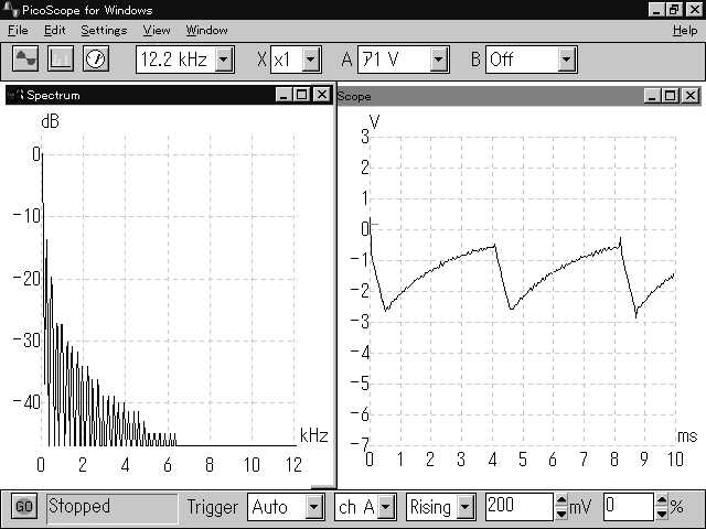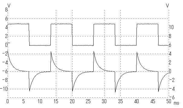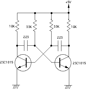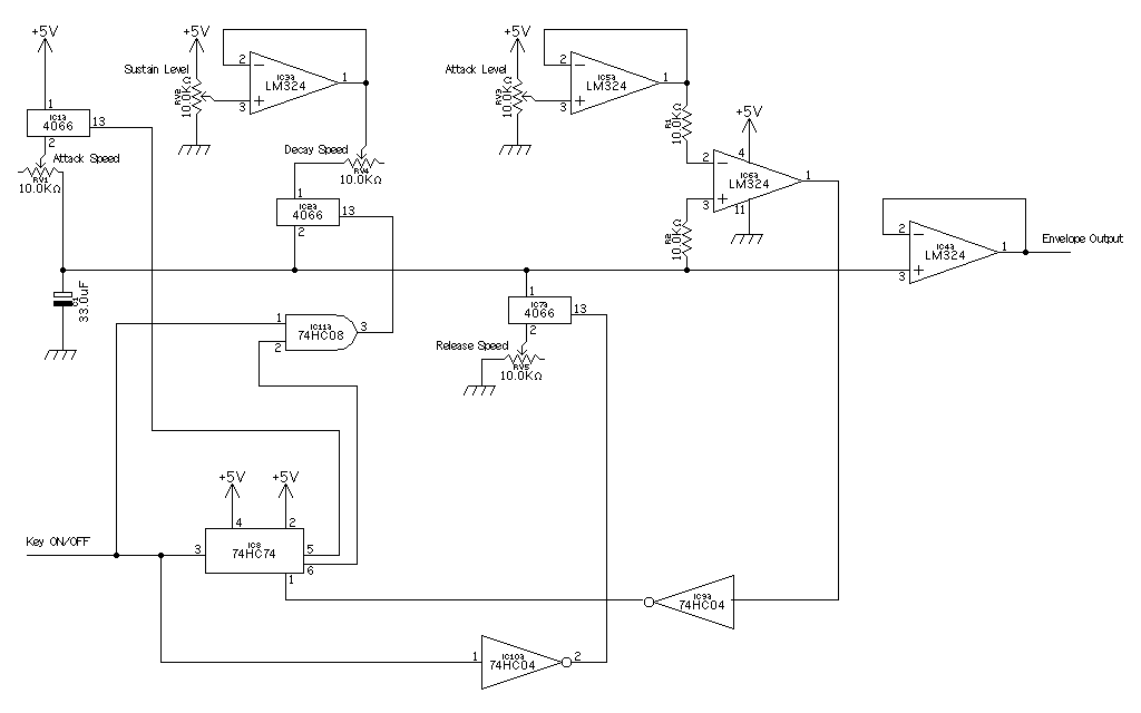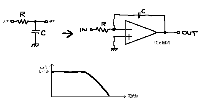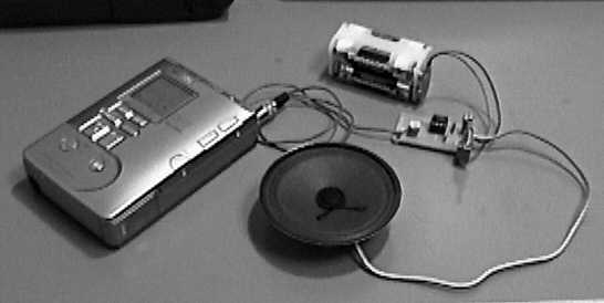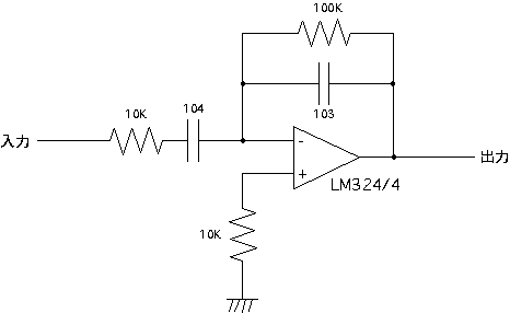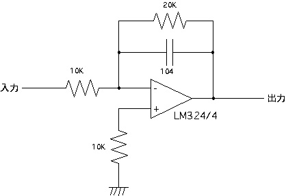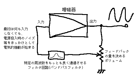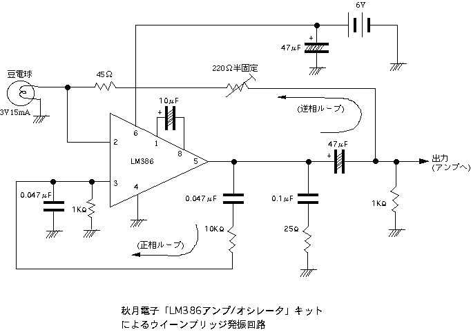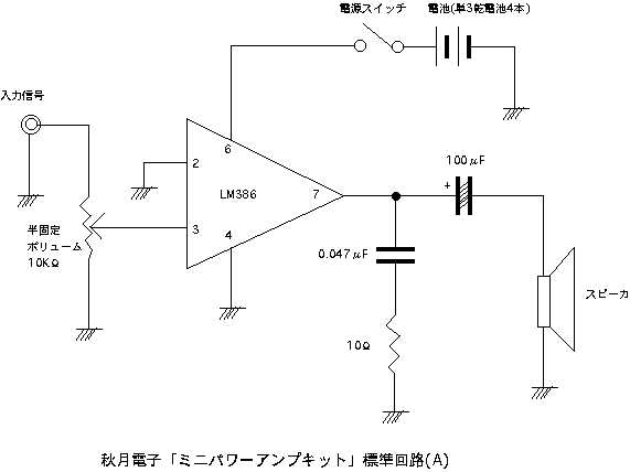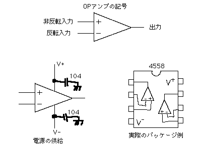 本章では、サウンドエレクトニクスの中でも基盤技術となっている、 アナログシンセサイザやアナログによる電気楽器/電子楽器の回路技術から 振り返っていくことにします。これは決して過去のものではなく、現代でも 通用する基本的なサウンドエレクトロニクスの要素技術なのです。 ●アンプエレキギターなどの電気楽器や、電子オルガンなどの電子楽器など、 サウンドを扱う機器で必須となるのは、最終的に空気振動として耳に 伝えるためのアンプとスピーカ、いわゆる「サウンドシステム」です。 ただし、本書はハイファイオーディオマニアのための本ではありません ので、ここで各種のオーディオアンプの方式とかスピーカの種類、音質の 改良技術などに深入りすることはしません。むしろ楽器の世界では、 理想的に平坦な特性(ハイファイ)よりも、クセのある特性のアンプ とスピーカが「楽器の個性」として好まれてきた経緯もあります。真空管[章末のコラム参照]の時代から、エレクトロニクスの花形が現在のIC やLSIに移るまでの長い期間、そして現在でも半導体技術の中枢にいる主役は、 図2.1 のような「トランジスタ」の回路です。P型とN型と2種類ある半導体 を組み合わせた2端子素子の「ダイオード」に対して、エレクトロニクスの 主役であるトランジスタは3端子素子で、構造的には「PNPトランジスタ」と 「NPNトランジスタ」の2種類があり、 図2.2 のような名前の付け方のルールが あります。もっとも、高周波タイプのトランジスタでオーディオ帯域の 低周波回路を組んでもまったく問題ありません。 図2.3 は、 図2.1 の回路図の入力電圧(左側の縦軸)と出力電圧(右側の縦軸) とを実際の回路により計測した例です。上段の入力電圧は、0.15V程度の振幅 であるのに対して、下段の出力振幅は1.2V程度にまで増幅されていることが わかります。なお、 この図 では入力電圧が細かく振動しているのに出力に あまり反映されていませんが、これは入力電圧を計測していたオシロスコープ の部分でノイズを拾っている(実際の信号にはこの成分はあまり乗って いない)ためです。またこの回路では、入力信号と出力信号の極性が反対の 「反転増幅器」であることにも注意しておきましょう。 さて、サウンドエレクトロニクスでのアンプの役割には、 図2.4 のような色々な 領域があります。 「音響信号のミキシング、増幅」とは文字通りで、システム内の電気信号 を最終的にスピーカからの音響(空気振動)にするまでの領域です。 サウンドのディジタル情報がD/A変換されたあたりの、いわゆる音源部分 での出力というのは、ある振幅の電圧信号になっています。これを、 エレキギター等のピックアップ信号を増幅するプリアンプの出力など他の 系列の信号と足し合せる部分がミキシング回路で、一種の電圧加算アンプ です。また、スピーカを駆動するためには、この電圧信号を「電力信号」 として電圧だけでなく電流も十分に駆動する必要があり、ここにパワー アンプ回路が必要になります。 たとえば、 図2.5 は、専用ICのLM386を1個だけ使った「パワーアンプ 回路キット」を動作させている風景です。ここでは、入力として ウォークマンの電圧信号を与えて、電源として乾電池のエネルギーを 利用して、スピーカを駆動する電力信号を得ていることになります。 そして、このアンプの回路図は 図2.6 のようになっています。ここでは、 アンプICのLM386の内部のトランジスタ回路の構成まで深入りすること なく、機能を実現するブラックボックスとして活用できるわけで、 本書ではこのような「簡単に入手できる機能IC/LSI」については、 積極的に利用していくつもりです。 なお、本書では、おもに「ライン」レベルのサウンド信号を作り出すところに 主眼がありますので、最終的にスピーカを駆動するパワーアンプの検討は 省略します。興味のある皆さんは、各種のパワーアンプキットを製作して みるといいでしょう。実際には、ステレオコンポ、ラジカセ、カラオケ の外部入力、パソコン用モニタなど、どんなアンプに接続しても電気信号と しては変わりません。もちろん、音のクオリティはアンプとスピーカにより 変化するのはいうまでもありません。 図2.4 の「シグナルコンディショニング」というのは、たとえばセンサや ピックアップからの信号を一般的な電圧信号にするプリアンプ部分、 あるいは極性反転、振幅制限リミティング、オフセットを加算する電圧 シフト回路、電圧−電流変換、バッファリングなどの機能のアンプです。 これらは、一般にOPアンプICによって、かなり理論的な特性を容易 に獲得できるようになっています。また、周期的に繰り返す信号を発生 するオシレータに対して、エンベロープのような非周期的な制御電圧 信号を生成するのも、アンプ回路の一種の応用となります。 そこで、トランジスタの次の世代として、アナログのエレクトロニクス 回路技術の基本要素として活
