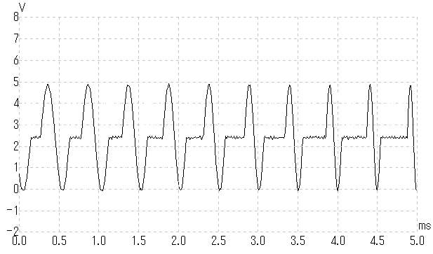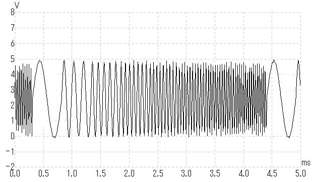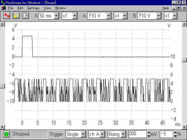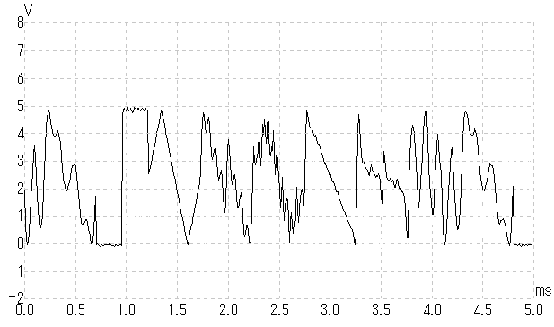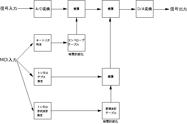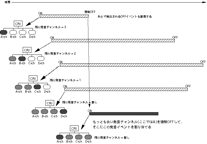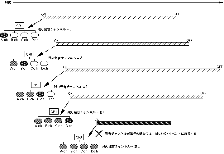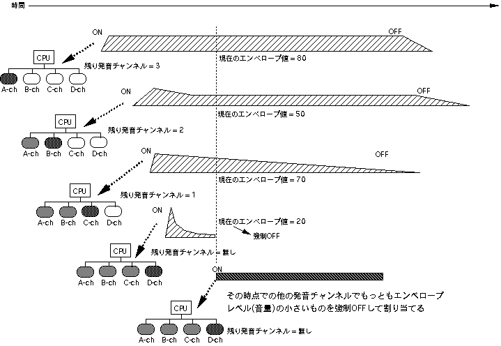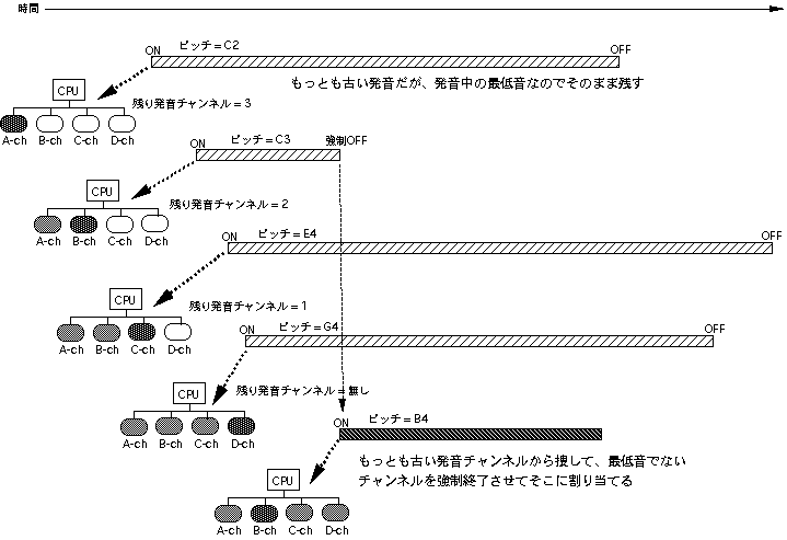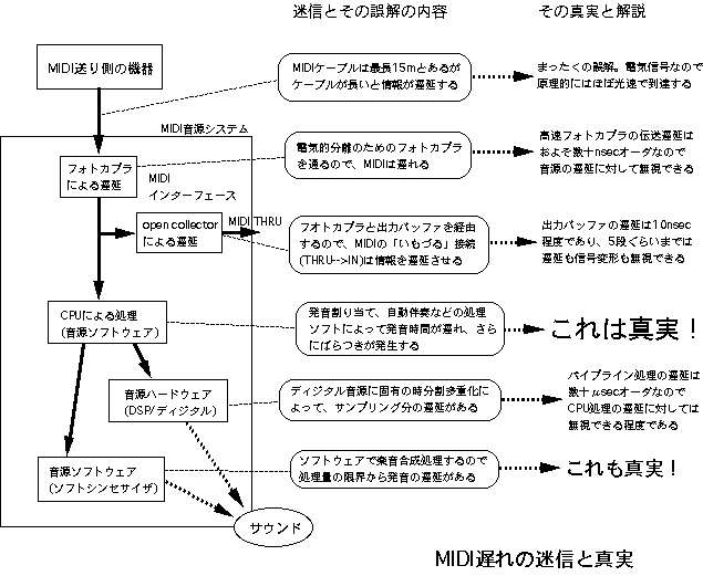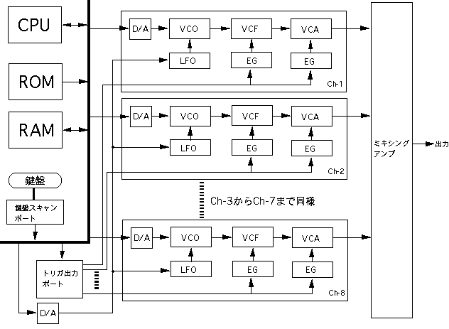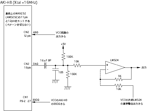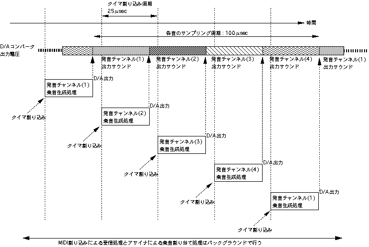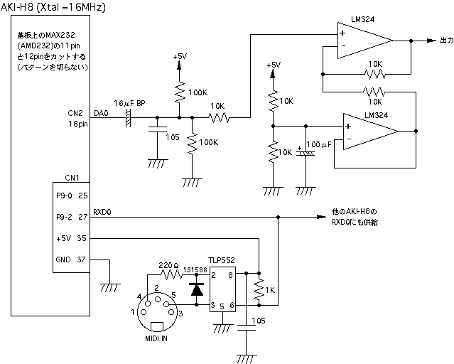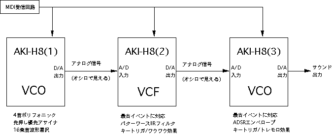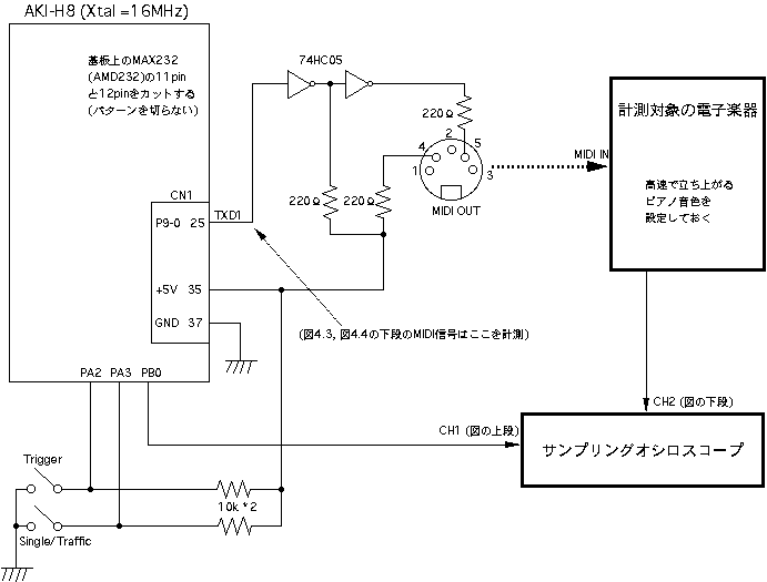 本章では、「ハイブリッドシンセサイザ」と呼ばれて一世を風靡した 「CPU制御のアナログ方式電子楽器」の音源システムを実際に製作しながら 検討します。まず最初に、誤解の多いMIDIにまつわる遅延の「迷信」に ついての検証実験を行い、MIDIとサウンドエレクトロニクスとの関係に ついて考察します。そして、古典的な「アナログシンセサイザ」「トップ オクターブ方式」「サンプリングメモリ方式」などについて紹介し、 さらに「ポリフォニックとアサイナ」という重要なテーマを検討した上で、 AKI-H8をモジュールとして活用したハイブリッドシンセサイザ、という 具体的なシステムの製作実験に挑戦していきましょう。 ●「MIDI遅れの迷信と真実」の検証実験前章でAKI-H8によるシステム開発の実験をするなかで、すでにMIDIを扱って いますが、このMIDIについては、まだ多くの誤解と迷信があるようです。 図4.1 は、筆者がよく質問される「MIDIは遅れる」という迷信に関する、 技術的なポイントの解説です。ここではあまり詳細に検討する紙面がありま せんが、結論から言えば、「MIDIが遅れる」という事実のほとんど全ては 「MIDI音源システムのCPUソフトの動作」に起因しています。他の要因に ついては、時間的なオーダとして無視できるほどに小さいのです。そして 問題なのは、市販の電子楽器(音源モジュール)の場合には、この主要な 遅延原因の部分がメーカのノウハウ、というブラックボックスに入っていて、 カタログ等でも絶対に公開されていない、という点にあります。そこでまず、 図4-1 で「真実!」と記載された部分、つまり「MIDI音源の遅れ」 の実際の様子とオーダについて、検証実験を行ってみましょう。ここでは筆者 の計測条件を詳細に記述して、読者の皆さんが正確に追試を行えるように 心がけてみましたので、興味のある方は、それぞれお手元の電子楽器について 調べてみてはいかがでしょうか。 まず、実験の道具立てから始めます。パソコンのシーケンスソフトウェアで、 「分解能は4分音符を960ステップまで実現」などと言っているものがあります が、そもそもパソコンの時間精度はそれほど良くありませんので、これは まったく技術的には無意味なものです。そこで、今回の実験は、ハードとして 道具を用意する必要があります。 図4.2 は、この計測のための実験システム全体 の回路図です。ソフトウェアの走るAKI-H8を使用していますが、計測の本質 部分には、パソコンのようなソフトが介在していない、というのが重要な点です。 リスト4.1 は、この 図4.2 のAKI-H8に用意したソースプログラム、 リスト4.2 は AKI-H8にダウンロードするオブジェクトファイルです。これを用いることに より、読者の皆さんも同じ条件で追試できます。ここでは、ポートPA3のスイッチ (機械的にどちらかの状態に固定するスライドスイッチを使用して下さい) によって、 OFF状態:シングルトリガモード ON状態:トラフィックモード(後述)の二つの動作モードを設定します。そして、ポートPA2のスイッチ(ノンロック タイプのプッシュスイッチを使用して下さい)によって、ONした瞬間に、MIDI の9チャンネルでノートナンバ84のピッチ、ベロシティ127(最大)のONイベントを 送り、すぐさまそのOFFイベントを送り、その瞬間にポートPB0の信号をローから ハイに立ち上げて、しばらくするとローに立ち下げる、という動作をします。 つまり、このAKI-H8システムは、プッシュボタンの操作によってMIDIの発音 情報を出力するとともに、その「情報送出タイミング」という電気的信号を、 ソフトウェアでなくハード的に瞬時に発生している、というところがポイント となります。パソコンのシーケンスソフトでは、この基準タイミングの遅れと ばらつきの要因を排除できないのです。 図4.3 は、このシステムでモードを「シングルトリガモード」に設定しておいて、 トリガ用のプッシュスイッチを押した時の、AKI-H8のMIDI用シリアル出力端子 の信号を計測した様子です。上段のPB0のポート出力信号は、下段のMIDI信号 (通常はハイレベル)がごそごそと約2msecほど動いた(MIDI情報は5バイト ですので、320μsec * 5 = 1.6msec ほど)最後のあたりで信号が立ち上がって いるのが判ります。厳密に同時ではありませんが、この信号の立ち上がり部分 を「該当するMIDIイベントが発信された」基準タイミングとして使用します。 図4.4 は、このシステムでモードを「トラフィックモード」に設定しておいて、 トリガ用のプッシュスイッチを押した時の、AKI-H8のMIDI用シリアル出力端子 の信号を計測した様子です。上段のPB0のポート出力信号はまったく同じ条件で、 「該当するMIDIイベントが発信された」基準タイミングとなっていますが、 下段のMIDI信号ラインには、かなりの密度で他のMIDI情報も混在させています。 ただし、PB0のハード的信号は、MIDI出力ルーチン内で間違いなく、対応する イベントのMIDI情報を出力するようにしているところがポイント