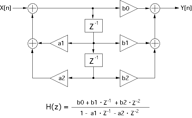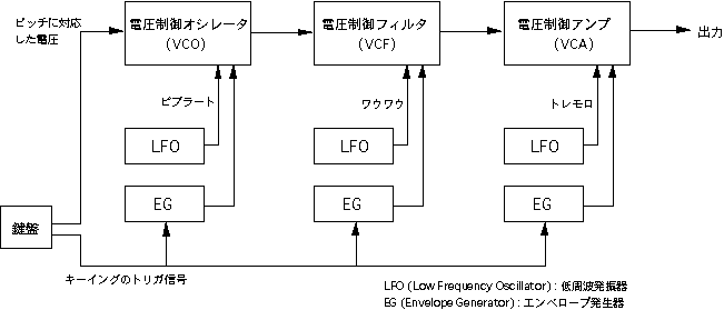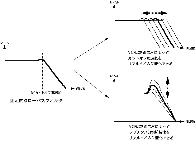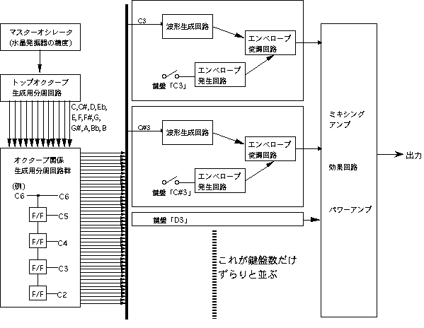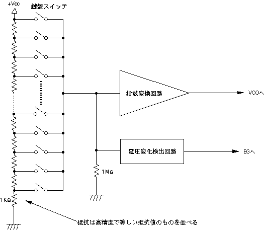 「PowerBook2400c」 この実験の紹介と結果については以上です。ここから得られる結論としては、 ・ハード音源とソフト音源では、1音目の発音遅延に10倍の違いがある ・多数のMIDI情報を受けた場合には、市販の電子楽器では発音遅延が大きく なり、さらに発音遅延のばらつきが非常に大きく、発音モレも起きてくる ・ソウトウェア音源では、多数のMIDI情報に対する反応がハード音源とは かなり異なっているようであるということになるでしょうか。メーカからは全て伏せられていることなのですが、 MIDIを活用するためには、このあたりは注意していく必要があるでしょう。 ●古典的アナログシンセサイザ本章のタイトル「ハイブリッドシンセサイザ」とは、アナログ方式と ディジタル方式を組み合わせたシンセサイザ、という意味です。その 歴史的にもっとも基本となる古典的なアナログシンセサイザとしては、 ムーグ博士の「ミニムーグ」という古典的名機が有名です。現在では、 とても高価なビンテージマシンとして、一部のマニアしか所有していない ものですが、これは 図4.22 のようなシステム構成をしています。まず最初に、演奏する人間(この当時は自動演奏するコンピュータは 存在してしませんでした)との接点として、鍵盤ブロックがあります。 ここでは、それぞれの鍵盤ごとに、そのピッチに対応した異なる制御電圧を 発生するのがもっとも重要な機能です。この時代のシンセサイザは「単音楽器」 で、鍵盤で和音を弾くことがなかったので、 図4.23 のように、単純に基準電圧を 等しい抵抗で分割した電圧を用意して、鍵盤ごとのスイッチでその中の一つ を選択する、という方式で十分でした。ただし、サウンドの周波数を音楽的 に見た場合には、周波数が2倍となるごとに「オクターブ」という等間隔に 並ぶ必要がありますので、等間隔の電圧から図のような指数変換回路を 経て、次段のVCOの制御電圧を作る必要があります。 [→章末コラム:音楽に用いるピッチと周波数の一覧] また鍵盤ブロックでは、この制御電圧とともに、「鍵盤のON/OFF」という 演奏情報も取り出して、次段のEGのための制御信号として出力しています。 なお、このような方式であれば、本章の最初で触れた「MIDI遅れの迷信と 真実」の検証実験のような、ON/OFF指定からの遅れというのは存在せず、 演奏者にとって快適なレスポンスが保証されています。 鍵盤からのピッチ制御電圧を受けるのが、電圧制御オシレータ(VCO)です。 ここでは、後段のVCFフィルタで豊富な音色変化を作るために、倍音を多く 含んだ、鋸歯状波、方形波、三角波などの波形を生成しています。 また、数Hz程度の超低周波オシレータ(LFO)の電圧も同時に与えること で、ピッチが細かく振動して、音楽的には「ビブラート」の効果を得る こともできます。LFOのスピードやデプス(かかり具合)なども、全て パネルに並んだボリュームでコントロールします。 そして、鍵盤のキーイングによって、同時にエンベロープジェネレータ (EG)もトリガして、音の立ち上がり時のピッチ変化をつけることもできます。 EGで生成するエンベロープは、既に第2章で紹介したADSRという形状の ものがもっともポピュラーです。 このVCOブロックについては、アナログ時代には ・ペアトランジスタによる指数変換回路 ・トランジスタやICによる電圧制御発振回路などの色々な方式が提案されてきたのですが、その後、もっとも早く ディジタル化(ハイブリッド化)されて、アナログVCOは早々に消えて しまう運命となりました。その理由は、人間の聴覚のうち、音量や音色に 比べて、音高(ピッチ)に対する分解能と精度はもっとも高精度であり、 アナログ回路に固有の誤差や変動によるピッチの「狂い」が、もっとも 耳障りとなったためです。そこで、本書では入手困難な特殊なトランジスタ を使用したアナログ回路に深入りすることは避けて、ピッチについては ディジタル方式で正確に実現することにします。 また、VCOの出力を受けて、次にあるのが電圧制御フィルタ(VCF)のブロック です。これは音の3要素では「音色」の制御を担当する、シンセサイザ の心臓部とも言えるブロックです。固定的なフィルタで音色の特性が変化する ことは既に述べてきましたが、アナログシンセサイザの場合には、 代表的なVCFの特性としては、 図4.24 のようになります。まず、ローパス フィルタの音色的効果の基本となる「カットオフ周波数」を、制御電圧に よって上下に移動することができます。これは、たとえばトランペット のような吹奏楽器の雰囲気には必須の要素で、うまくエンベロープを 作った制御電圧でこのカツトオフ周波数を動かすと、人間の話し声の ような雰囲気を作ることもできます。また、カットオフ周波数をLFOで 周期的に動かすと、ギターの古典的なエフェクトである「ワウワウ」の ような効果を実現できます。 また、フィルタのカットオフ周波数付近の共振特性を大きく持ち
