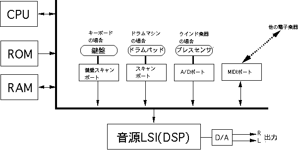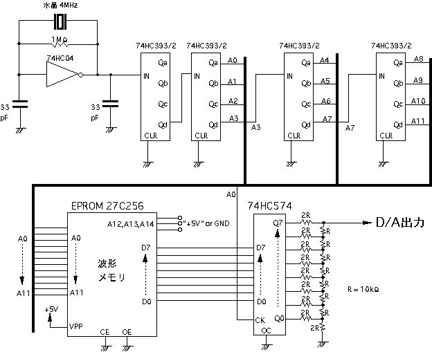 A6音を生成するための分周回路は、 図4.26 のようになります。かなり 複雑なようですが、要するに入力のマスタークロックに従って、3個の バイナリカウンタ74HC163による12ビットカウンタを構成して、その 最終段を出力としているものです。そして、コンパレータ74HC85には 12ビットバイナリの値として、データ「F89」よりも一つだけ小さい 「F88」が設定されています。これにより、ゼロからF88までのステップ を進んだところで、カウンタの出力とコンパレータの設定値とが一致 して、カウンタは再びゼロに戻る、ということで「F89進カウンタ」が 構成されます。同期カウンタ163を使っているので、一つだけ少なく なるというところがポイントです。 そこで、同じように「C7」音の回路(データとしてD0Fを設定)を 構成したのが 図4.27 であり、「E7」音(データはA5E)は 図4.28 の ようになります。つまり、回路図としてはそれぞれまったく同一構成 であり、コンパレータ74HC85の設定値として+5VにするかGNDにするか、 という部分だけを変更してやればいいのです。個々にICで製作すると 大変ですが、このような同一構成の回路を集積するのをもっとも得意 とするLSIの世界では、システムをLSI化する格好の題材とも言えます。 (なお、残りのトップオクターブのための回路設計については、興味 ある読者の皆さんの課題として、敢えて回路図を載せませんので、 どうぞ挑戦してみて下さい) さて、このようにして12音を生成してしまえば、あとは楽器としては 簡単なフィルタによる音色回路で音色を生成して、鍵盤ごとのスイッチ でON/OFFしてミキシング、というような流れとなります。 図4.29 は トップオクターブ方式による古典的な電子オルガンのシステム図で、 ここで設計したようなトップオクターブ12音生成用分周回路からの 出力を受けて、12音それぞれにオクターブずつ分周するフリップフロップ がずらりと並びます。そして、それらを組み合わせて音色を生成する ミキシングアンプ回路があり、その出力が鍵盤スイッチによって合成 されます。非常に多量の配線でジャングルのようになりますが、これで 鍵盤数だけの同時発音を実現することができます。 [→章末コラム:オルガンの音色生成の方法、CDROMの14トラック] また 図4.30 は、トップオクターブ方式による古典的な電子ピアノの システム図で、ここでは音色の生成のために、波形のデューティ比を 変化させたり微分回路や積分回路を利用しています。また、減衰音の エンベロープを生成するための簡単なトランジスタ放電回路が、鍵盤の 数だけ必要になり、鍵盤スイッチはこのエンベロープ回路をトリガする ことになります。これまた、鍵盤の下の基板にずらっと同じ回路が びっしり並ぶことになります。(実は筆者はこのシステムを、中学生の 時に一生懸命、製作したことがあります。トップオクターブはアナログ オシレータを12個並べた簡易型でしたが、多数のフリップフロップを 並べ、トランジスタによる超小型・立体配線のエンベロープ・ゲート 回路を61鍵分、並べました。当時のディジタルICは消費電流が大きく、 冬は動作させているだけで暖房になったものでした。(^_^;)) なお、このような回路方式であれば、多数(鍵盤数だけ全て)の発音を 実現するシステムであっても、本章の最初で触れた「MIDI遅れの迷信と 真実」の検証実験のような、ON/OFF指定からの遅れというのは存在 しません。逆に言えば自然楽器と同等に不自然な遅れのない、演奏者に とって自然で快適な発音レスポンスが保証されています。 ●サンプリングメモリ方式アナログ電子楽器の構成要素のうち、もっとも初期にディジタル化された のは、上記のトップオクターブ方式のような「ピッチ生成」の部分でした。 そして、VCFのフィルタ回路やVCAの可変アンプ回路は、さらにしばらく、 専用アナログICなどによって支えられながら、アナログの世界を保って いました。そして、次にディジタル化されたのは、「波形」の生成の部分 です。ここでは、マイコンとともに登場した「メモリLSI」がその主役と なり、技術的には「サンプリング」の手法によりサウンドを生成します。まず、簡単な例で見てみましょう。 図4.33 は、EPROM(紫外線消去可能 タイプの書き込み可能メモリ)の載った実験基板です。ここではEPROMに 27C256という、256Kビット(8bit * 32Kbytes)のものを使用して、 そのデータバス出力のところに、8ビットラッチ74HC574による、簡易型の D/Aコンバータを接続しています。この回路のEPROMのアドレスバスに対して、 図4.34 のような「水晶発振−多段カウンタ」回路を接続すると完成です。 ここでは既に、EPROMに リスト4.8 (インテルHEX形式)のデータが書き 込まれている、とします。このデータは、実はリスト4.9のような Cプログラム(このリストは一部を省略しています)によって自動生成 されたものです。 この例では、EPROMのアドレスのうち、下位12ビットが74HC393のカウンタ列 からの出力で順に