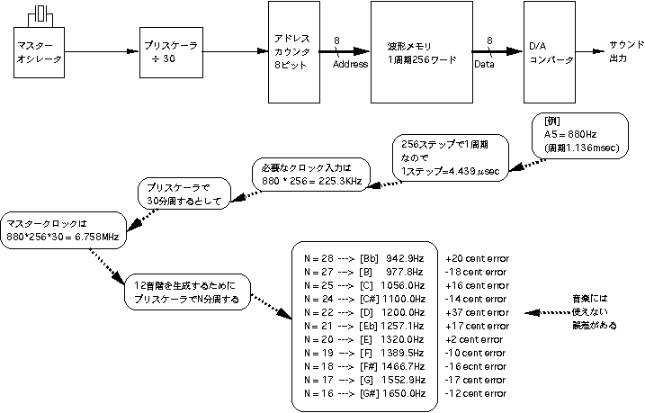(得られた周波数 − 目標周波数)/ 目標周波数 * 100として、0.120%という誤差の値となります。分周データは「切り捨て」を していますので、ここに1を足した値「E4」が、目標周波数よりもやや低い 周波数を得るための分周値となり、この誤差は、 (目標周波数 − 得られた周波数)/ 目標周波数 * 100として、0.319%になった、ということです。トップオクターブでは、この 誤差の小さい方の分周データを採用する、ということにすれば、この8ビット においては、もっとも周波数の誤差の大きいのは、