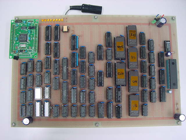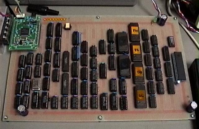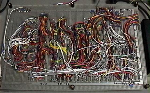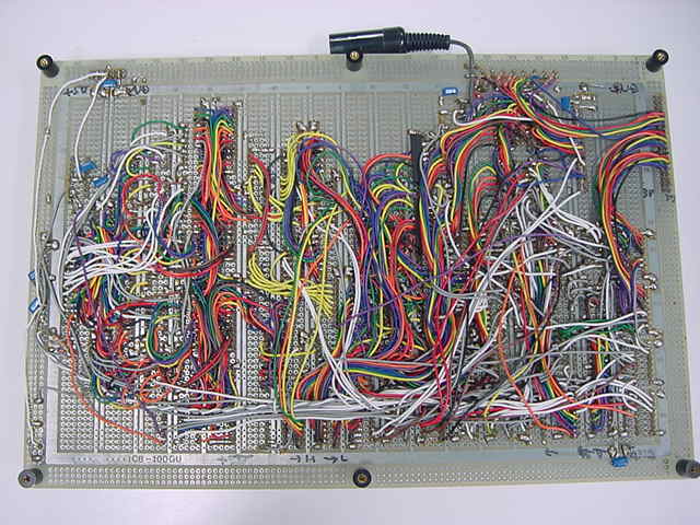 図5.20 ★ はその基板のアップです。左上にMIDI入力、発音割り当て等の動作を行う AKI-H8が載っています。縦に4つ並んだEPROMは、これで8×8=16ビットの乗算 を実行するEPROMです。その左に二つあるROMが、波形とエンベロープのROMで、 この写真の段階では、まだ暫定のデータしか入っていないので、窓にシール が貼ってありません(このソケットはレバー付きのもの)。 いちばん右が富士通の16ビットD/Aコンバータ、二つあるスリム28pinDIP がSRAMです。283を並べた、16ビット加算器、20ビット加算器もあります。 図5.21 は、本書では何度も登場している、基板上のAKI-H8に書き込むための、 自作フラッシュROMライタです。普段はスイッチングレギュレータ上に作った この基板にAKI-H8を挿すのですが、今回はいちいち抜き差ししないように、 ケーブルを作って延長しました。この状態で、オンボードでテスト書き込み、 テストランを繰り返すことができます。 図5.22 ★ は、システムの基板の、配線が終わってデバック途上の配線面です。 ここから、デバッグ段階でさらに数ヶ所の配線ミスを直し、さらにオシロ で調べることで数ヶ所の設計ミスを発見して配線変更などしましたが、 ほとんど当初の設計のまま、3日間の[デバッグ/AKI-H8ソフト開発/EPROM データ作成]の作業により無事に動作し、完成することができました。 かなりの配線量になりましたが、個々に確実にハンダ付けをしていけば、 本システムはごく普通の部品だけで構成でき、タイミング的に十分なマージン がありますので、誰が製作しても(正しく製作できれば)動作します。(^_^) なお、このシステムの全ての製作が終わってから気付いたことですが、うまく設計 を変更すると、システムの2個所にある、16ビットと20ビットのANDゲート列に ついては、省略することも可能のようです。ヒントとしては、出力イネーブル 端子が"L"に固定されているいくつかのラッチについて、出力ラインにプルダウン 抵抗を付けた上で、タイミングによってここをディセーブルする、ということで 強制ゼロクリアすることが可能だからです。Aラッチについては、上位と下位の 8ビット単位で別々にゼロクリアするためにこの機能を利用したのですが、その 発想を拡大すれば、このシステムの仕様に限った場合には、ANDゲート列による ゼロクリアを全て吸収できるようです(一般の音源ではANDゲート列に別の意味を 持たせることが多いのでちょっと無理)。興味のある読者は、この可能性に 挑戦してみると、タイミング設計のいい課題となるでしょう。 付録CDROMの第19トラックから第25トラックまでに入っている7本のサウンドは、 本システムのデフォルト音色/エンベロープの状態を立ち上げて、MIDI経由で 与えられた演奏情報を入力して鳴らしてみたサンプルです。途中でMIDIプログラム チェンジによって音色を切り替えてみたり、という演出はありますが、すべて 本書に書かれたままの裸の基板から出てきたサウンドです。ここでは敢えて、 図5.12(C) のD/Aコンバータの出力段にエイリアスノイズ除去フィルタを入れず に、折り返しノイズが出たままのサウンドを入れています(アナログフィルタ による音色の変化を加えないで評価するため)が、楽音の立ち上がり時の時間的 変化、エンベロープの推移、豊富な同時発音数とアサイナによる自然な発音状況 などが判ると思います。 ■おわりに■サウンドエレクトロニクスの世界について、具体的な製作実験を交えて、 その色々な「面白さ」を紹介してきました。サウンドというのは、人間の 感情に強く訴えるメディアでありながら、まだまだその「聴覚」の部分でも 研究途上の謎が多く、ましてサウンドから<音楽>をいかに「知覚」「認知」 するか、とか、そこからさらに「感情」が導かれるか、などという領域は、 ギリシャ時代以降、多くの専門家のアプローチをもってしても、まだまだ 解明されていない深遠な世界です。しかし、誰でもお気に入りの音楽を聴いて 楽しむことができ、知らなかった古い音楽や新しい音楽を聞いて新鮮な感動を 覚えることができます。本書をきっかけとして、エレクトロニクス技術や コンピュータ技術と、人間の感覚/感情や芸術の世界に広がる「サウンド」 の世界に興味をもっていただければ、筆者としてこれ以上の喜びはありません。 どうぞ、一緒にサウンドの世界を楽しんでいただければ、と思います。追記 : テキストデータとサウンドデータ(mp3)の提供について付録CDROMの販売も終了し、インターネットの太さも執筆当時に比べて飛躍的に太くなったので、 全てのテキストファイルをzipにまとめたものと、付録CDROMに収めたAIFFサウンドファイルをmp3化して zipにまとめたものを以下に置きました。 ご活用ください。(^_^)[コラム:コンピュータ音楽作品の実例]本書の付録CDROMの第2トラックから第25トラックまでは、本書の中で実験的に 製作したシステムを鳴らして録音したサウンドのサンプルが入っていますが、 
