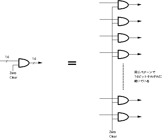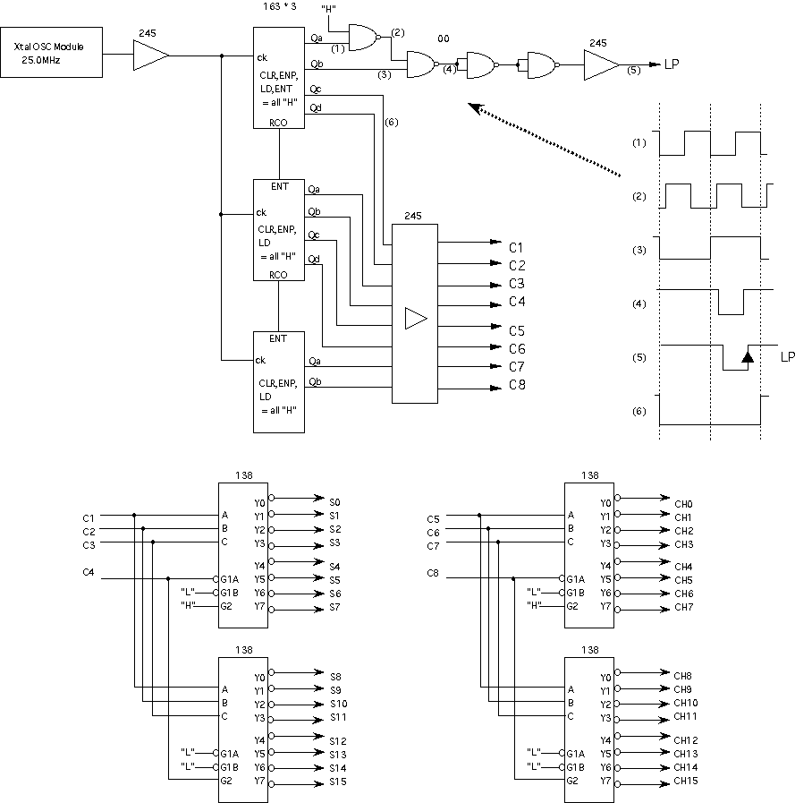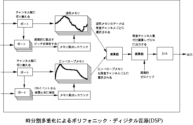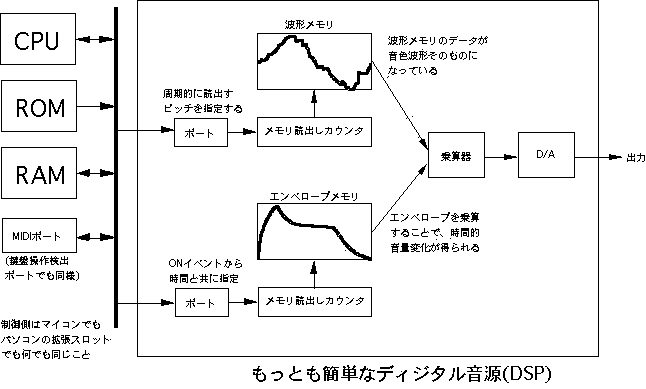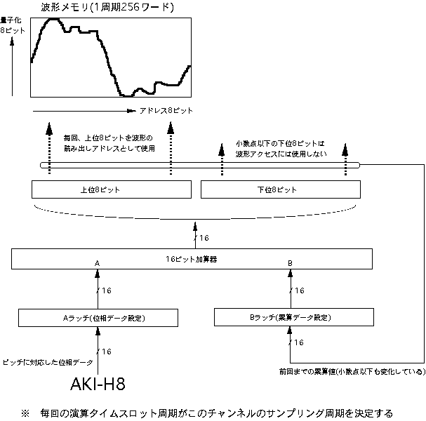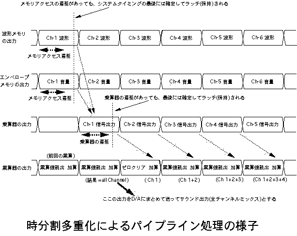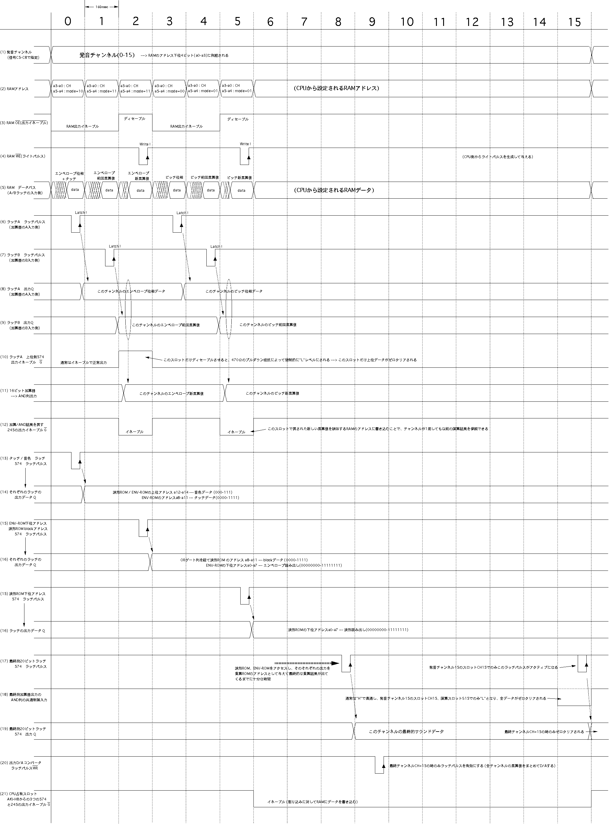 本章では、「ディジタルシンセサイザ」の製作実験に挑戦します。電子 楽器メーカなどでは専用LSI(ASIC)や信号処理専用のDSPチップという 手法で実現している、本格的なディジタル音源システムを理解するため に、ここではICとメモリのみを組み合わせてシステムを構築していきます。 ある程度の実用的な電子音源をフルディジタルで実現するには、たとえば 最低でも5万トランジスタ程度の回路規模が必要になります。また、 汎用ロジックICを多数使うようなシステムの製作では、PALやLCAやFPGAと 呼ばれる「プログラマブル・ロジック・デバイス」を使うことも一般的 です。しかし本書では敢えて「普通のデバイスだけを使う」という方針で、 これらの特殊なチップは使用しません。そこで、システムとしては最低限 の構成要素を押さえていますが、機能としてはだいぶ制限された音源に なりますので、この点は御了承下さい。 ●時分割パイプラインDSPシステムまず最初に必要となるのは、具体的な回路図などではなく、システムの 全体構想と全体設計というステップです。ここでは、まったく白紙の状態 から筆者が進めていった設計の流れを、詳細に追うことにしましょう。音源の楽音合成システムですが、ここではメモリを活用して、 図5.1 のように いわゆる「PCM方式」を正直にとることにします。この方式では本書でも既に 述べたように、時間的に変化しない定常的な音色となってしまう、と心配 されるかもしれませんが、音色の時間的変化も盛り込むテクニックを使用 します。ディジタルフィルタを汎用ロジックICで構成するのは大変ですので、 ここではフィルタはありません。 ただし、 図5.1 のシステムでは、たった1音、つまりモノフォニックの音源と なっていて、大規模な回路を組む割には成果が淋しいでしょう。そこで、 図5.2 のように、時分割多重化処理システムを構成して、同時発音数を多数 もった、ポリフォニック音源を目指します。 図5.2 では、乗算器や累算器 などのシステム要素は一つしかありませんが、同時に多数のチャンネルを もって、それぞれのチャンネルごとに別個のピッチ、音量、音色、エンベ ロープの発音を生成することができます。 この 図5.2 のシステムの動作の様子を、 図5.3 によって追いかけてみましょう。 この動作こそ、「パイプライン処理」の本質そのものです。パイプラインと いうのは、時分割多重化した機能ブロックが次々に縦列接続されていて、 タイムスロット(動作を時間的に分割した単位処理時間)ごとにそれぞれ 別個のデータが次段に流れて時分割多重化処理を受ける、というもので、 機能ブロックは1セットなのに同時に多重化された別個のデータを処理して いける、というものです。図では省略されていますが、実は各ブロックの 出力部分には、システムのタイミングでその出力を保持しておくラッチが あります。そして、タイムスロットごとに、各ブロックの出力は次の タイミングまで保持されて、次段の入力情報として利用されるようになって います。 最上段は、各発音チャンネルごとに切り替えられたピッチに対応したデータ によって、波形メモリから読み出された波形データの情報ラインです。 その次の段は、各発音チャンネルごとに切り替えられた時間的変化に対応して、 エンベロープメモリから読み出されたエンベロープ(音量)データの情報ライン です。これらは同じタイミングでアクセスされると、メモリによって結果が 出てくる時間(遅延時間)が異なりますが、タイムスロットとして規定された 処理時間の最後には確実に確定して、これがラッチされて後段に行きます。 この両者の結果を乗算するのは、3段目の乗算器の部分ですが、タイムスロット としては、一つ後ろにずれてきます。そして乗算器の遅延を吸収して、最後 にラッチされた乗算結果(この発音チャンネルのこの瞬間のサウンドデータ) は、最下段の累算機の次のタイムスロットに入力されます。 このように処理していると、全体としてあるチャンネルに注目すると、 最初の情報を与えてからずいぶん手間がかかると思うでしょうが、問題は それぞれの情報の別のタイミングの部分です。たとえば乗算器は、ある タイムスロットで1チャンネルの演算をすると、次のタイムスロットでは 2チャンネルの演算処理をしていて、遊んでいる暇がありません。図をよく 眺めると、全ての情報がびっしりと埋まっていて、多数のチャンネルの 情報処理をしているのですが、メモリも乗算器も累算器も、たった1セット しかありません。これが、「パイプライン処理」の真髄なのです。 このような概念をシステム構築の中核に据えて、具体的なシステム仕様を 検討していきます。電卓を片手に色々と検討した結果、ここでは、 ・マスターオシレータ25MHz ・演算タイムスロット160nsec ・チャンネル当たり16タイムスロット→チャンネル演算時間2.56μsec ・同時発音数16音 ・16チャンネル周期