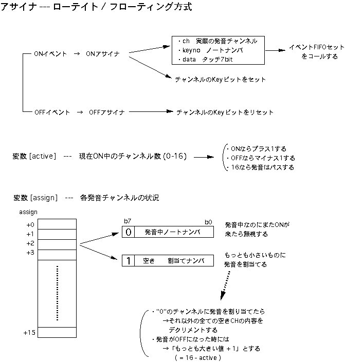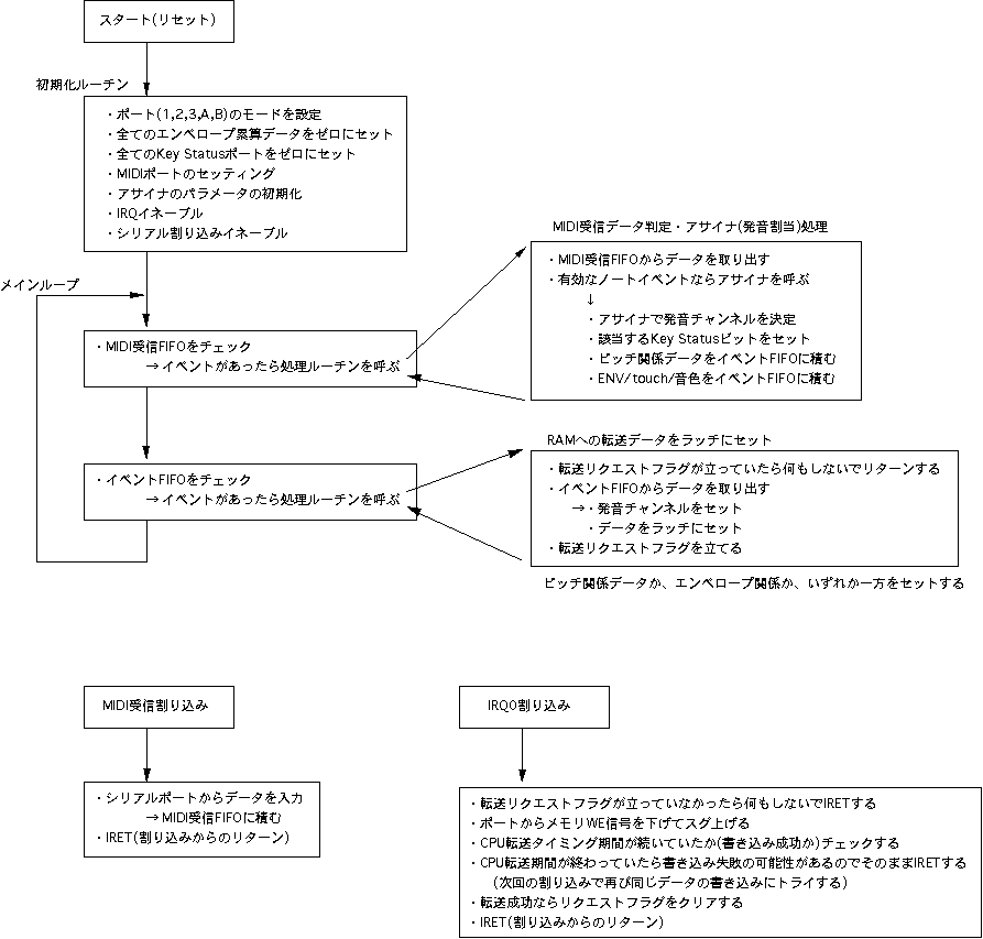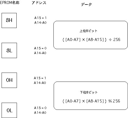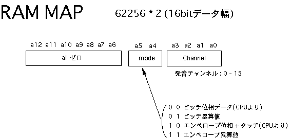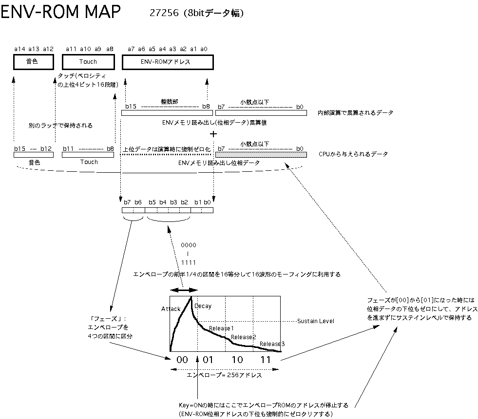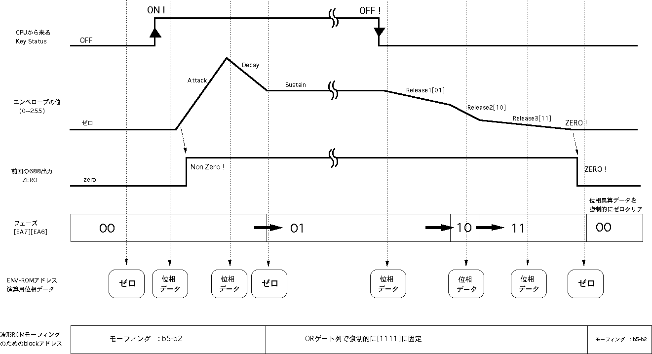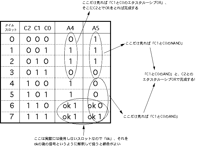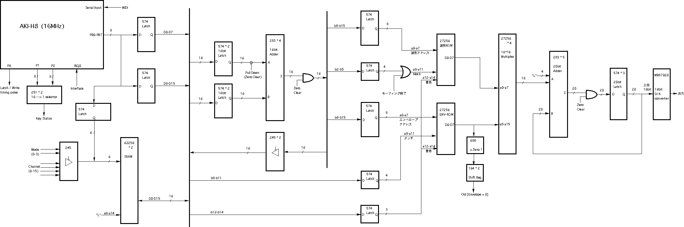 このように、1音色あたり256ワード(8ビット)を16ブロック(4ビット)、 ということにすると、もっともポピュラなEPROMの27256では、これが 全部で8セット(3ビット)、格納できることになります。そこで、 図5.11 のように、メモリアドレスの上位3ビットを「音色」として定義しました。 本システムでは簡易型のために、この音色指定の3ビットはエンベロープ の選択と共通となっていますが、別々に設定したい場合にも、簡単な 設計変更で対応することができます。 リスト5.5 は、本システムのために筆者がサンプルとして作成した波形ROM のデータを生成するCプログラム、 リスト5.6 はそのインテルHEX形式の 波形データファイル(これをROMライタで転送すればそのままROMが完成 する)の内容です。これは単なる一例でしかありませんから、読者の 皆さんはこれを参考にして、色々な波形のモーフィングを実験してみて 下さい。 分割されていますが、 図5.12(A) と 図5.12(B) と 図5.12(C) が、本システムの 全回路図です。 図5.4 の全体ブロック図と照らし合わせて確認してみて 下さい。使用するICは全て「74HC」タイプです(基本ゲートの番号は 省略:インバータは04、ANDは08、ORは32、EXORは86、NANDは00、4入力AND は21を使用し、配置の都合のいいゲートを適宜選んで配線する)。なお、 既に登場している 図5.6 のシステムクロック回路も、ここに加わって全体を 構成していることになります。このシステムクロック回路から全体に供給 される「LP」「C1-C8」「S0-S7」「CH0-CH15」の各信号とともに、回路図を またいで接続されているタイミング信号には、それぞれ固有の名前を 付けてありますので対応させて下さい。また、多数の信号ラインが相乗り する内部バスライン(RAMのデータバス、ラッチA/ラッチBの入力側などが 接続されたライン)と、波形ROM/ENV-ROMの二つについては、複数の回路図に またがる(両方の信号記述が同時に有効となる)点に注意して下さい。 図5.12(A) は制御側のAKI-H8とのインターフェースと各種のタイミング信号 生成部分です。ここでは、何度も登場しているAKI-H8のMIDI入力インター フェース回路、164と251と153を使った、エンベロープ生成に関係した 「ON/OFFイベント処理」関係のタイミング回路(後述)、割り込みによって ディジタルシステムとインターフェースする回路、システムパラメータを 保存するRAMなどがあります。タイミング設計の一例として、このRAMの アドレスA4とA5を供給する245の入力部分(4種類のゲートで構成)の設計 段階での作業を、 図5.13 によって紹介してみましょう。 この245を経由してRAMにアドレスが供給されるのは、 図5.9 の(21)の反転 信号ということですから、スロット0からスロット5までの6スロットだけ です。そして、タイムチャートの 図5.9 (2)と、RAMマップの 図5.10 より、 この時にA4とA5に設定したいアドレス信号は、 図5.13 のようになります。 そこでこのチャートをじっと眺めて、図のようにそれぞれの信号のロジック をとって、必要なタイミング信号を生成するわけです。 図5.12(B) はシステム前段のピッチ/エンベロープ生成のための位相累算部分 です。また 図5.12(C) はシステム後半の乗算・累算・D/A出力部分です。この 部分については、以下の項目のところでさらに説明していくことにしましょう。 ●ディジタルエンベロープジェネレータ本システムでは、 図5.4 のブロック図から判るように、波形とエンベロープは 同じ8ビット幅のROMに格納して読み出され、対等に8*8→16ビット乗算器により 演算されています。そして、いずれもシステム前段の加算−累算器によって、 小数点以下の「位相データ」をCPUから与える、というところまで同等にして います。しかし、ピッチの生成のための波形ROMとエンベロープ生成のための ENV-ROMとでは、そのアドレス読み出しの部分に決定的な違いがあります。ピッチの方は周期的に波形を読み出し続けていればいい、つまりアドレスが 累算によってオーバーフローすれば勝手に繰り返してくれるのに対して、 エンベロープは繰り返しては困ります。ある楽音のON(MIDIの概念に対応 させて、ここでは「Key ON」と呼ぶ)とOFF(Key OFF)に対応して、全体 をたった1度だけ読み出して「終了」しなければなりません。また、Key ON に対応してエンベロープが進行していった段階で、「サステインレベル」 で止まったままKey OFFを待たなければならないのです。そしてKey OFFを 受けたらオシマイではなくて、ここからエンベロープは後半の「リリース」 の信号を生成していきます。この意味で、波形の部分とは違った機構を 設計しなければなりません。 図5.14 は、本システムのENV-ROMのマップと、エンベロープの「フェーズ」の 概念を示したものです。最上段の15ビットアドレスがENV-ROMのデータの内容 で、下位8ビット(256ワード)で1種類のエンベローブを指定するのは、 波形ROMと同様です。この上に4ビットの「タッチ」指定アドレスがあり、 16段階でそれぞれの楽音の音量を個別に指定しま