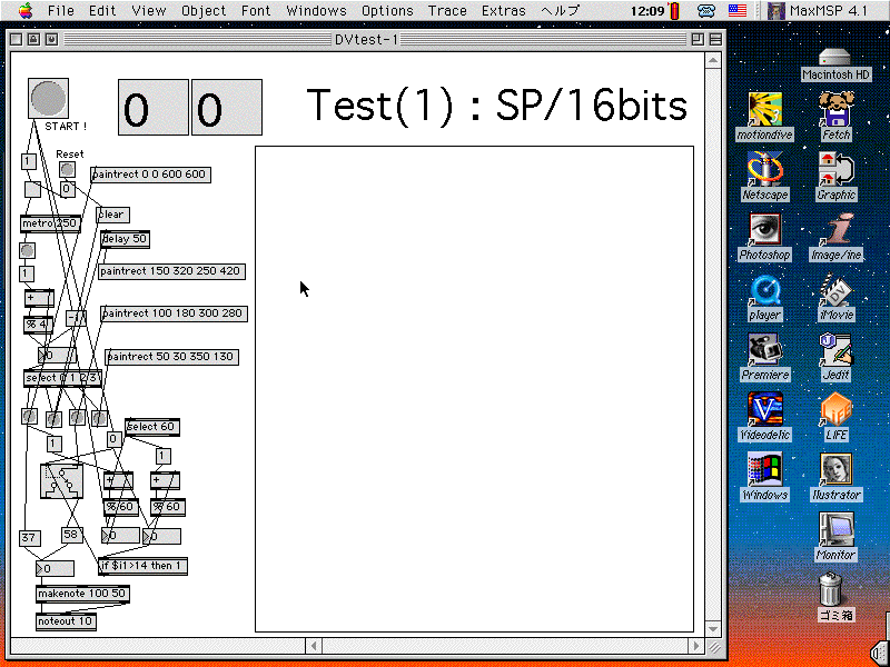 小林さんの書かれたように、これはとんでもなくヘヴィーな話題だったようですが、 せっかくですので徹底的に調べてみることにしました。(^_^;) まずはいくつかの質問に対する回答です。 小林さん: >一番問題を引き起こしがちなのはアンチウィルス系のソフトですが、 >そうしたものはお使いですか? この編集マシンはネットにも繋がないので、使っていませんでした。 >問題を切り分けていくためには、これらのどの段階でおかしくなったのかという >情報が非常に重要です。もし、途中の段階も残していらっしゃるのであれば、ご >面倒でも確認されると良いと思います。 既に各作家から受け取ったDVテープはIC会議の時にそれぞれの担当教員に返却してしまい、手元にありません。 それぞれのDVからキャプチャしたムービーはありますが、元々、映像にBGMが入るようなタイプの作品では、 作家本人でなければ、同期ずれというのはなかなか気付かないものだと痛感しました。 そこで、今回、気合いを入れてちゃんとした実験用の、時間ずれが明確に判るDVテープから作成して 実験することにしました。 ただし、今回のMAF2003のDVD作成作業が完了したあとで、購入していたMacOS10.3(Panther)に アップグレードしてしまったので、完全な再現実験は不可能となっています。FCP4.1はダウンロード しただけで、まだインストールしていない状態です。 >・Final Cut Proで取り込みをされる際、テープに対してイン点とアウト点を指 >定した上で取り込みをされましたか?それとも、「今取り込む」で取り込みをさ >れましたか?「今取り込む」でテープのど頭の不安定な部分から取り込んだりす >ると、良くないことが起きるかもしれません。 「今取り込む」ですが、ド頭の部分は避けて、DV出力が安定するだけ待って取り込みました。 >・Final Cut Proのプロジェクトのオーディオサンプリングレートと、DVのサン >プリングレートは同じでしたか?通常、48kHzが標準的に使われていることと思 >いますが、ここに32kHzのクリップが入ったりすると、サンプリングレート変換 >の誤差でずれてしまうことがあるかもしれません。 これをまず、今回、実験してみようと思いました。 >・Final Cut Proからムービーを書き出す際、「Final Cut Proムービー」で書き >出されましたか?もしそうだとして、その際「独立再生形式で保存」をチェック >されましたか?独立再生形式でない場合には、再生時に諸々のファイルを組み合 >わせて再生することになりますので、トラブルの原因になるかもしれません。 >Final Cut Proムービー形式であれば独立再生形式、QuickTimeムービー形式であ >ればDVコーデックの48kHzオーディオにして、「定着」させるのが安心かと思い >ます。 「QuickTimeムービー形式」の独立再生形式、defaultのままで書き出しました。 >iMovieに関する公式な情報はこちらですが、 iMovieはまったく使っていない(今後も使わない)ので、今回は問題としては切り離します。 杉山先生: >うちの場合ですが、DV->DVDについて、経験的に ですが、 >(1)の取り込みの段階でもう音と映像が合っていないことが多いです。 >(2)は今までこちらでは音ずれの経験はありません。 ・・・ >あと、撮影時に、音ずれに関して注意していることは、 >音声は16bitで録音する、LPモードにしないぐらいですね。 >12bitで録音した方のものがよく音ずれを起こします。 >LPモードは音ずれとはあまり関係ないかも知れません。 これを受けて、とりあえず実験として、DVの記録を ・SPモードとLPモードの2種類 ・音声は16ビットと12ビットの2種類 という、計4種類を作成して、まずはキャプチャしてみました。 これは後述します。 中村先生: >http://www.macdtv.com/fcp/fcplab_audiogap.html >の、コマ落ちのチェック、自動同期の設定、あたりは >チェック済みでしょうか。 コマ落ちすると警告するようになっていましたが、作業中はこれは出ませんでした。 自動同期についてはdefaultのままです。 ■検証実験(1)■ ずれている事がハッキリ客観的にわかり、十分な長さのムービーがまず必要だ、ということで、以下のように 4種類のDVテープを作成しました。 (1)G3PowerBookのS-video出力とオーディオ出力をSony DVビデオカメラをデッキモード(電源はバッテリで なくACアダプタ)で録画してDVテープ化した。 (2)ムービーはこのようなMaxの画面を使った。Maxパッチ(テキスト形式)はこれ。 (3)画面は250msecごとに塗りつぶしアニメーションが進み、4拍子、つまり1秒ごとに真っ黒→クリアと明確に タイミングが判る。同時にQuickTime音源のリムショット音が1秒ごとに同時に鳴るので、ずれてくるとスグに判る。 (4)同期してディジタル時計が表示され、15分が経過すると別のパーカッションが裏拍で加わって録画終了。 (5)この、前後を入れて15分30秒ほどのムービーを、DVビデオカメラの録画モードの設定で、 ・SPモード、音声16ビット ・SPモード、音声12ビット ・LPモード、音声16ビット ・LPモード、音声12ビット の4種類としてそれぞれ録画した、4種類